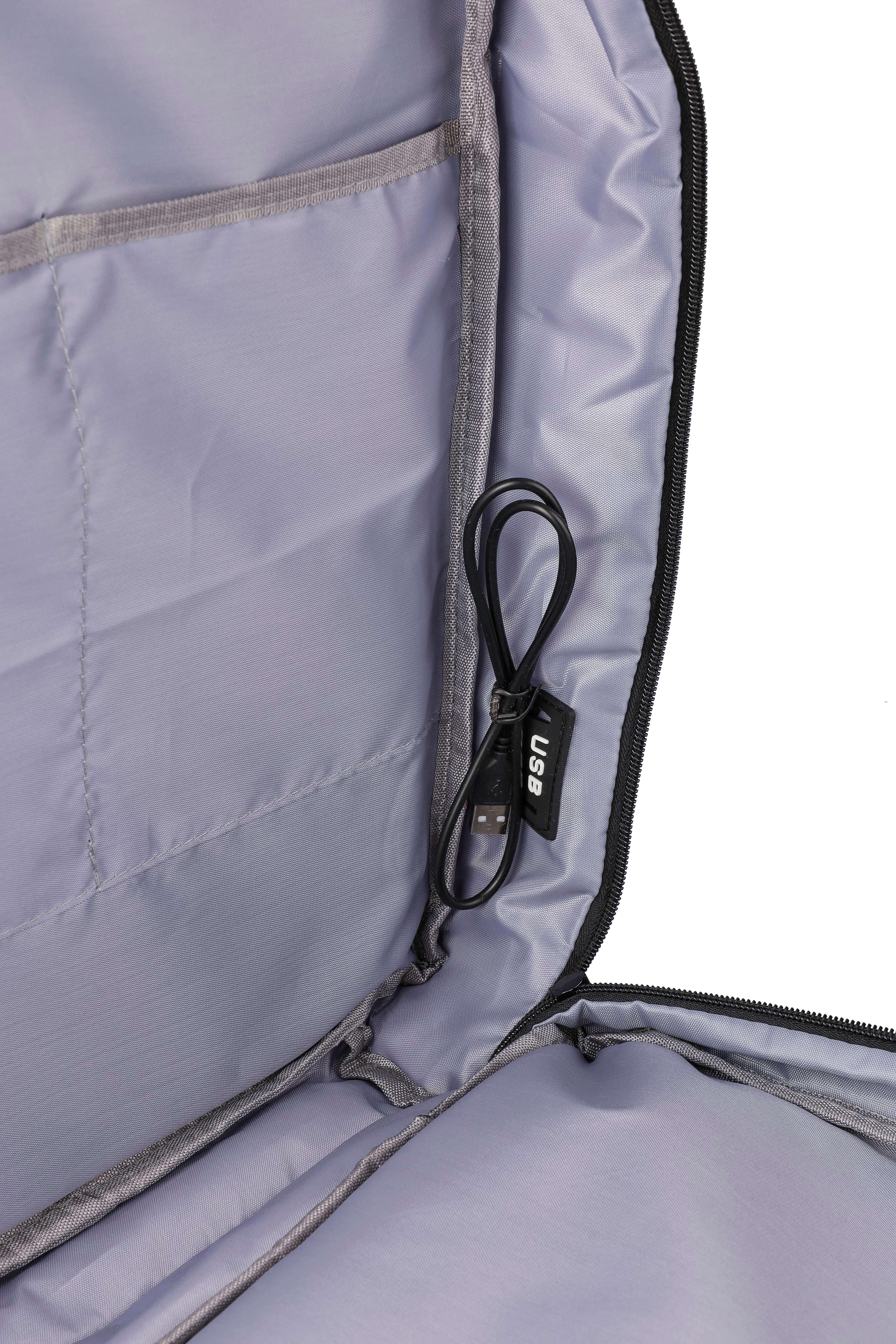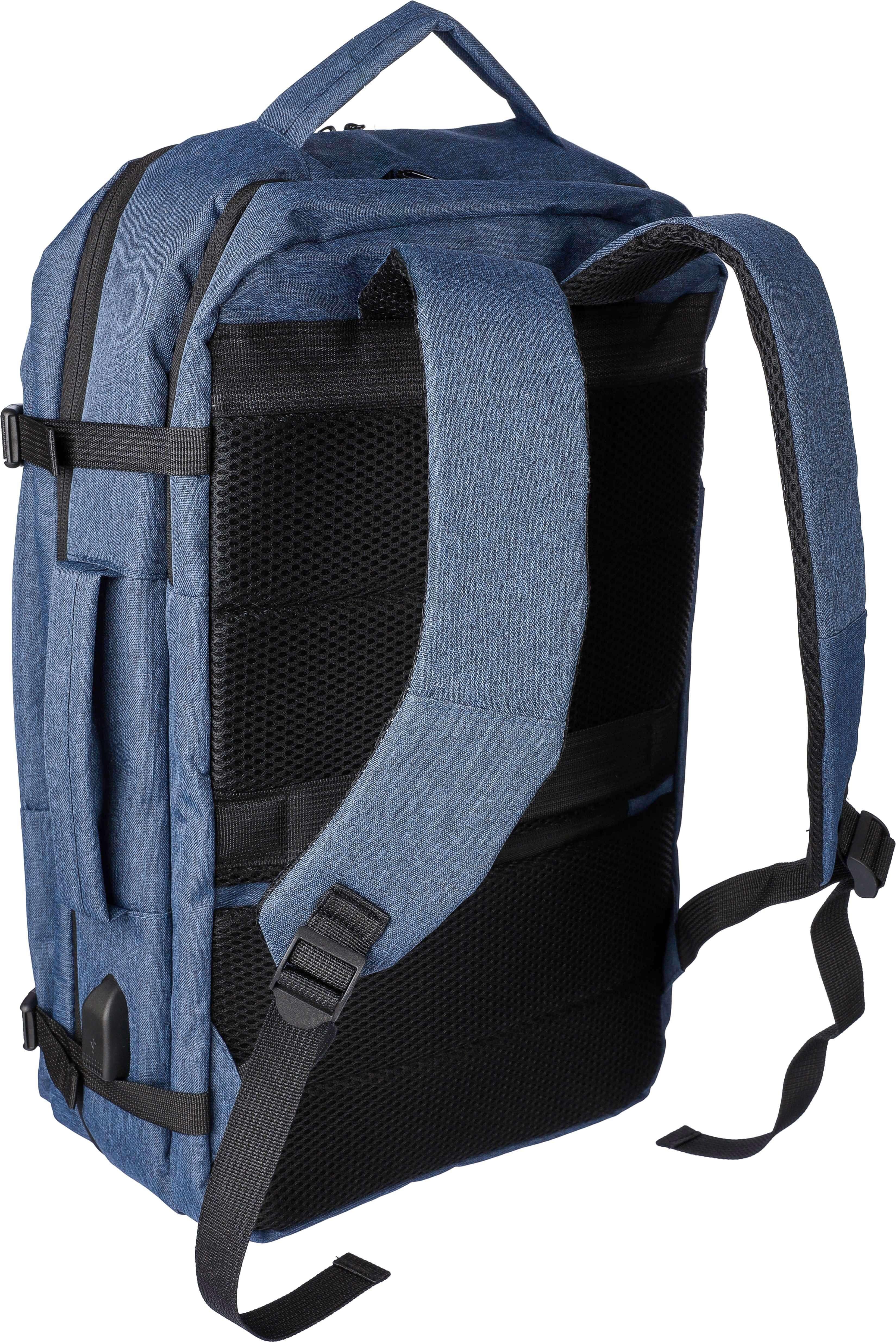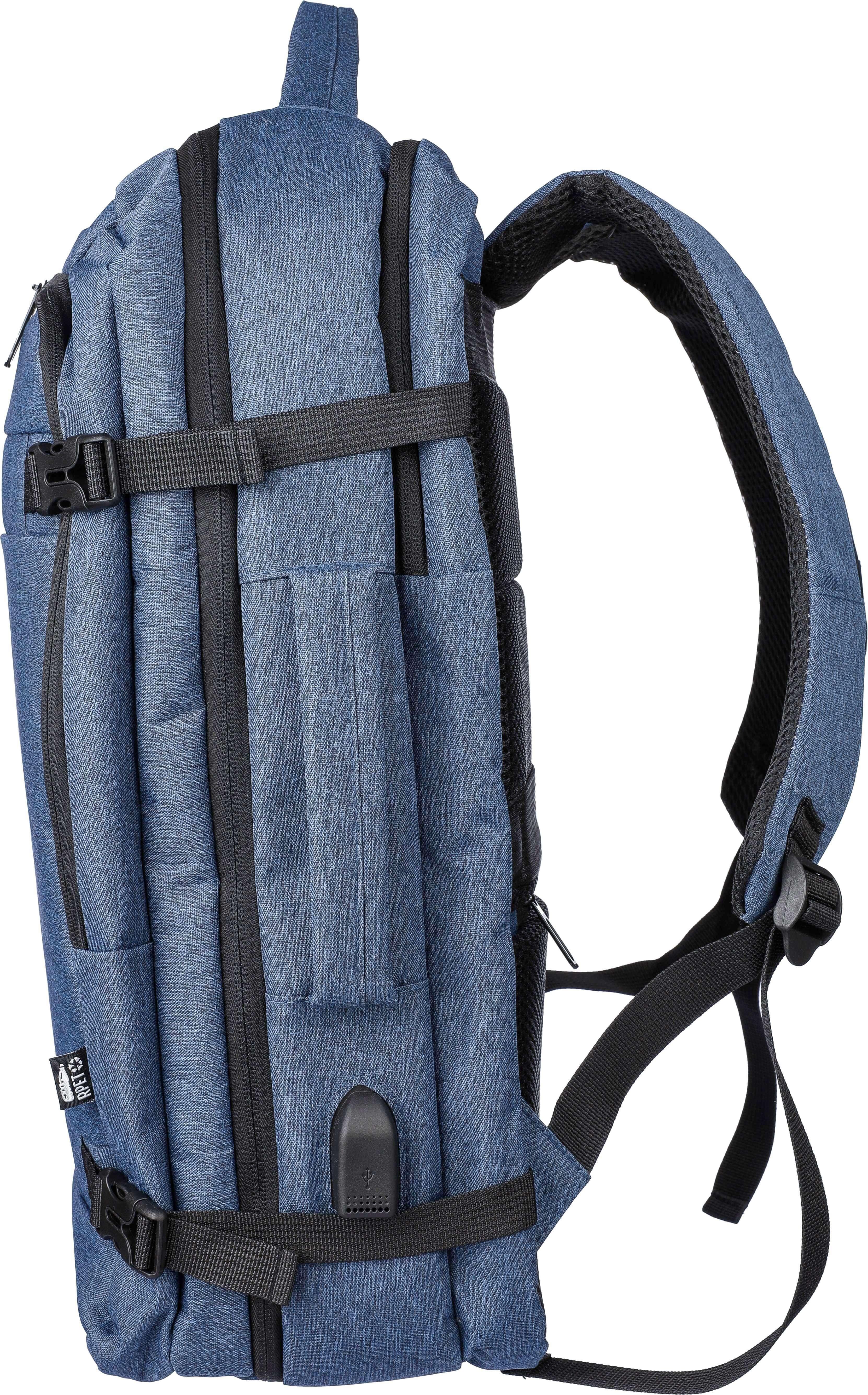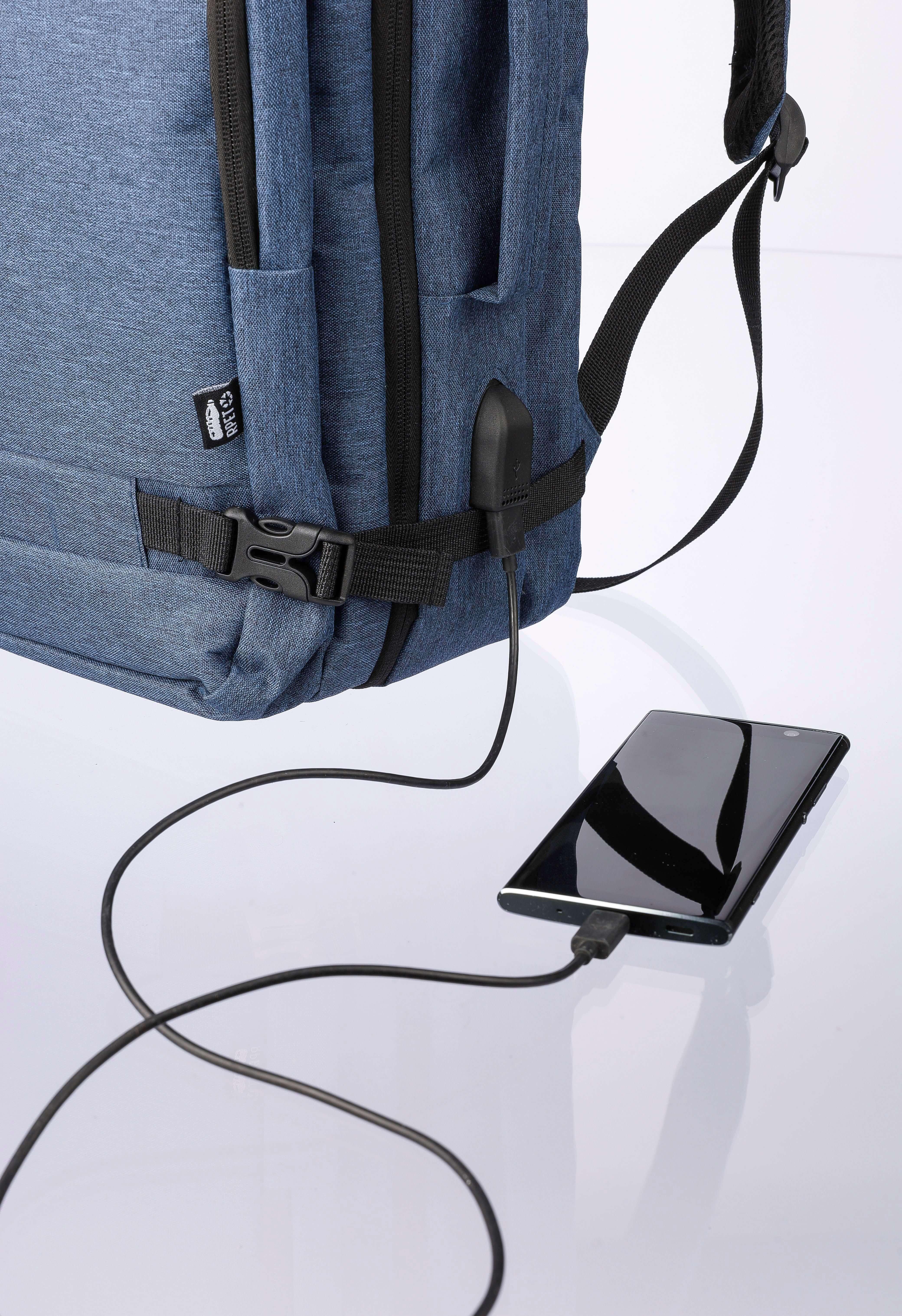 Mochila para portátil (17 polegadas) em poliéster rPET (300D) com forro interior 210D. Ideal para cabinas. Com alça de transporte no topo e nos lados. Compartimento para portátil com velcro, bolso antirroubo e dois compartimentos grandes com fecho de correr. Parte traseira almofadada e ventilada, alça para trolley, fivelas de fecho e porta USB-A na parte lateral. Com fivelas laterais para manter a bagagem compacta. Peso de transporte de cerca de 12 kg. Inclui etiqueta rPET.