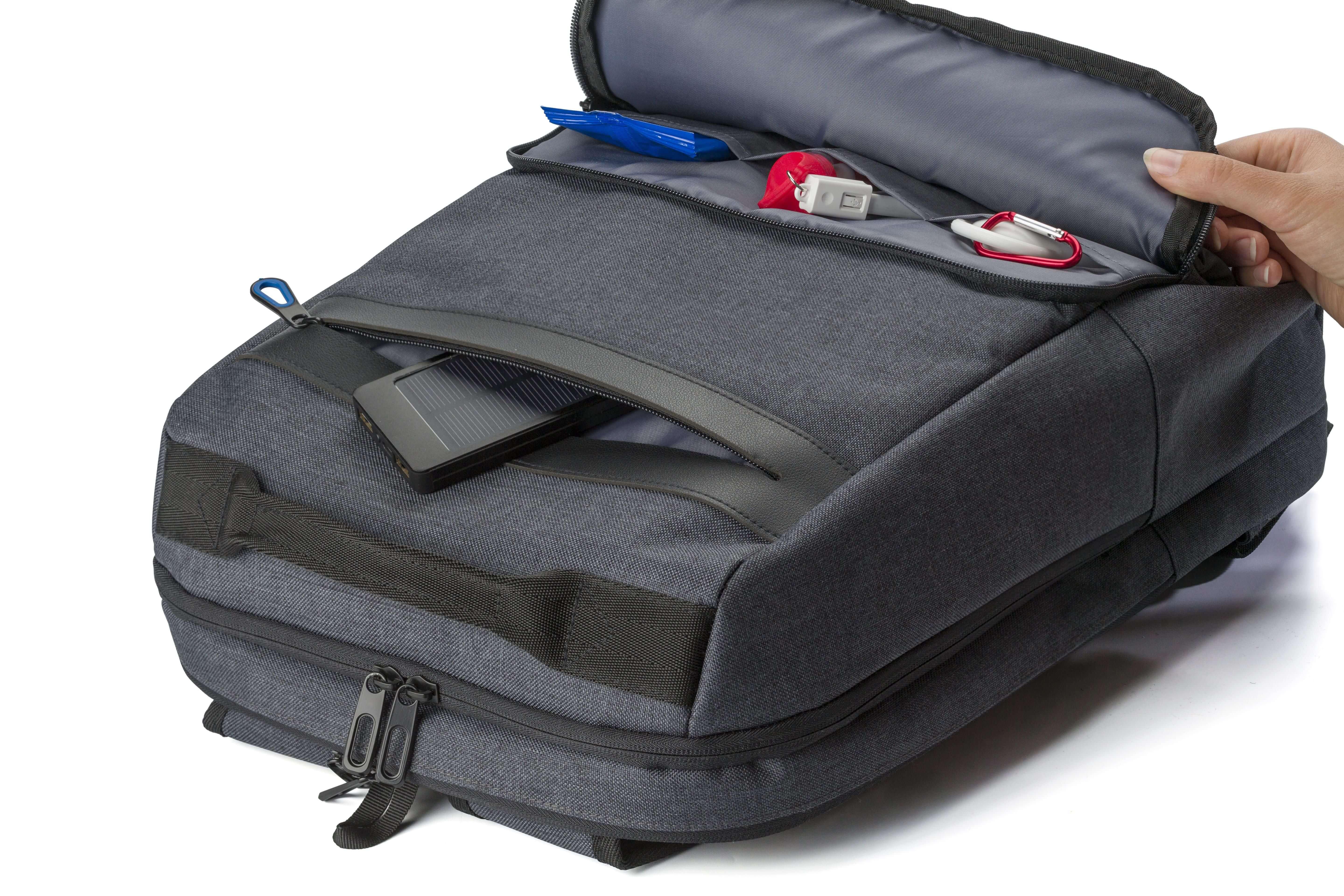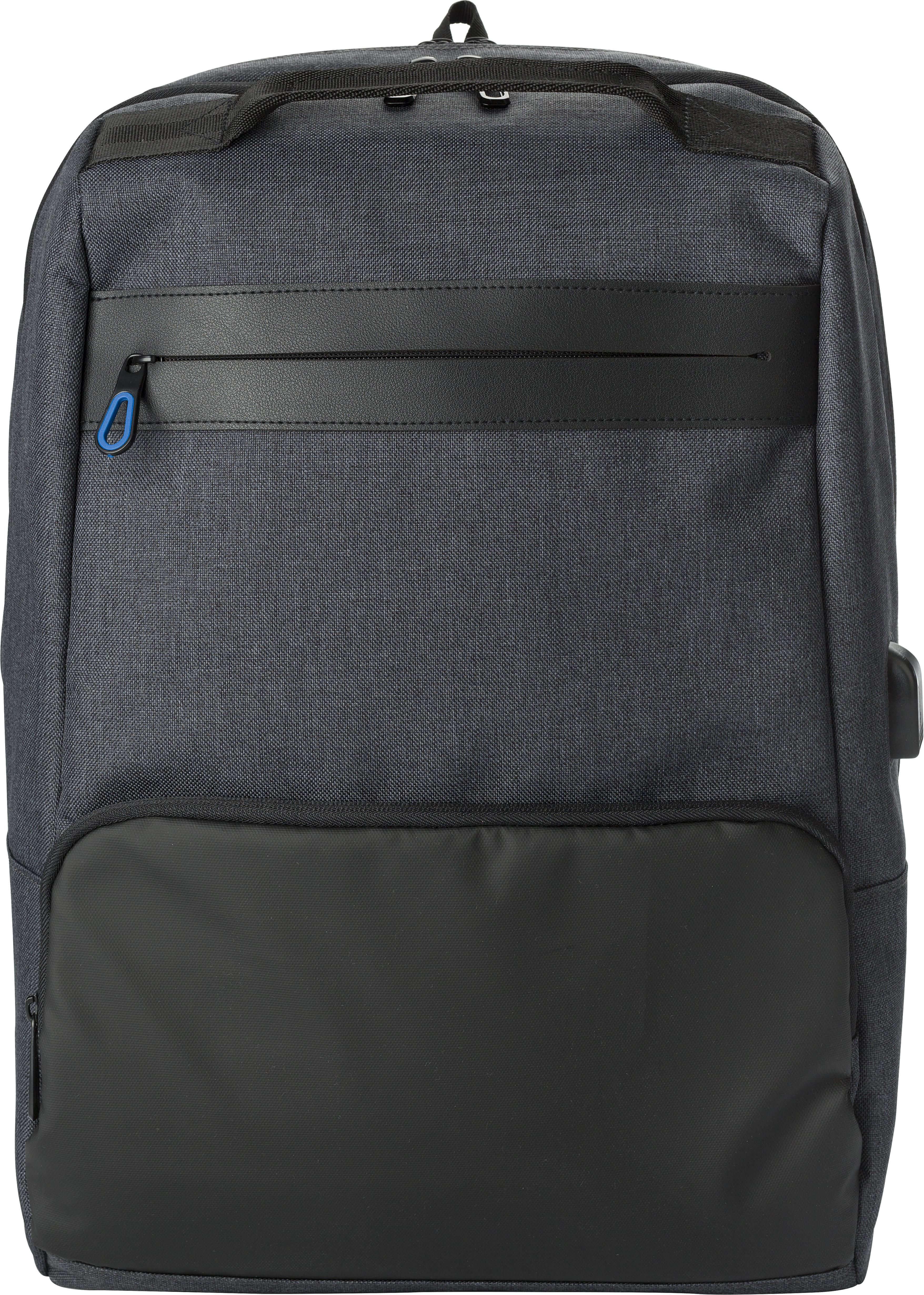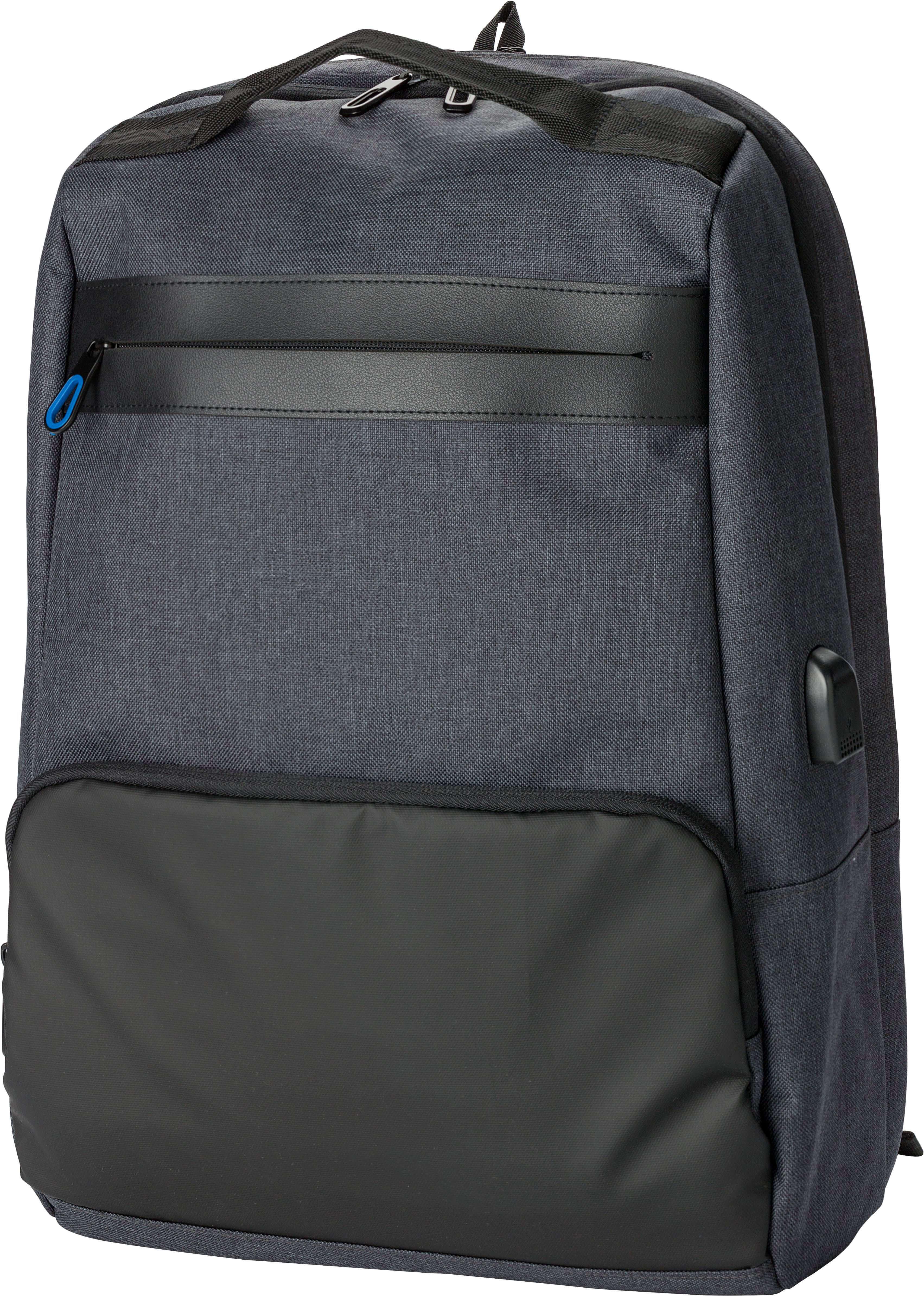 Mochila em PVC com dois compartimentos principais, um deles adequado para computador portátil (15 polegadas). A mochila tem bolso atrás antirroubo e dois bolsos com fecho à frente. Com correias de ombro acolchoadas ajustáveis.