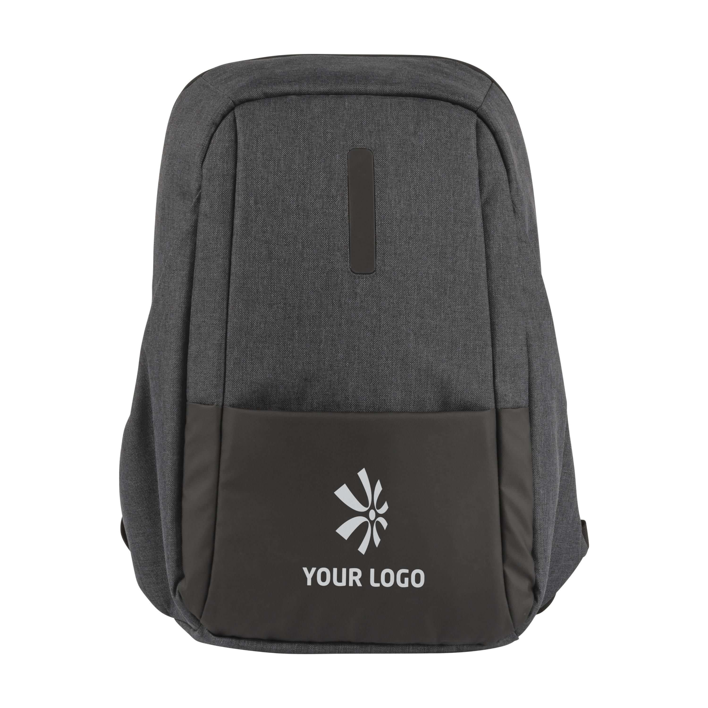 Mochila para computador portátil (15 polegadas)em PVC. O compartimento principal tem um bolso acolchoado para computador portátil, bolsos interiores e um bolso com fecho à frente. A mochila tem duas correias de ombro ajustáveis e uma pega.