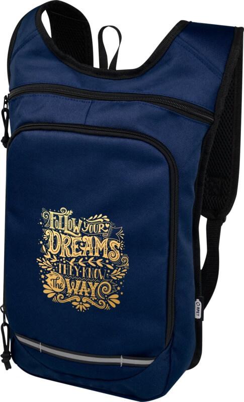 Feita de tecido 100% GRS reciclado e repelente de água, a mochila “Trails” possui um bolso frontal com fecho e um compartimento principal com fecho, e é compatível com um recipiente de água para hidratação. Listras refletoras para visibilidade e parte traseira em malha para conforto de transporte, tornando-a numa ótima escolha sustentável para atividades ao ar livre.