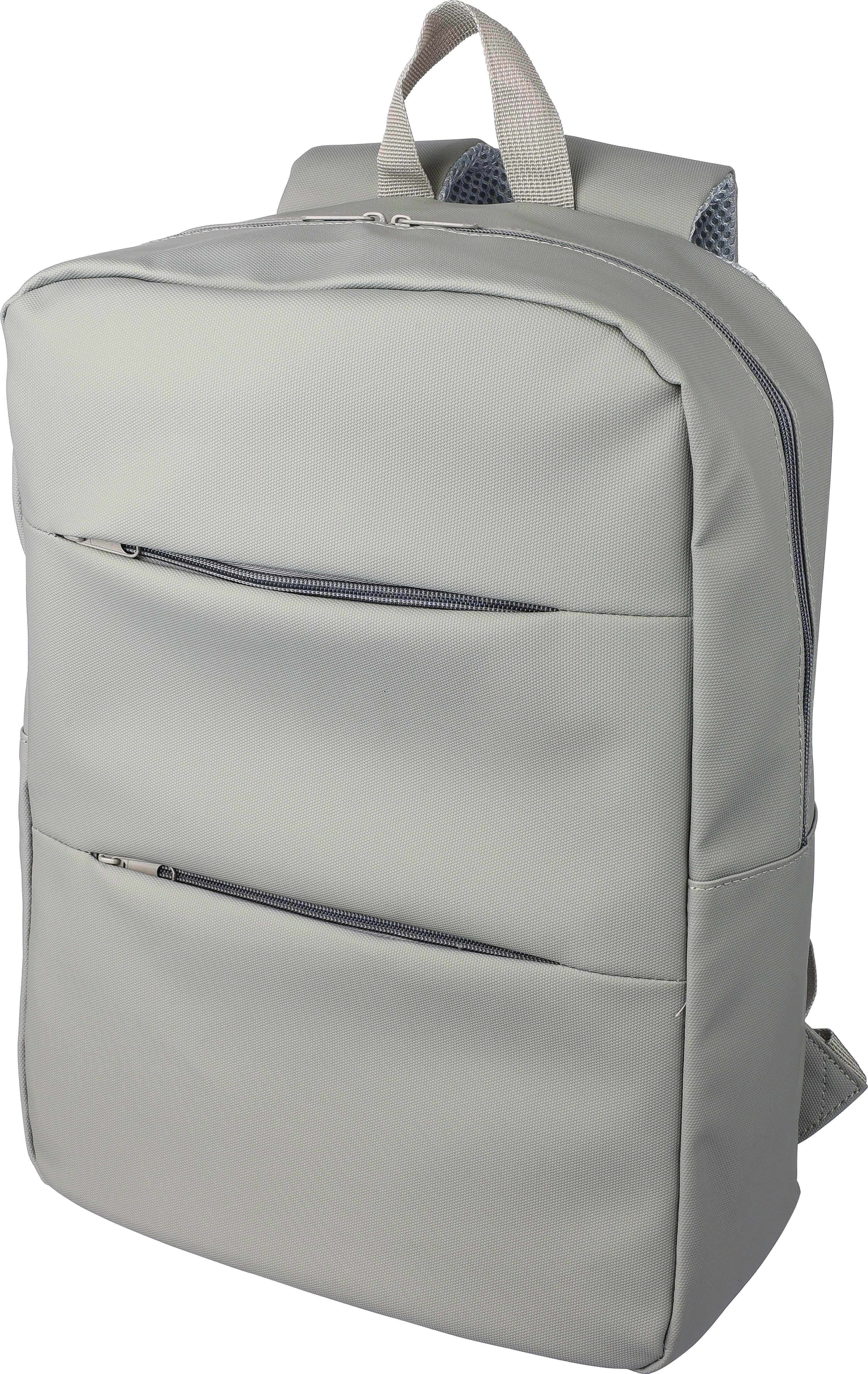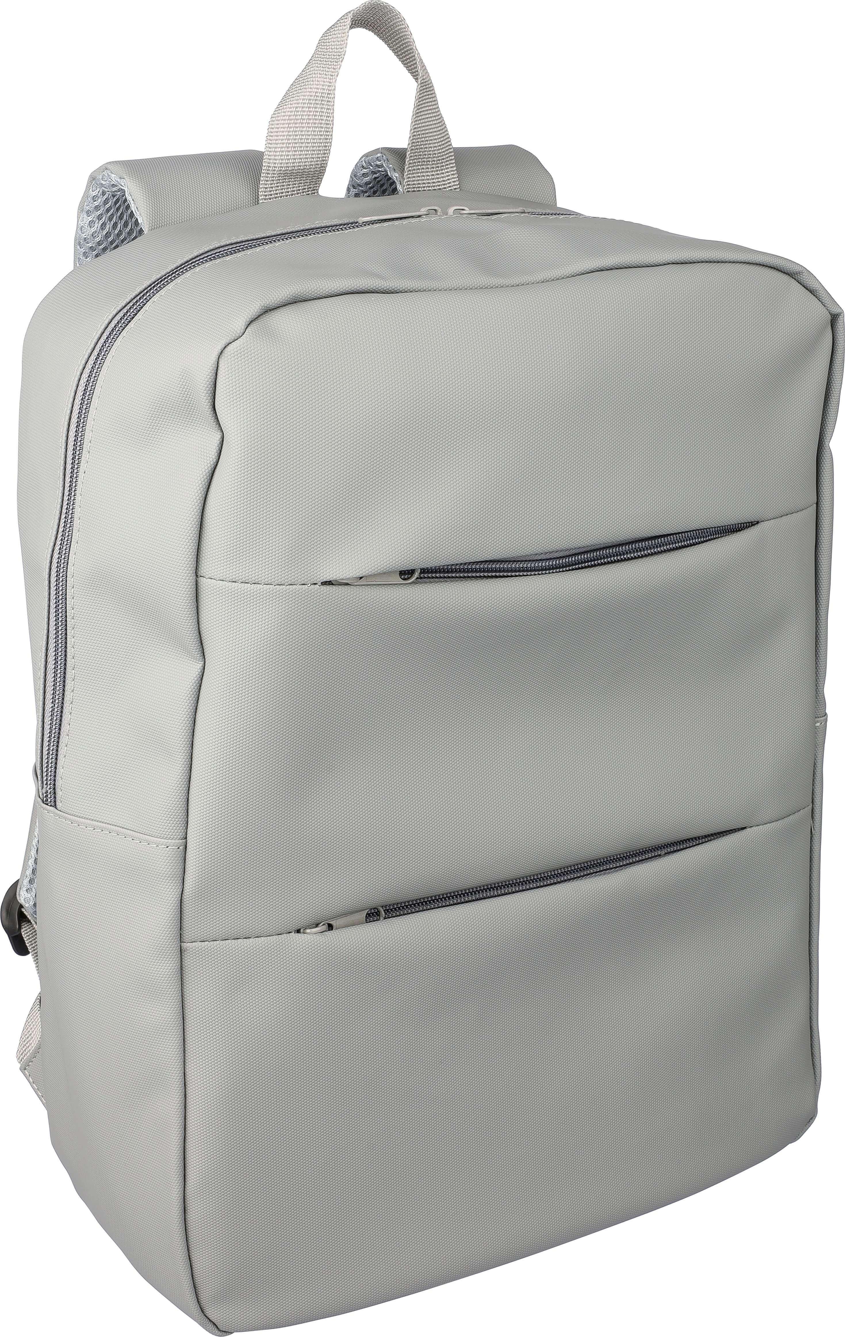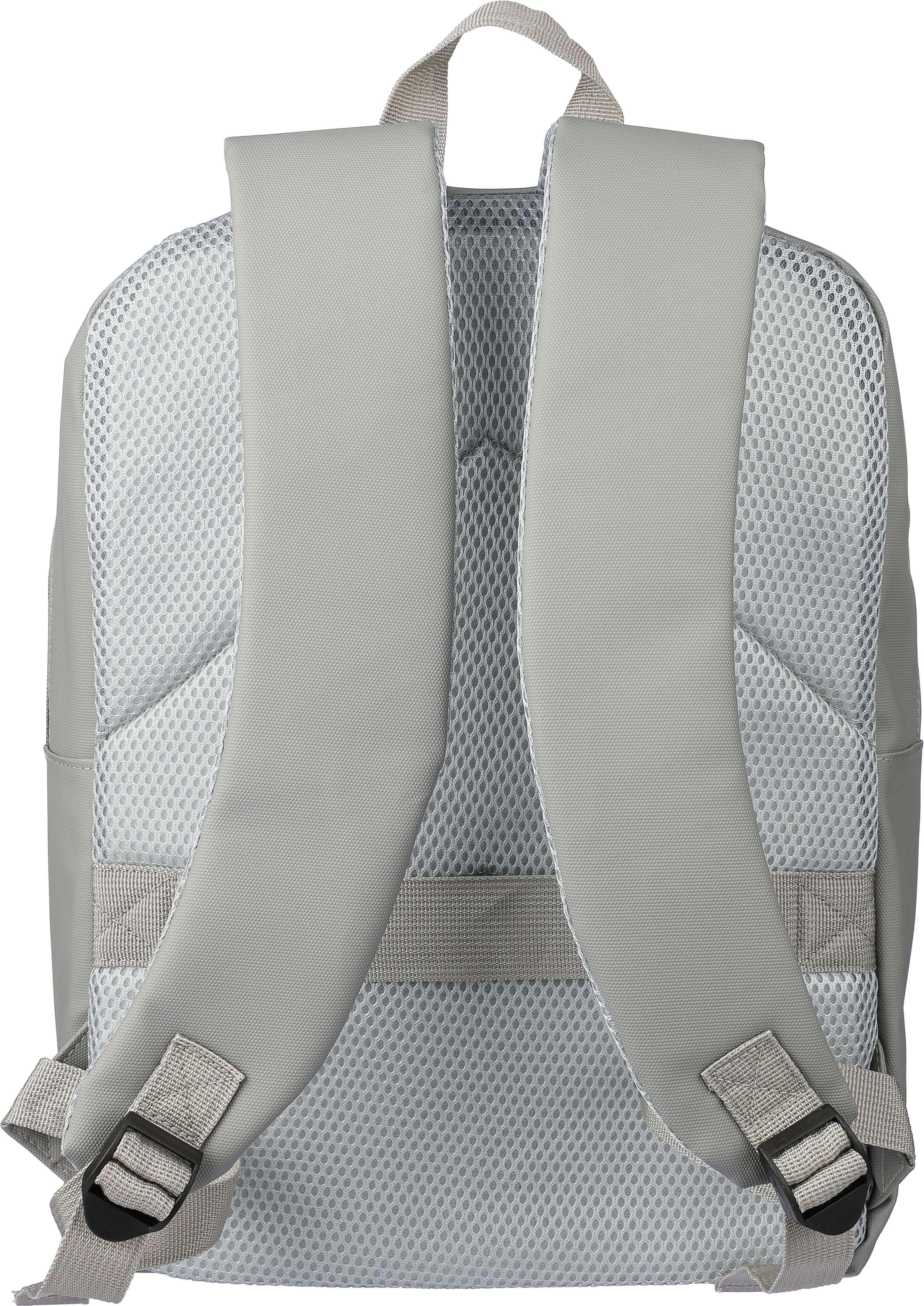 Mochila para portátil em PU (15 polegadas) com dois bolsos frontais com fecho de correr, um grande compartimento com fecho de correr com uma secção para portátil com fecho de velcro e várias inserções no interior. Parte traseira almofadada e ventilada com alça para trolley e alças de ombro ajustáveis. Impermeável.