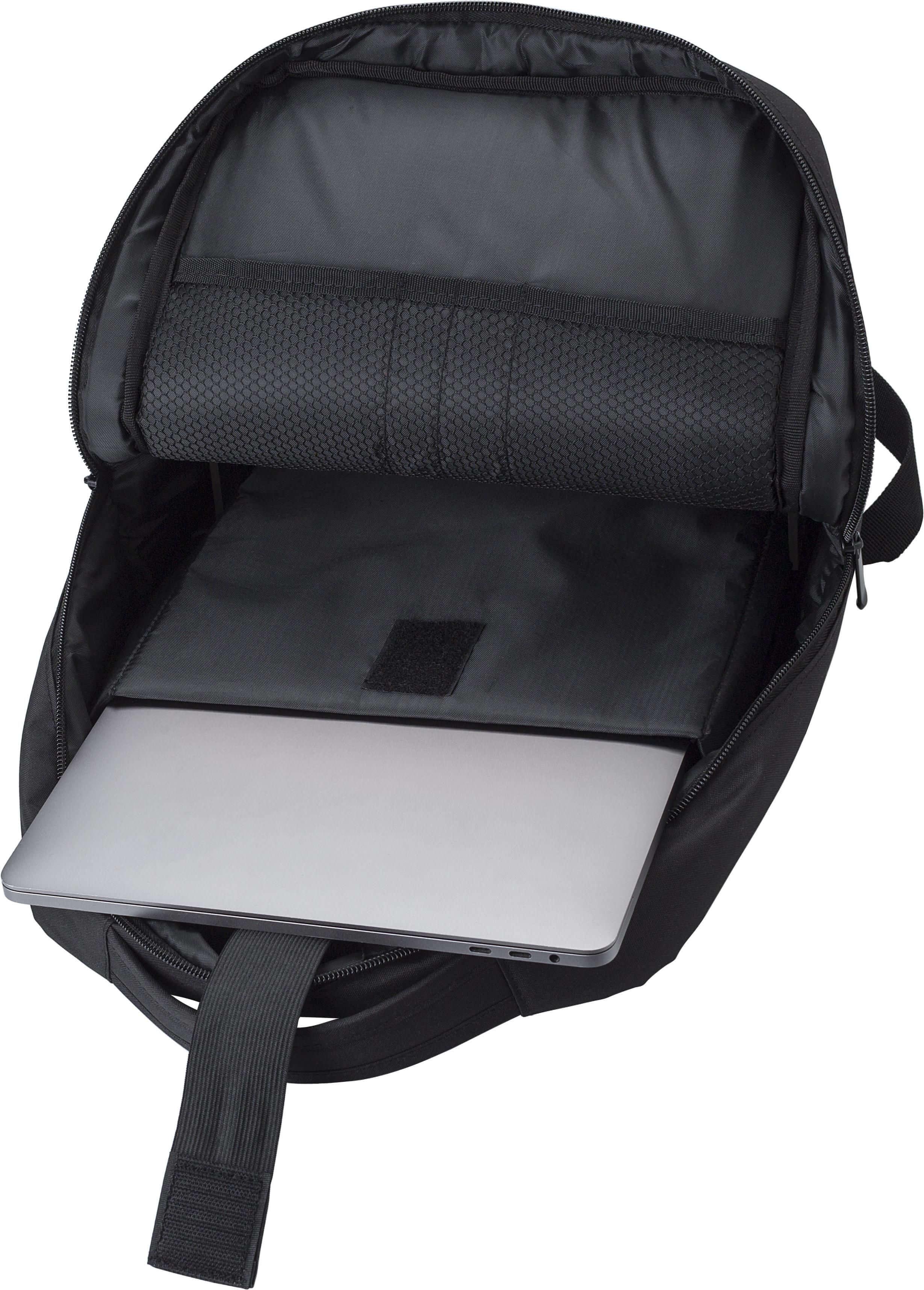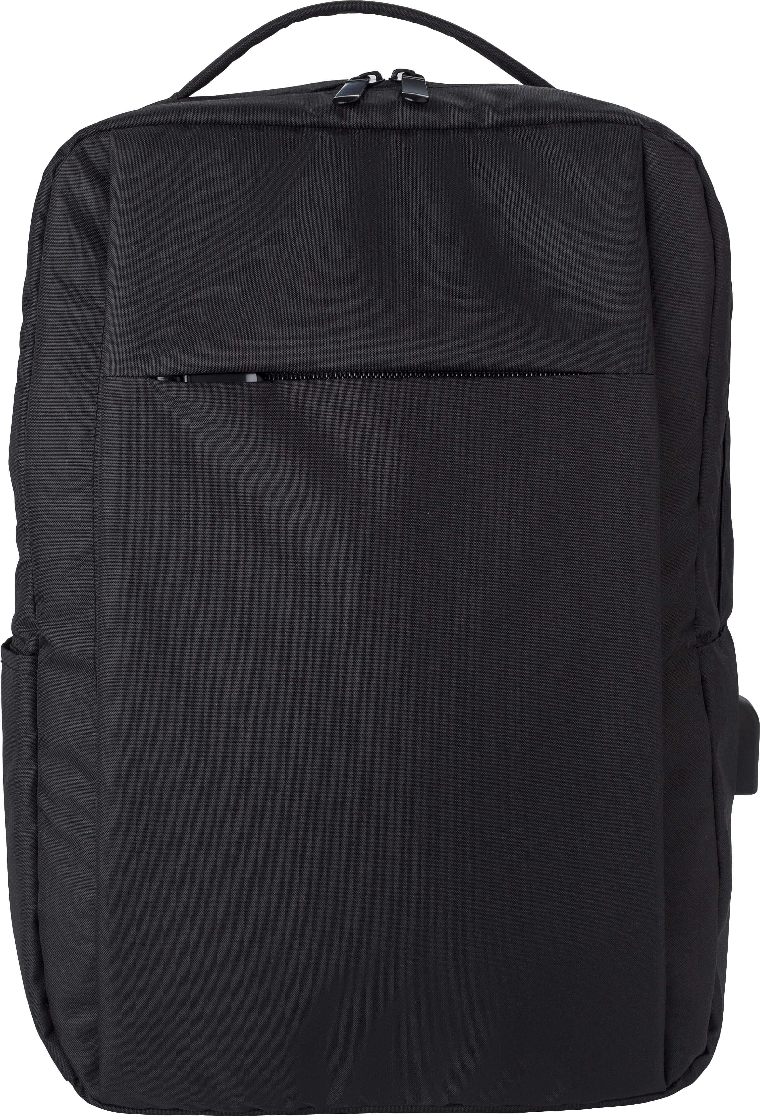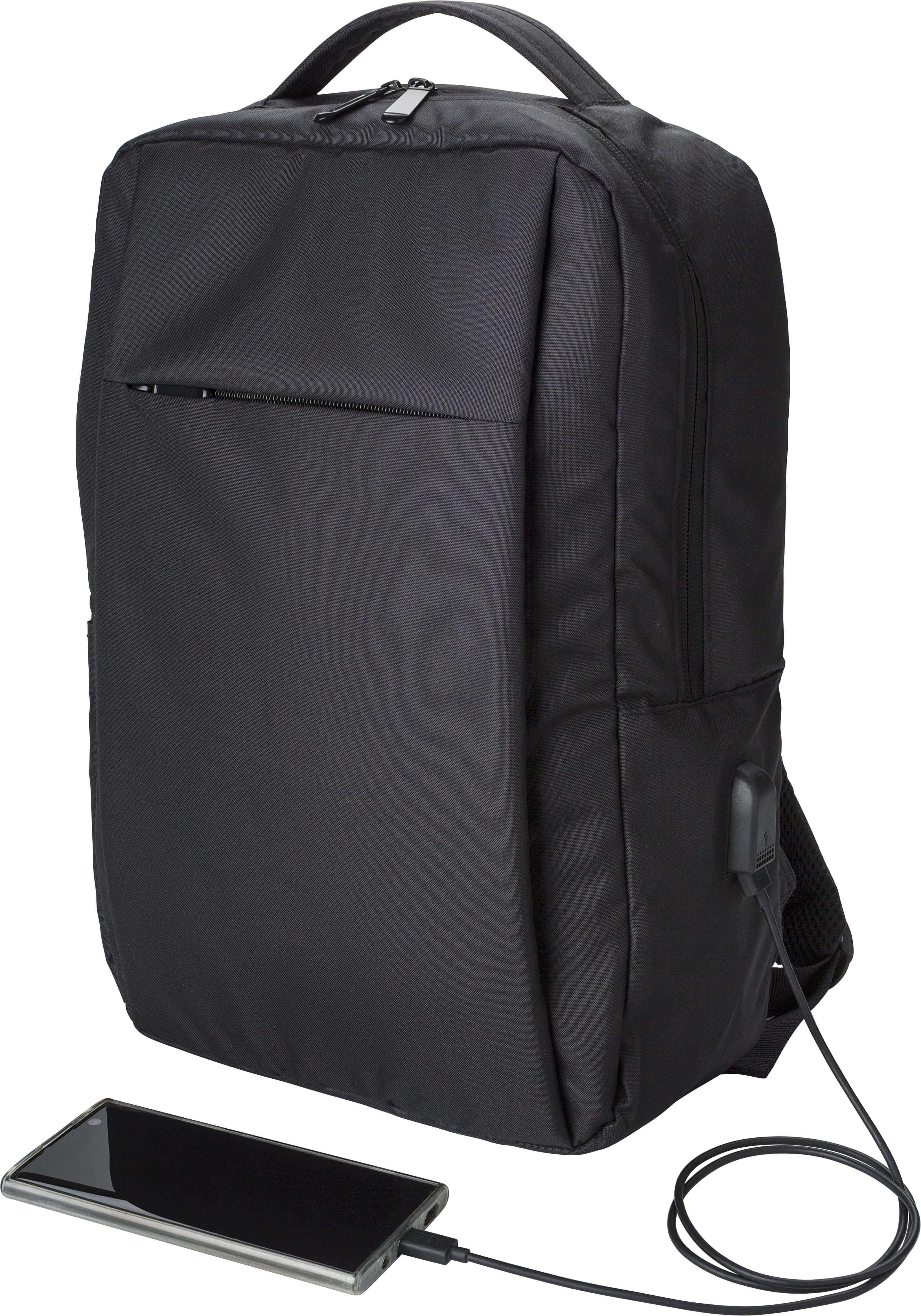 Mochila para portátil (16 polegadas) em rPET (300D) com detalhes em 210D. Interior com vários bolsos, bolso para portátil com fecho de velcro, um bolso frontal com fecho de correr. Abertura com USB-A na parte lateral.