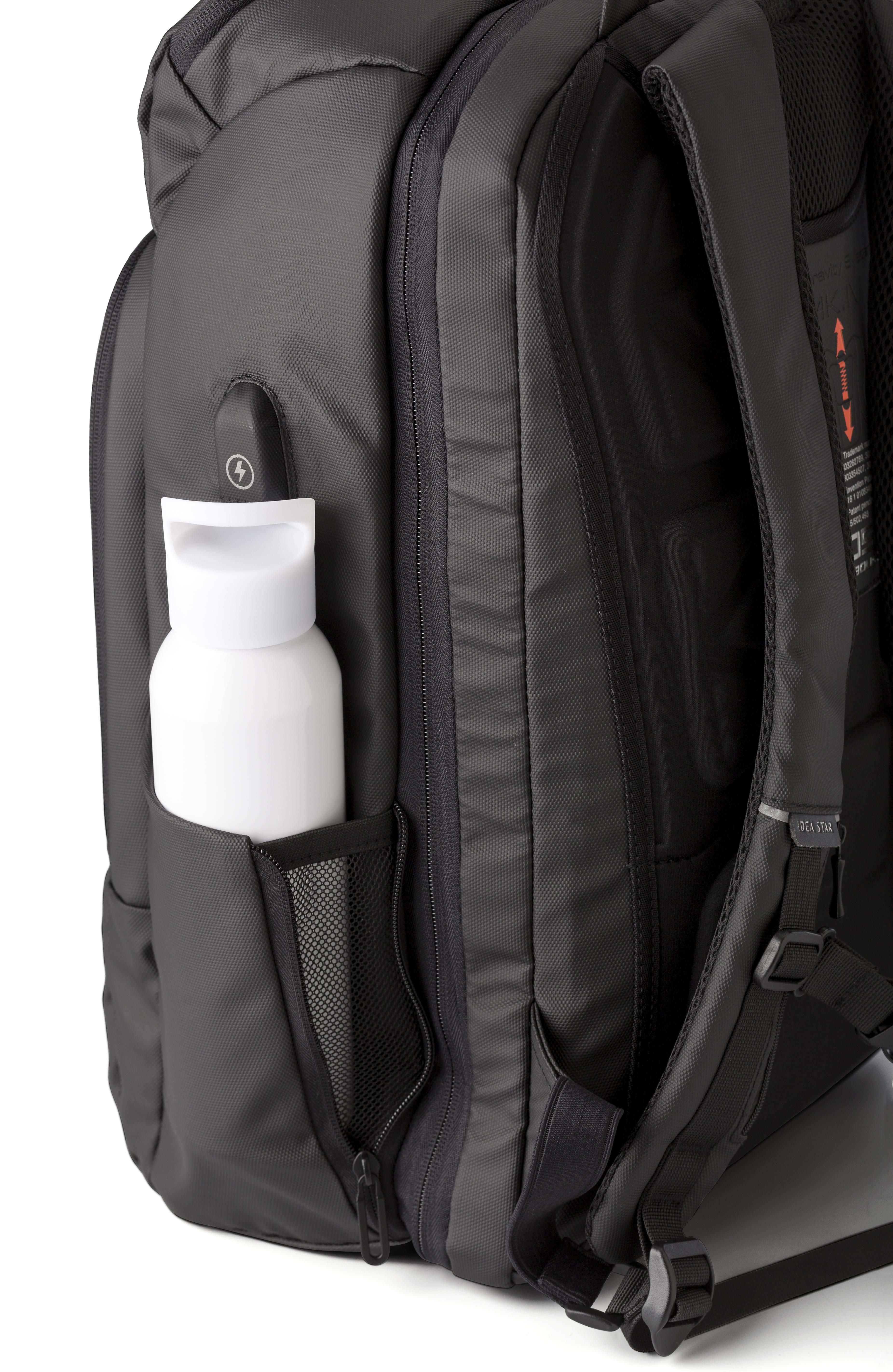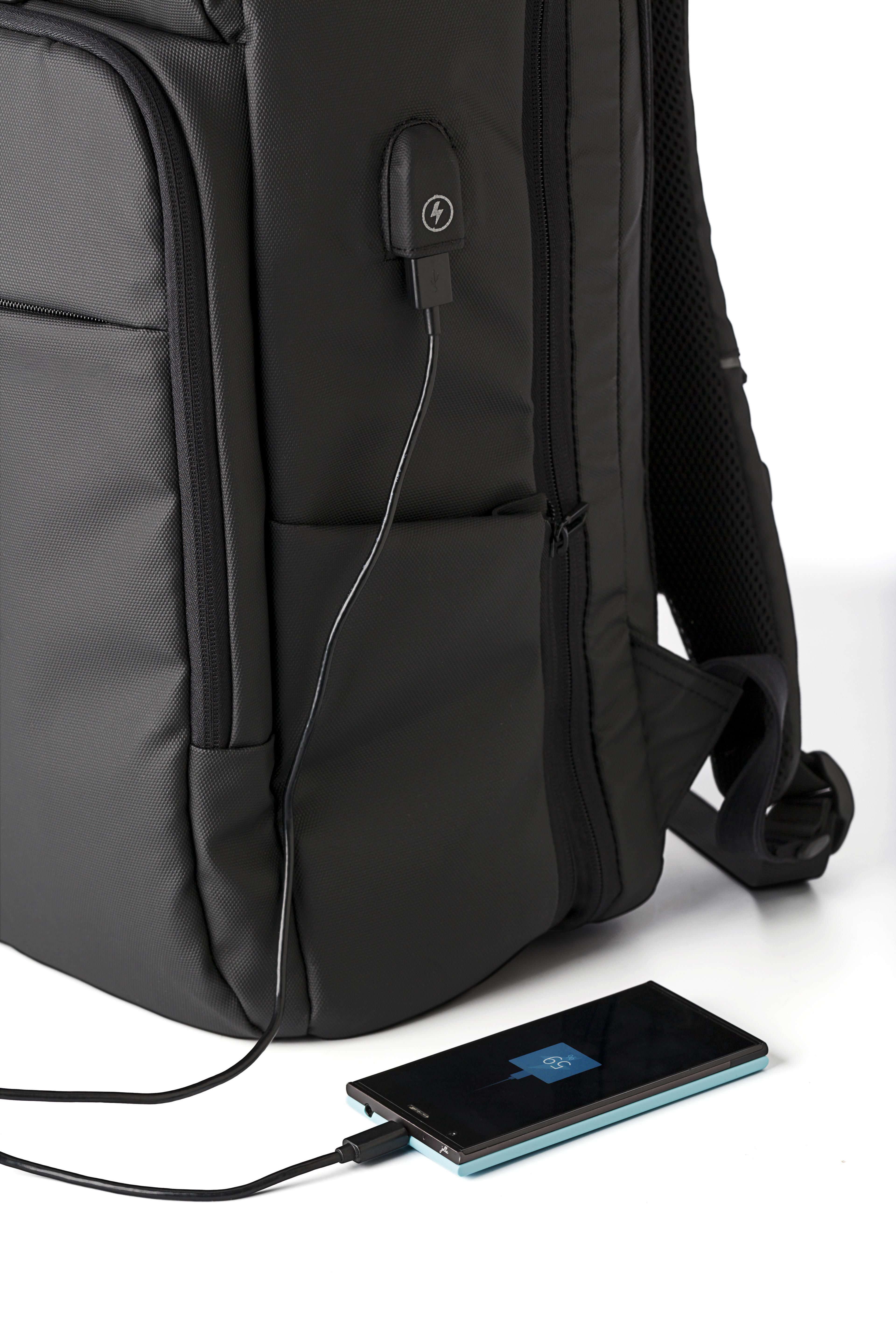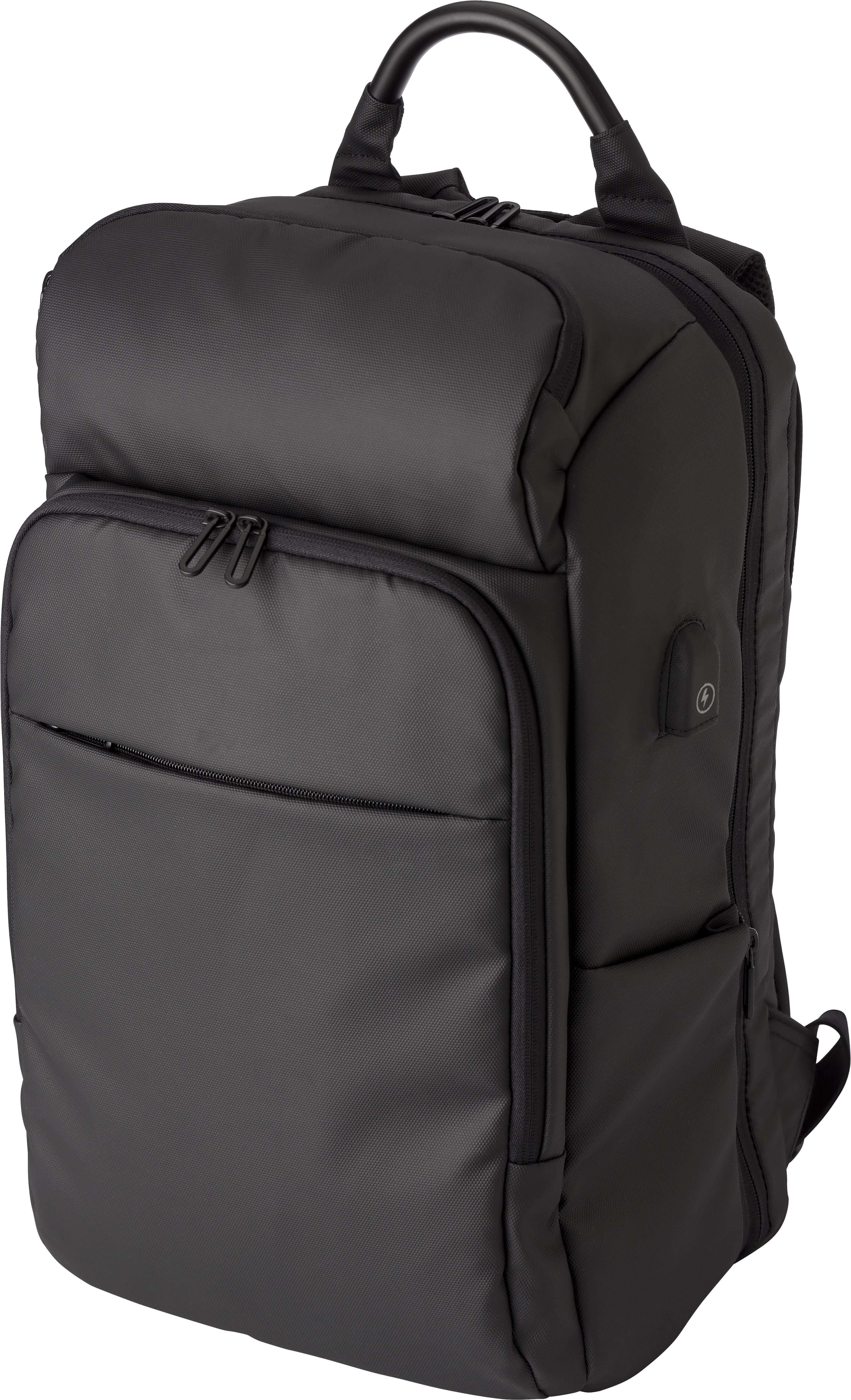 Mochila de PU (600 D) com bolsos frontais e laterais (um isotérmico). Grande compartimento acolchoado para laptop (15 ”). Costas acolchoadas e alças ajustáveis acolchoadas. Peça especial para distribuir o peso. Porta e cabo USB.