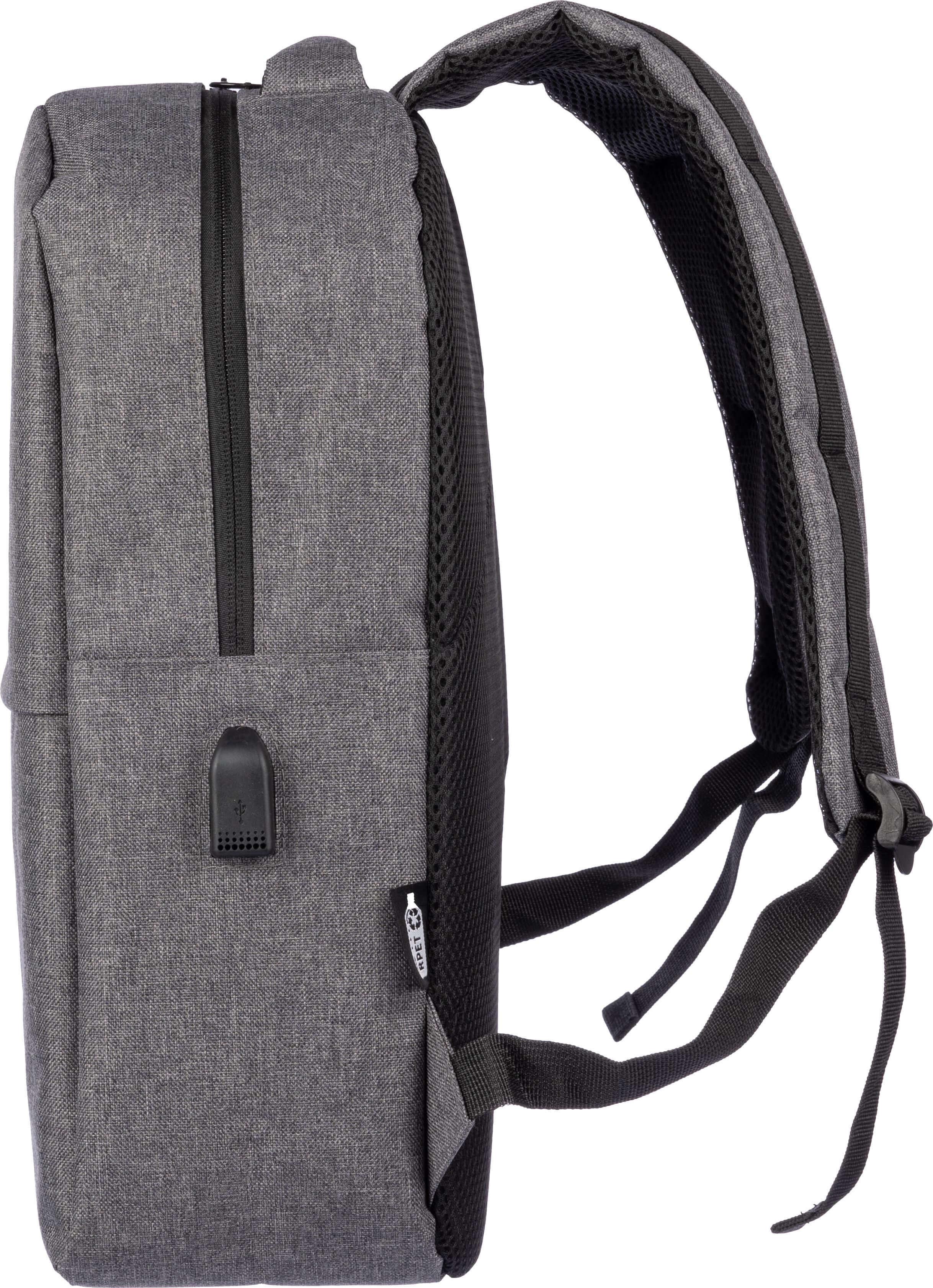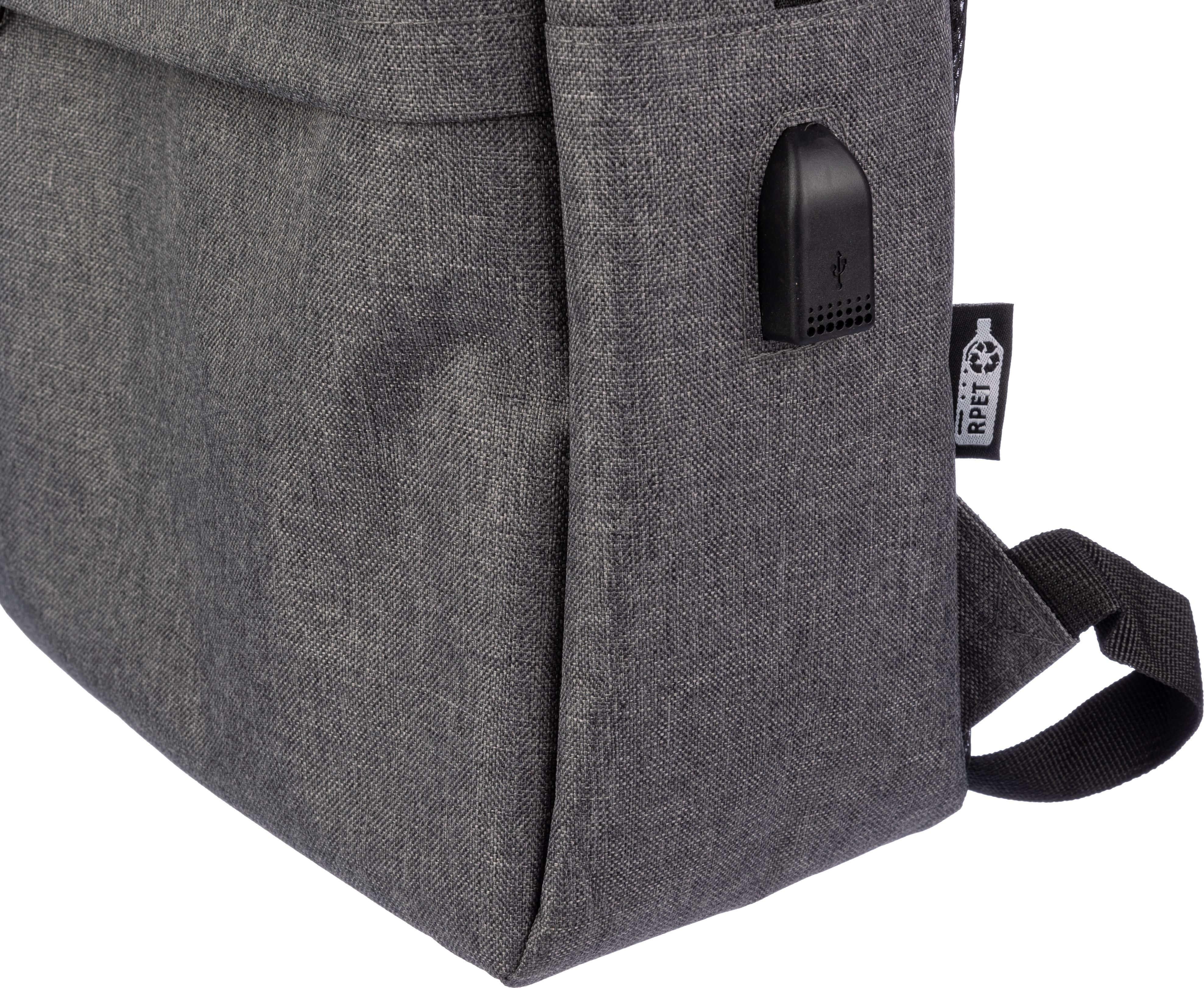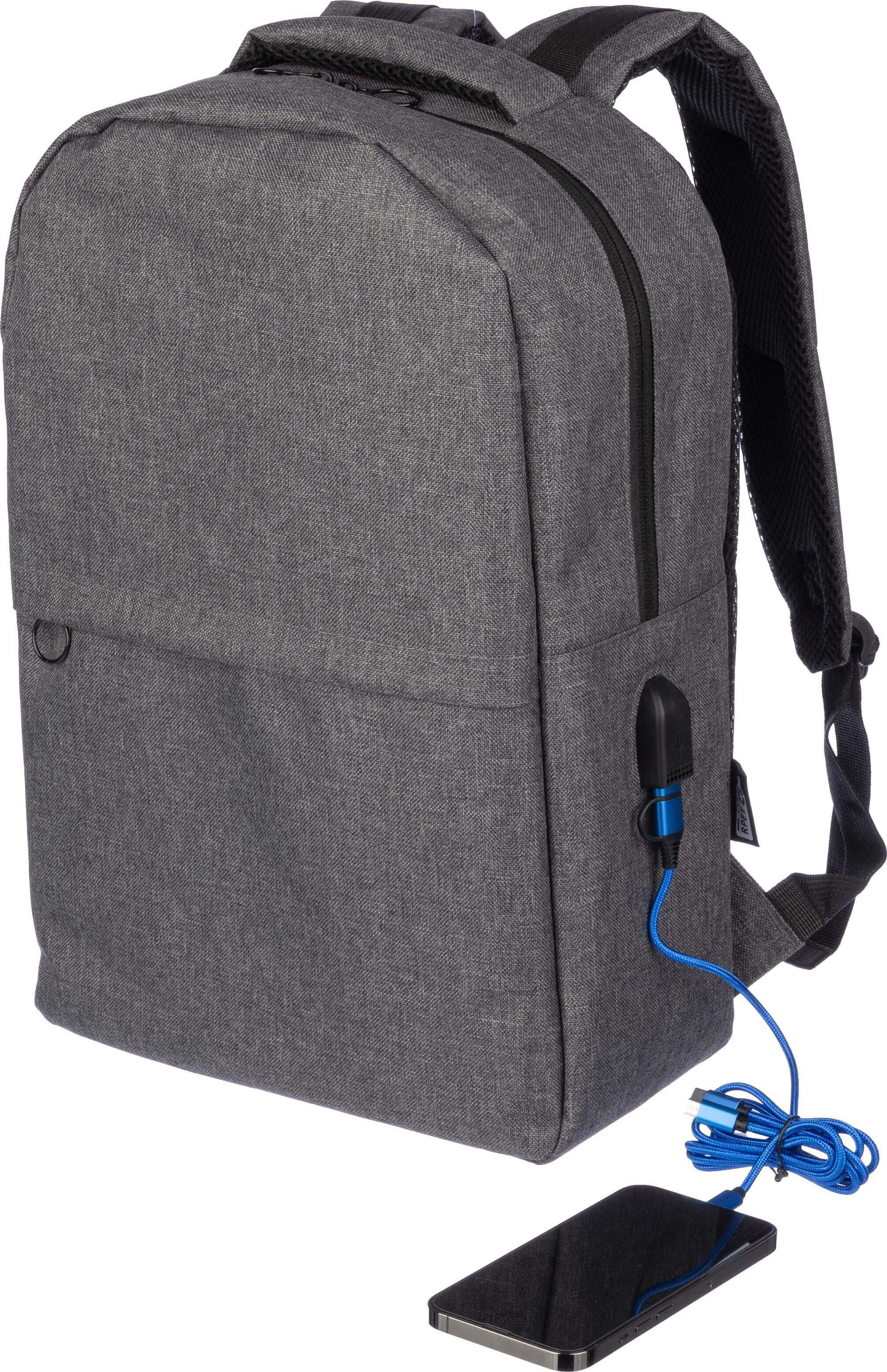 Mochila rPET (600D) com abertura de porta USB (e cabo USB dentro) com um grande compartimento com zíper na parte superior e um bolso com zíper na parte da frente. No interior, há um compartimento para dispositivos de 10 polegadas e um para dispositivos de 15 polegadas. Com alças ajustáveis.