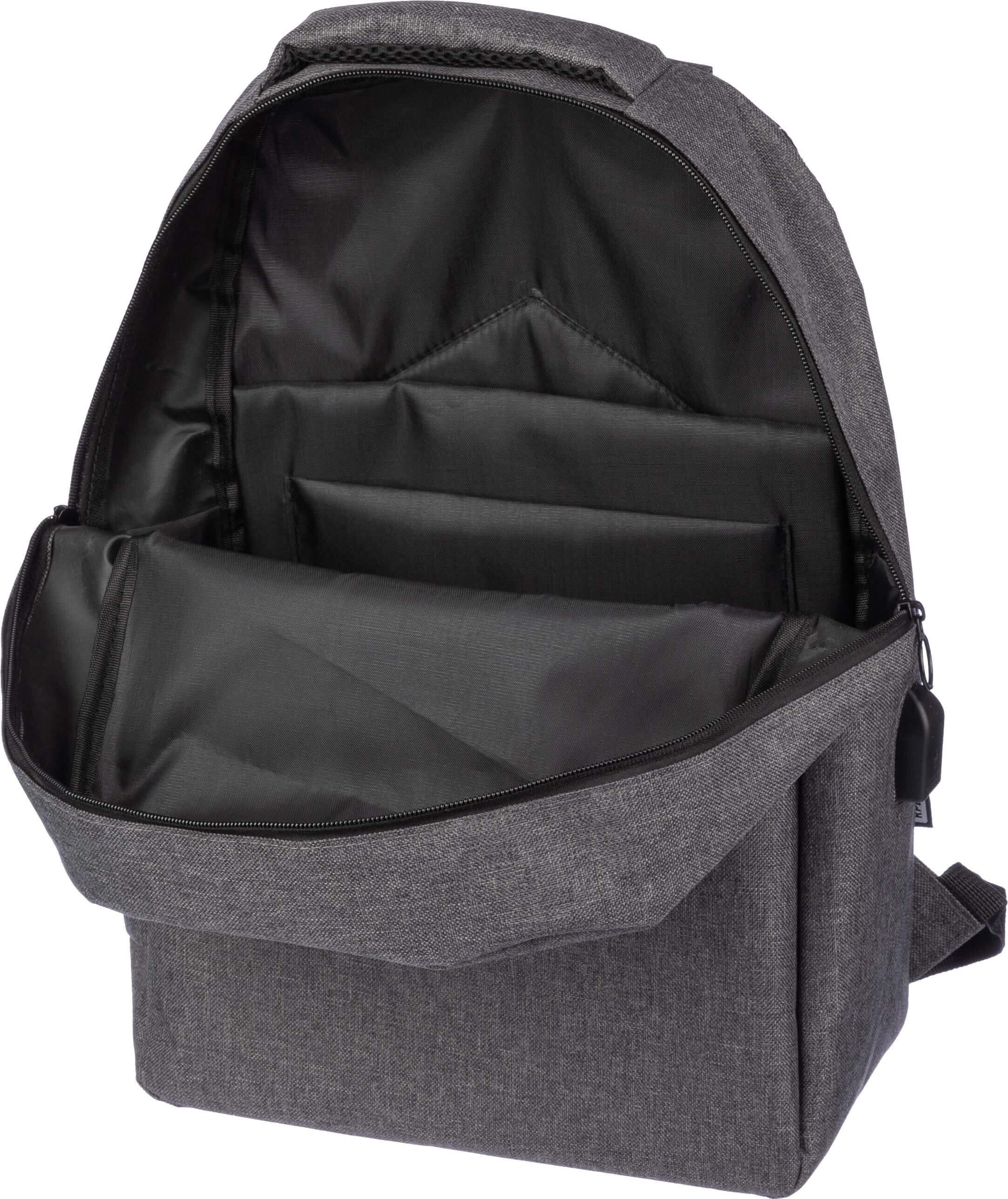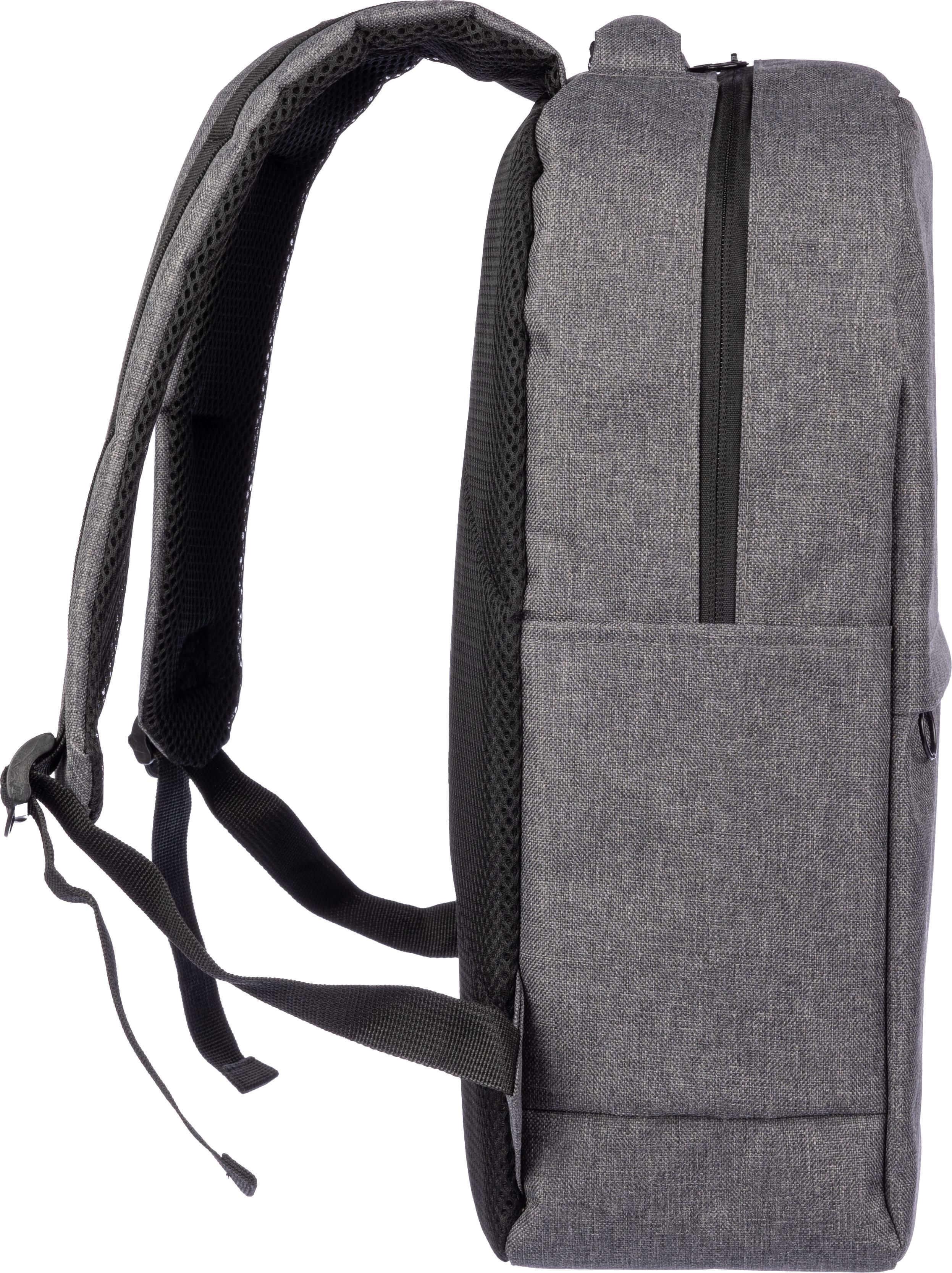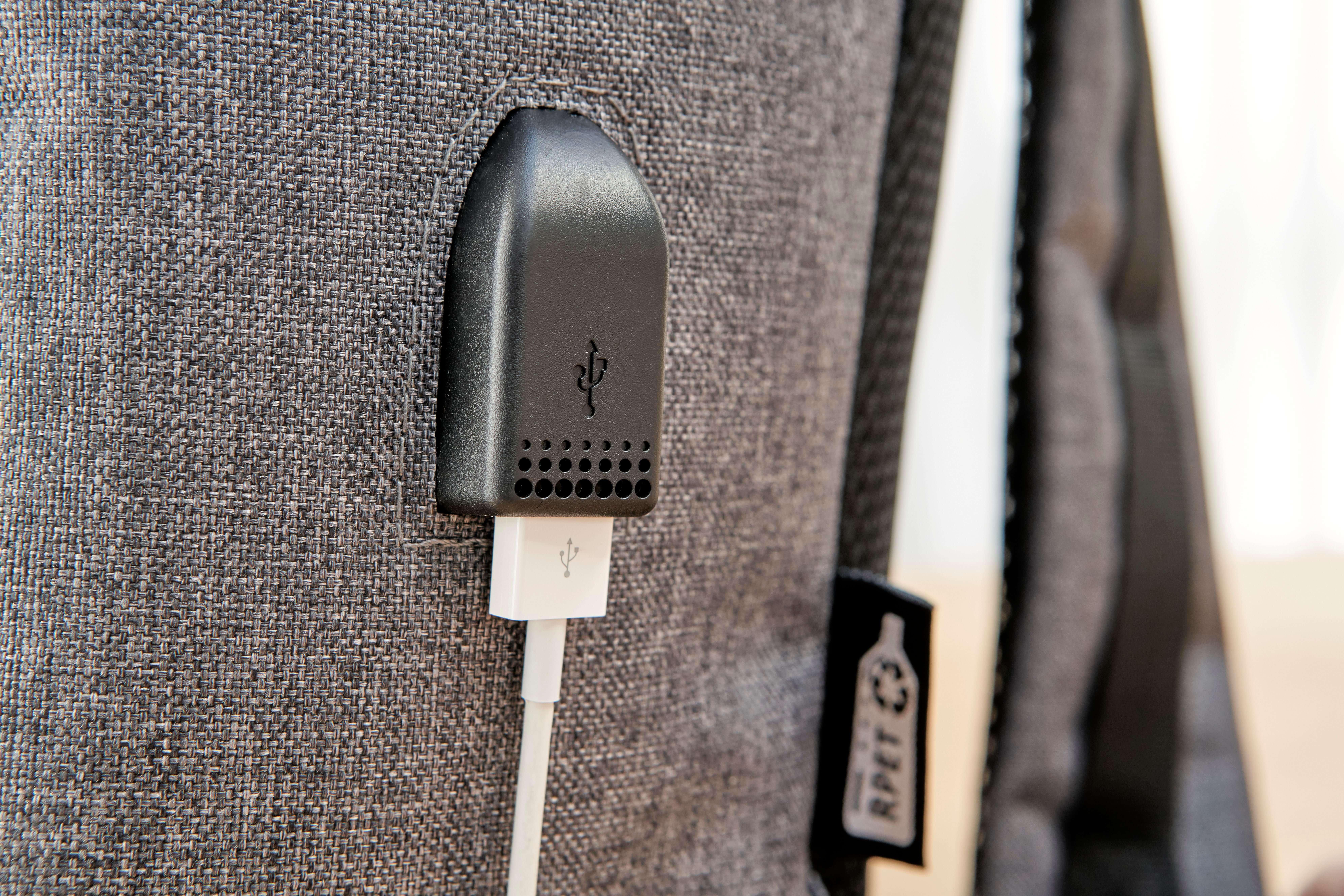 Mochila rPET (600D) com abertura de porta USB (e cabo USB dentro) com um grande compartimento com zíper na parte superior e um bolso com zíper na parte da frente. No interior, há um compartimento para dispositivos de 10 polegadas e um para dispositivos de 15 polegadas. Com alças ajustáveis.