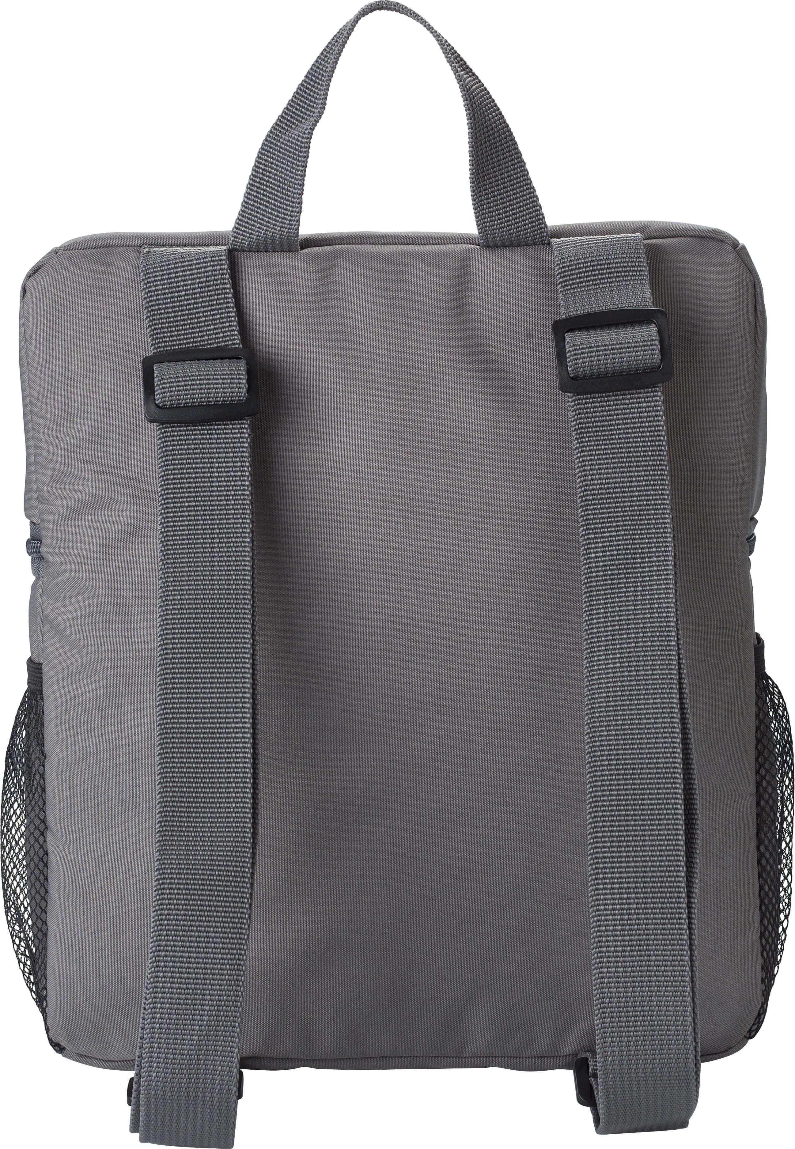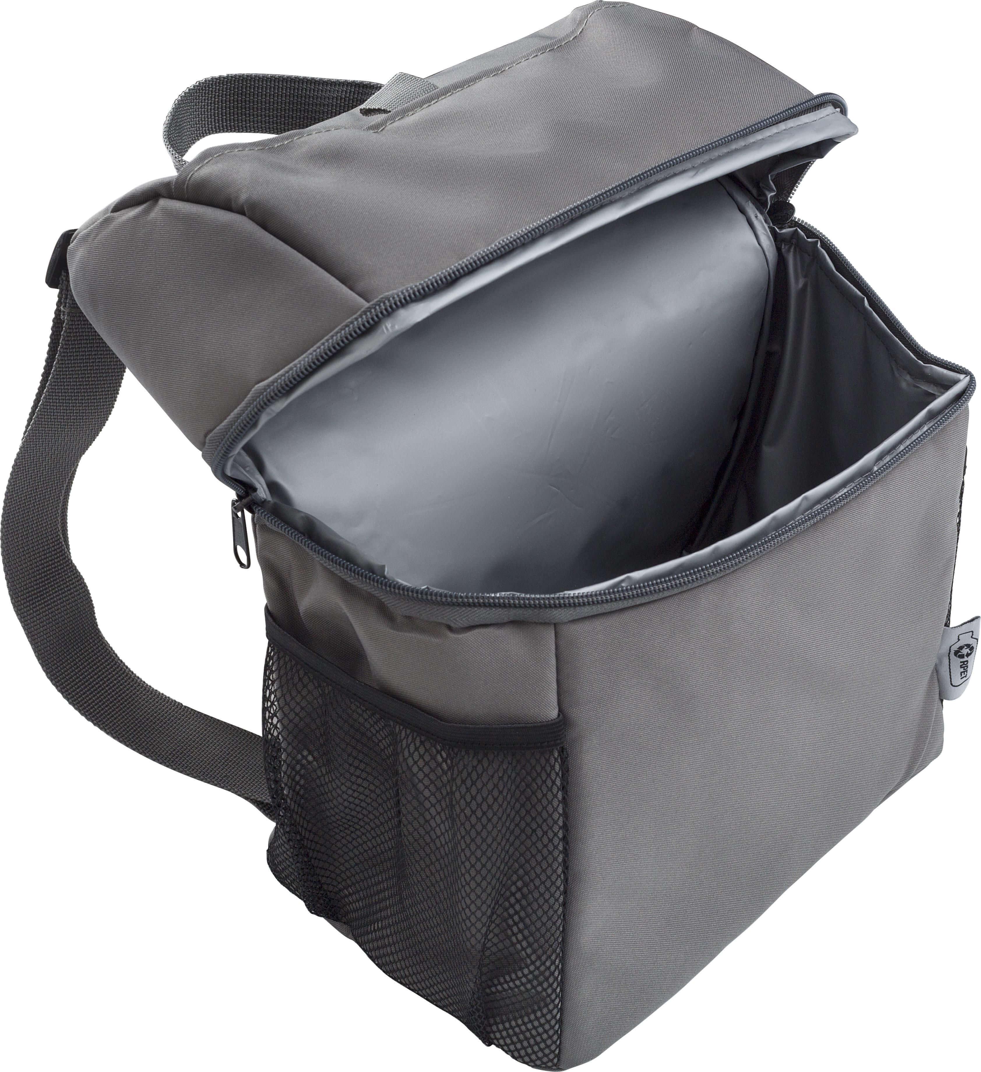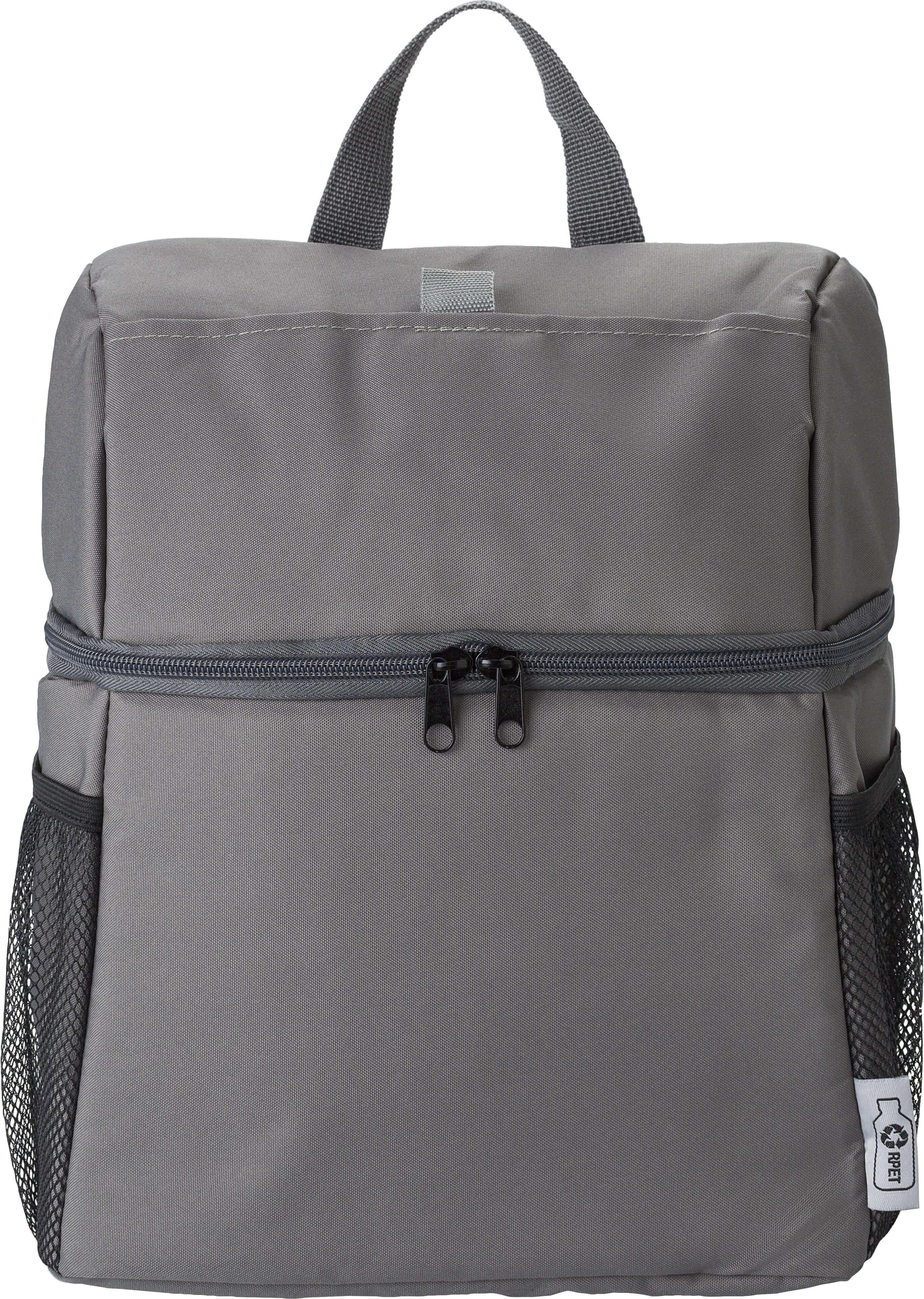 Mochila térmica em poliéster reciclado (300D/PU rPET) com forro em PEVA (13C). Um bolso frontal com fecho de velcro, dois bolsos de rede na parte lateral. Alças de ombro ajustáveis.
