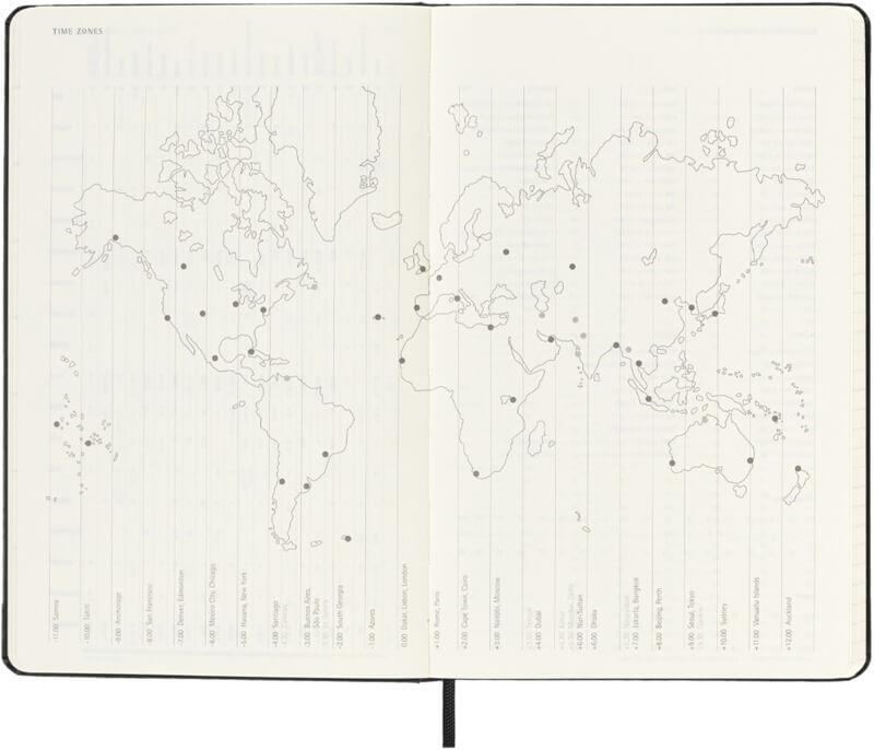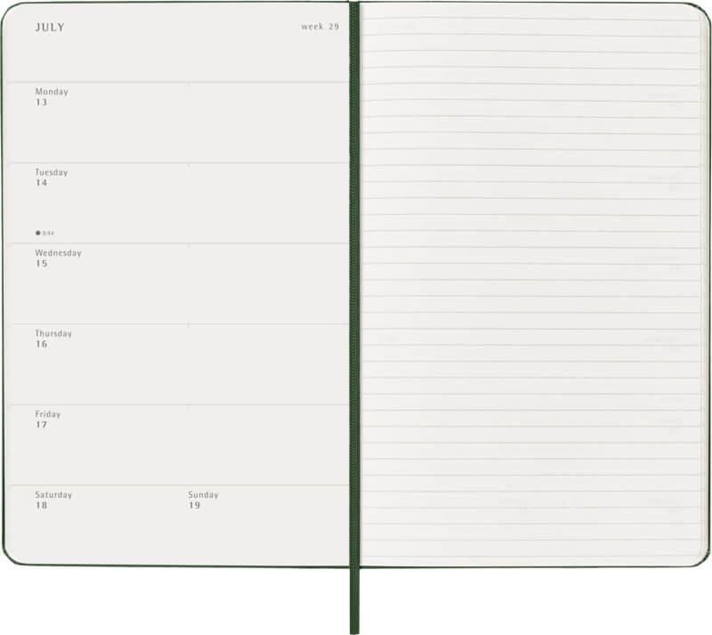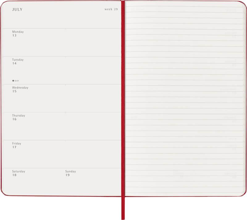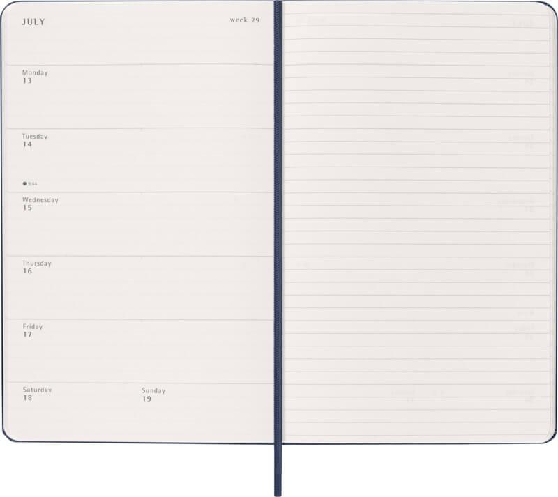 Datada de janeiro a dezembro de 2026, a agenda semanal de capa dura para 12 meses “Moleskine” mostra a semana inteira à primeira vista, ao mesmo tempo que fornece páginas para fotografias anuais e mensais para uma visão geral do ano mais ampla, seguidas por páginas para planeamento de viagens, ideias e objetivos. Os dias de cada semana são mostrados num lado, oposto a uma página pautada para tarefas e anotações. Possui papel cor de marfim isento de ácido, um fecho elástico preto, um marcador de página de fita, um bolso interior expansível em cores coordenadas e autocolantes para personalização pessoal, assim como autocolantes anuais para a lombada.