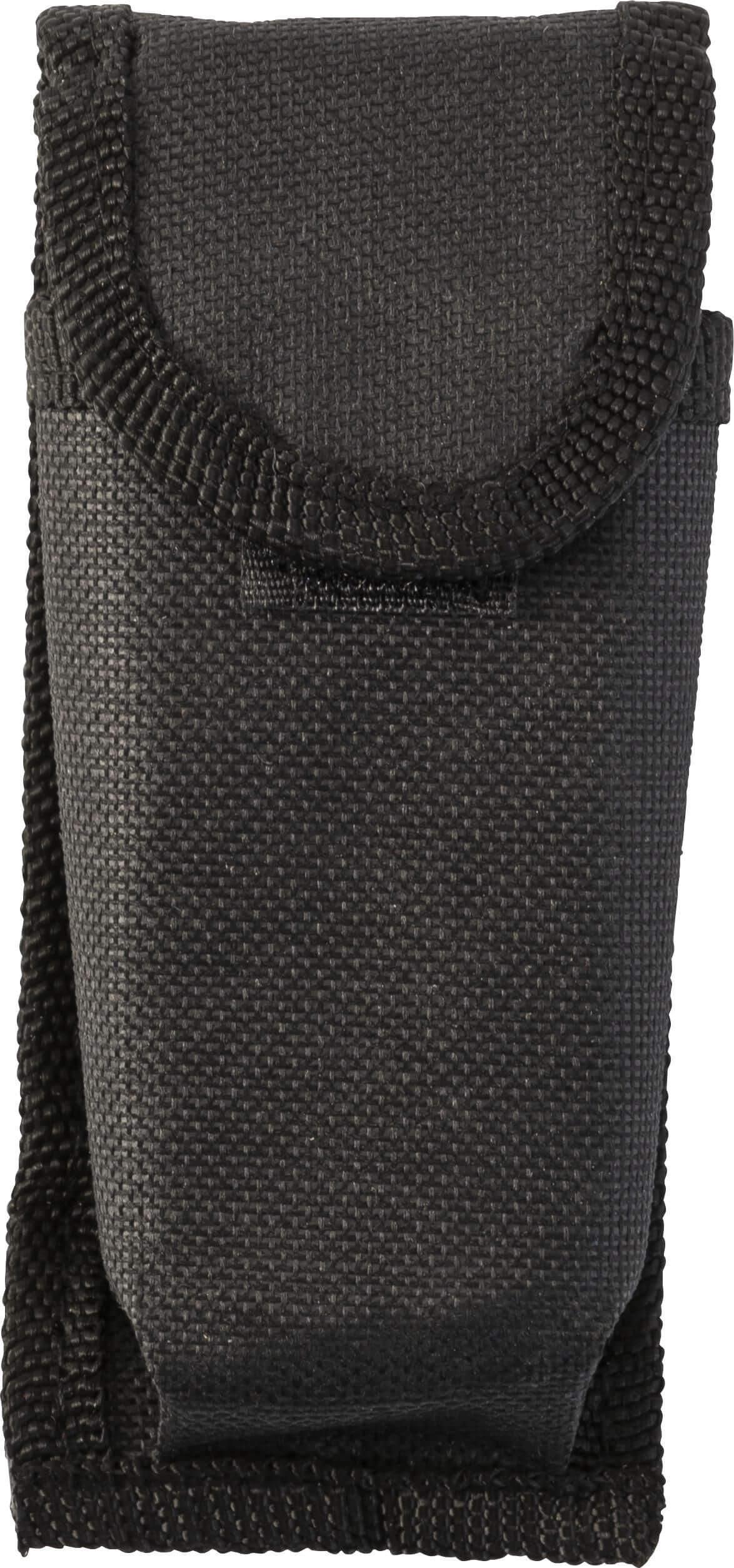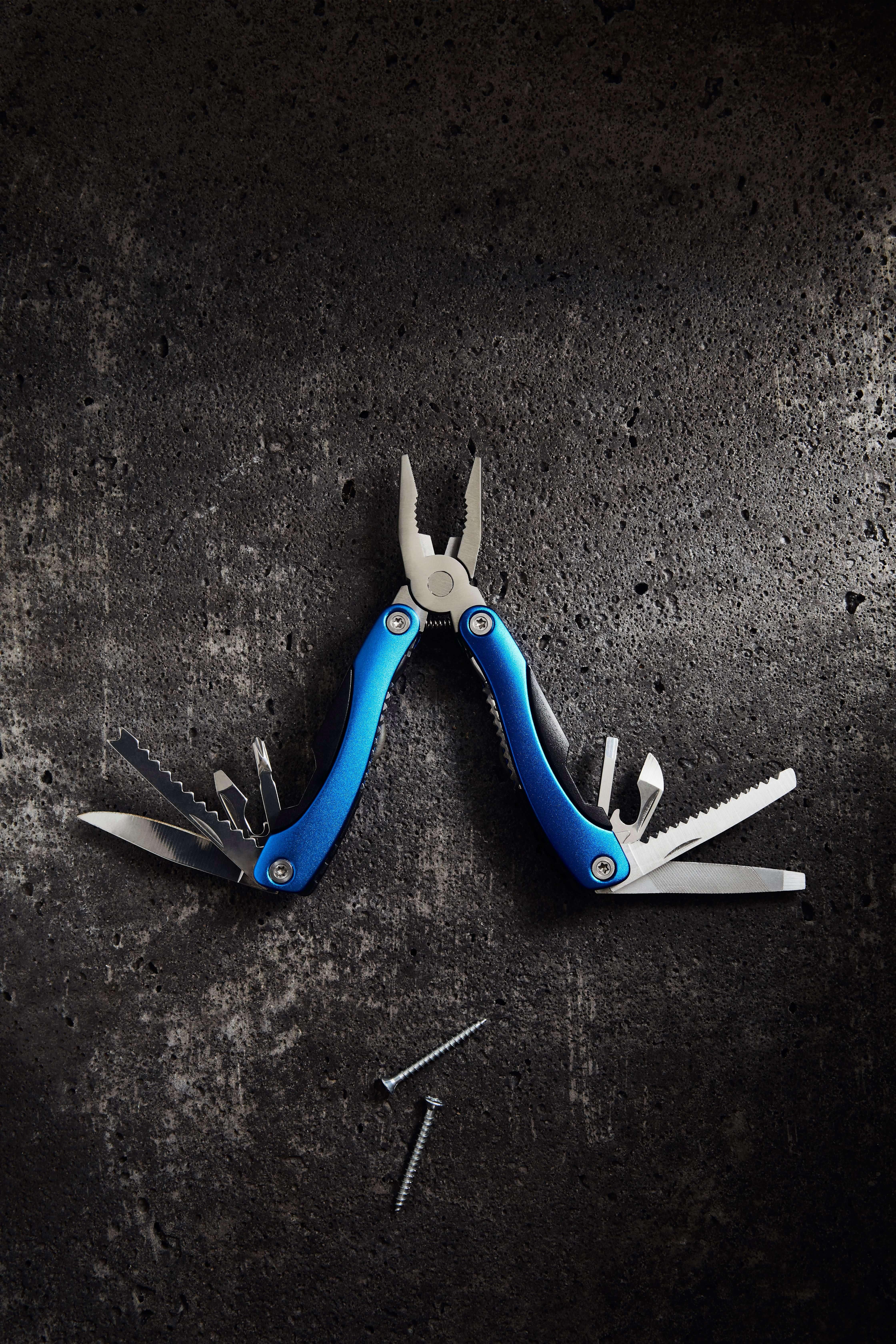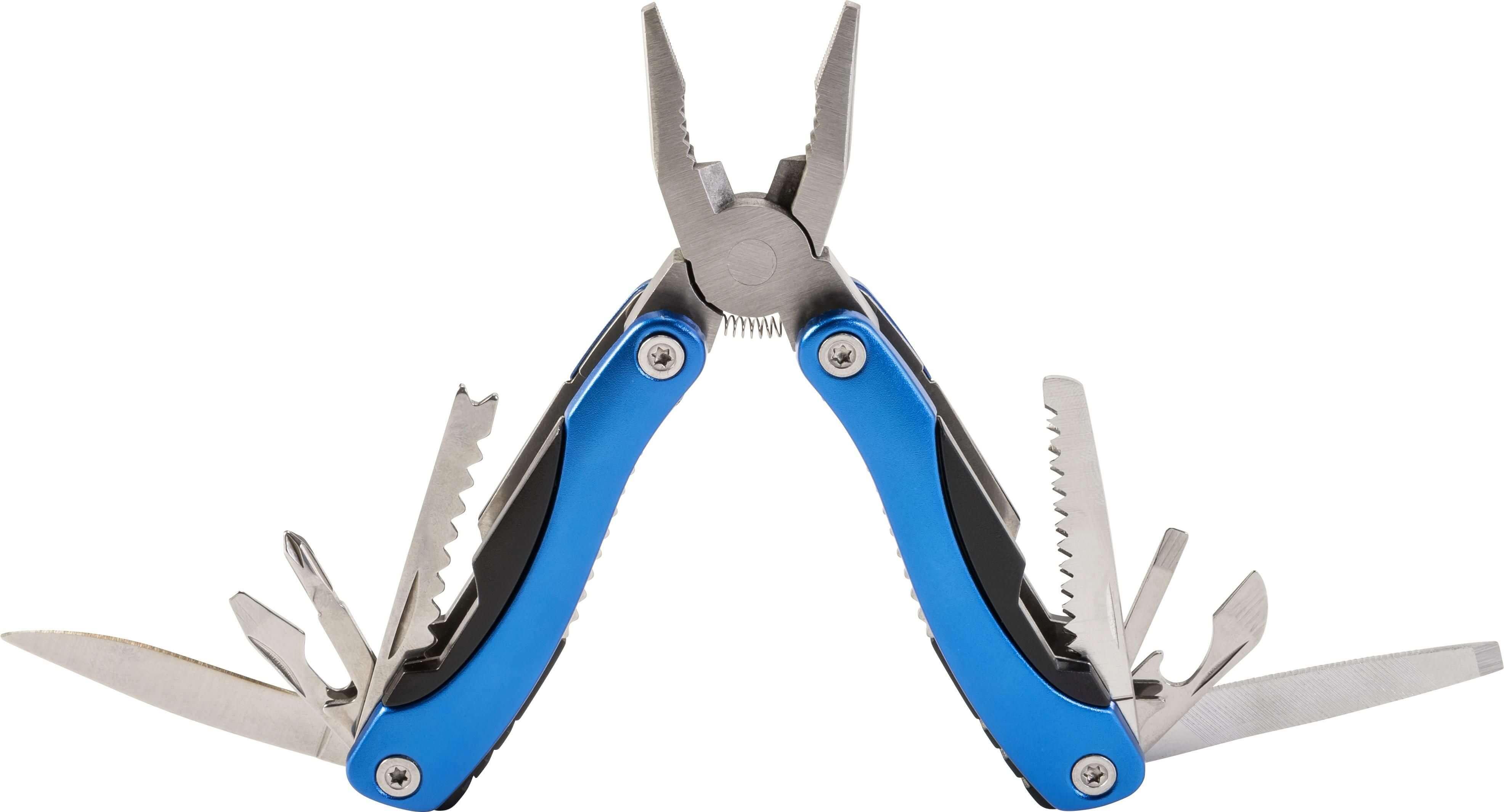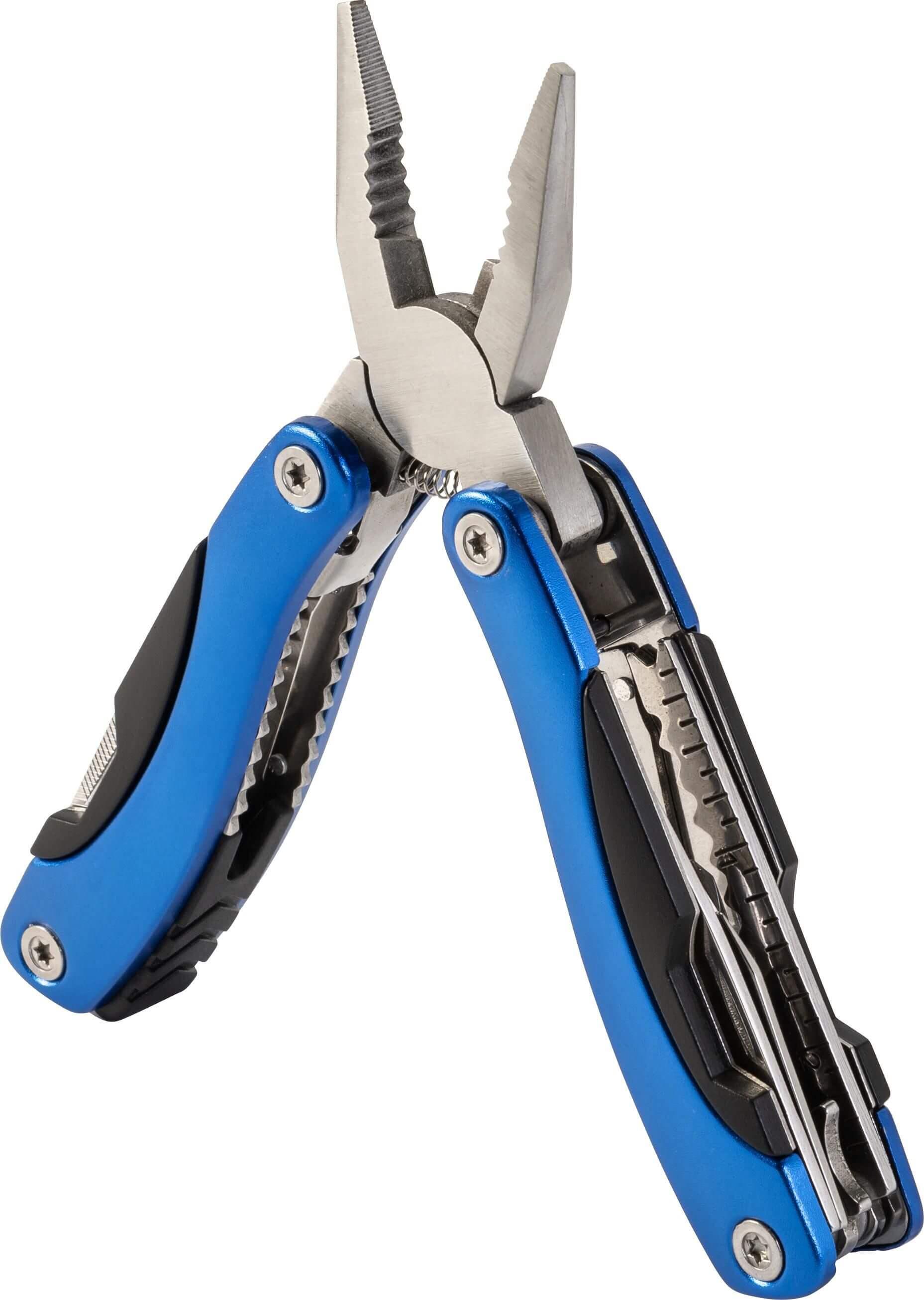 Multiferramenta metálica com detalhes em ABS. Apresentada em estojo. Inclui alicate, serra, faca, chaves de fendas (planas e estelares), lima, abridor de garrafas, desescamador, quebra-nozes e régua polegadas.