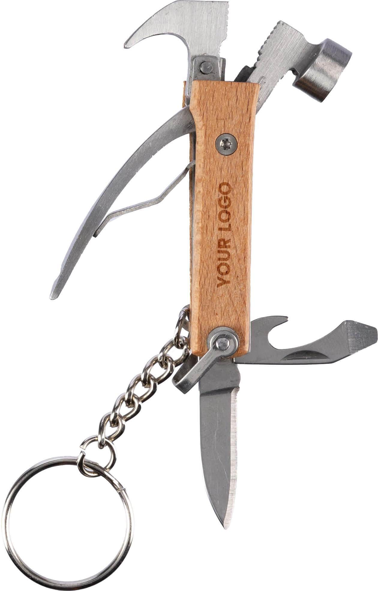 Multiferramenta de bambu com 7 funções, incluindo um porta-chaves. Embalado individualmente em uma caixa de papelão marrom.
