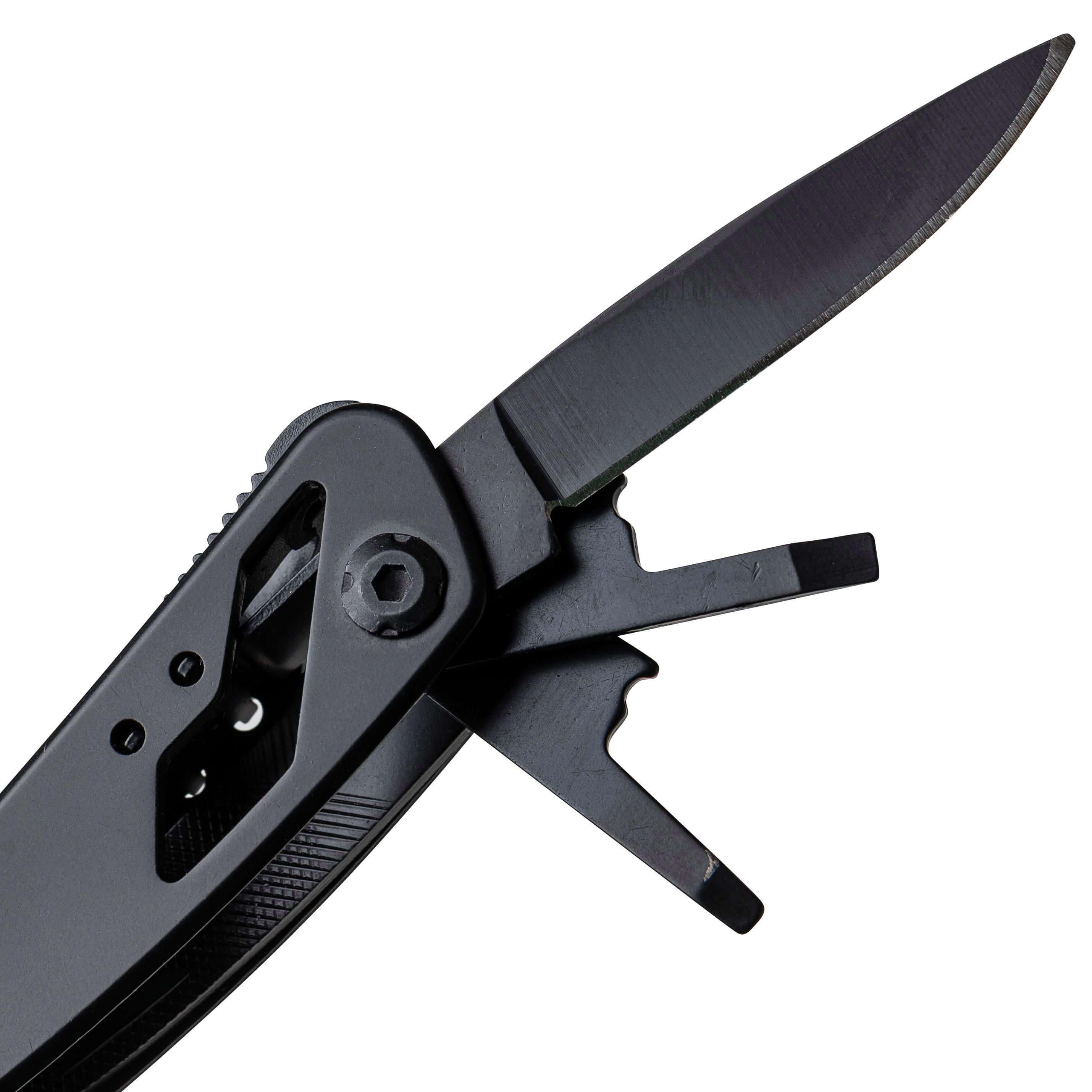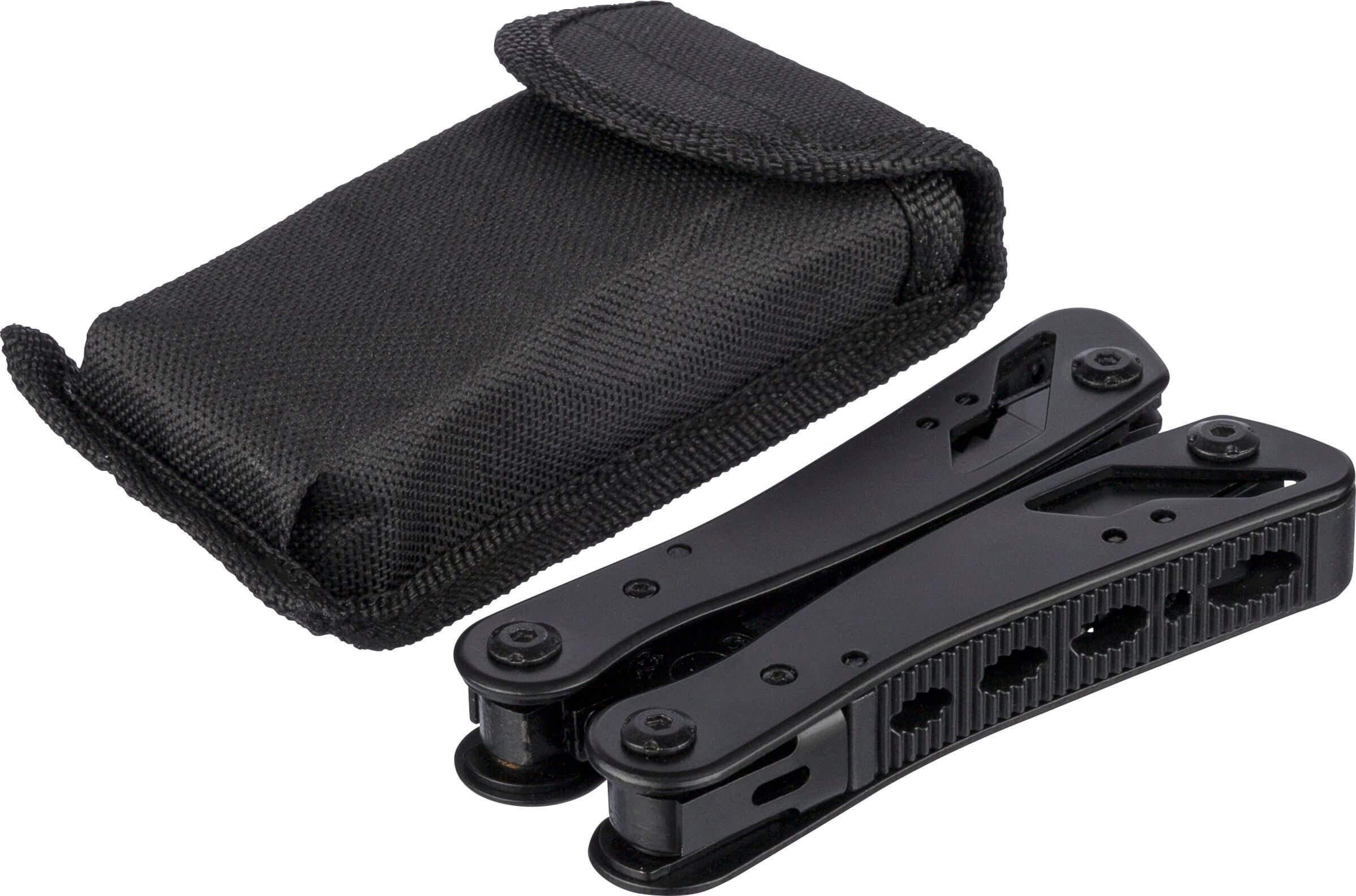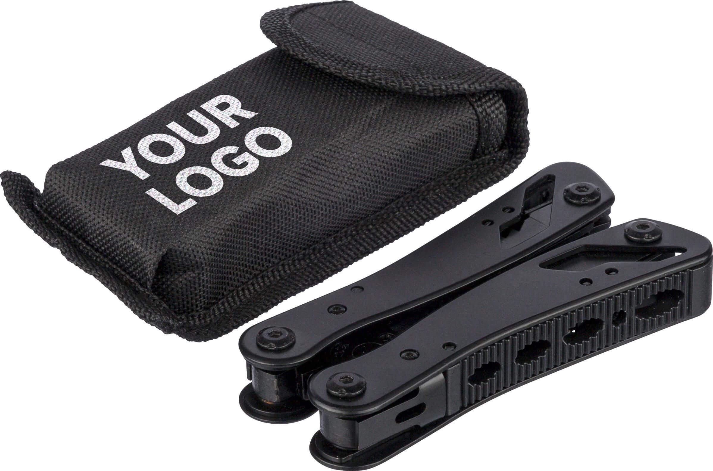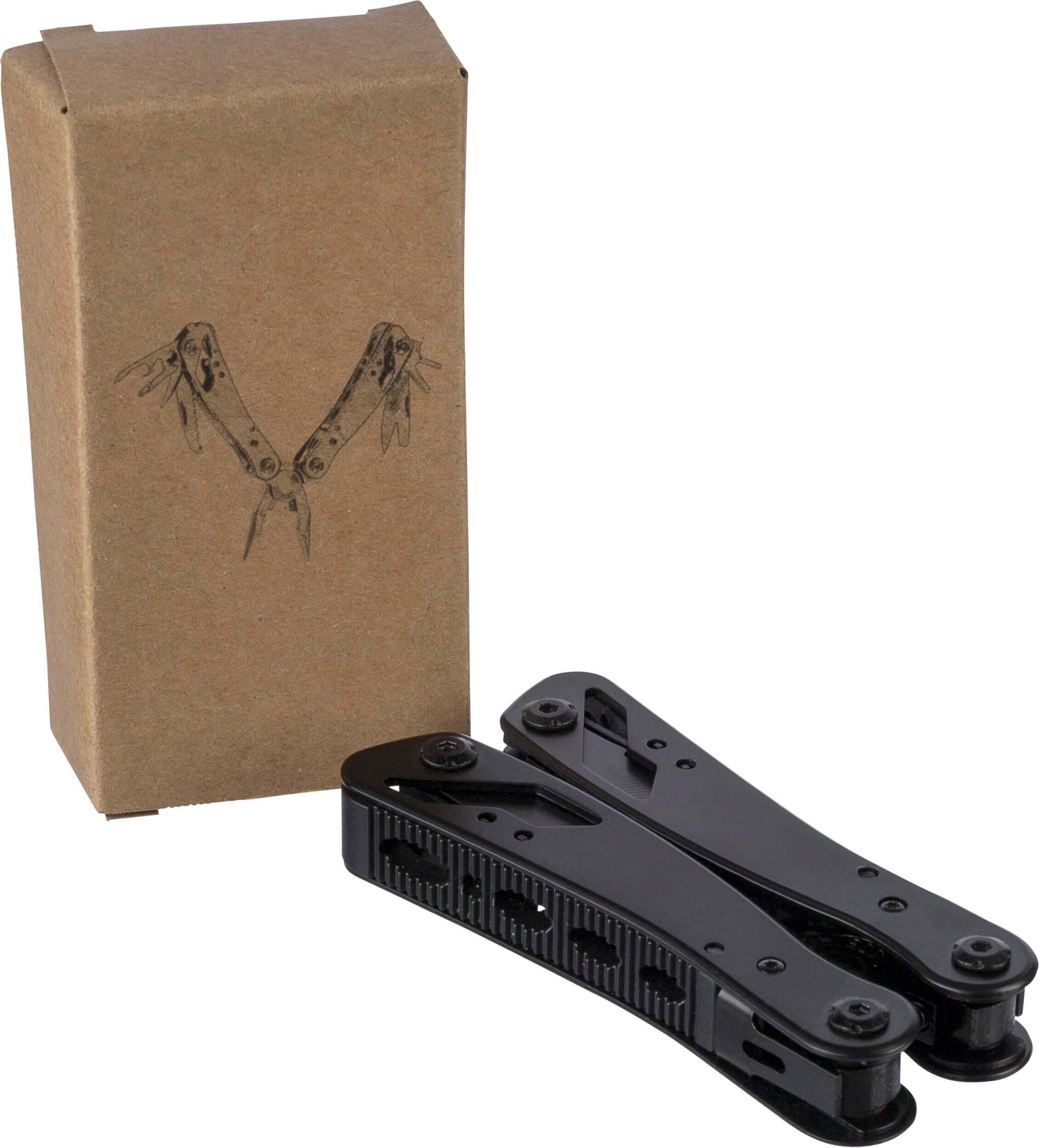Multifuncional em alumínio preto e aço inoxidável com 13 funções, incluindo facas, chaves de fendas, alicate, serra, lima, alavanca, pontas, mola, barra em arco, abre-latas e espiga. Vem com uma bolsa com presilha de velcro para cinto e caixa exterior adicional. Embalado individualmente numa caixa de cartão castanho.