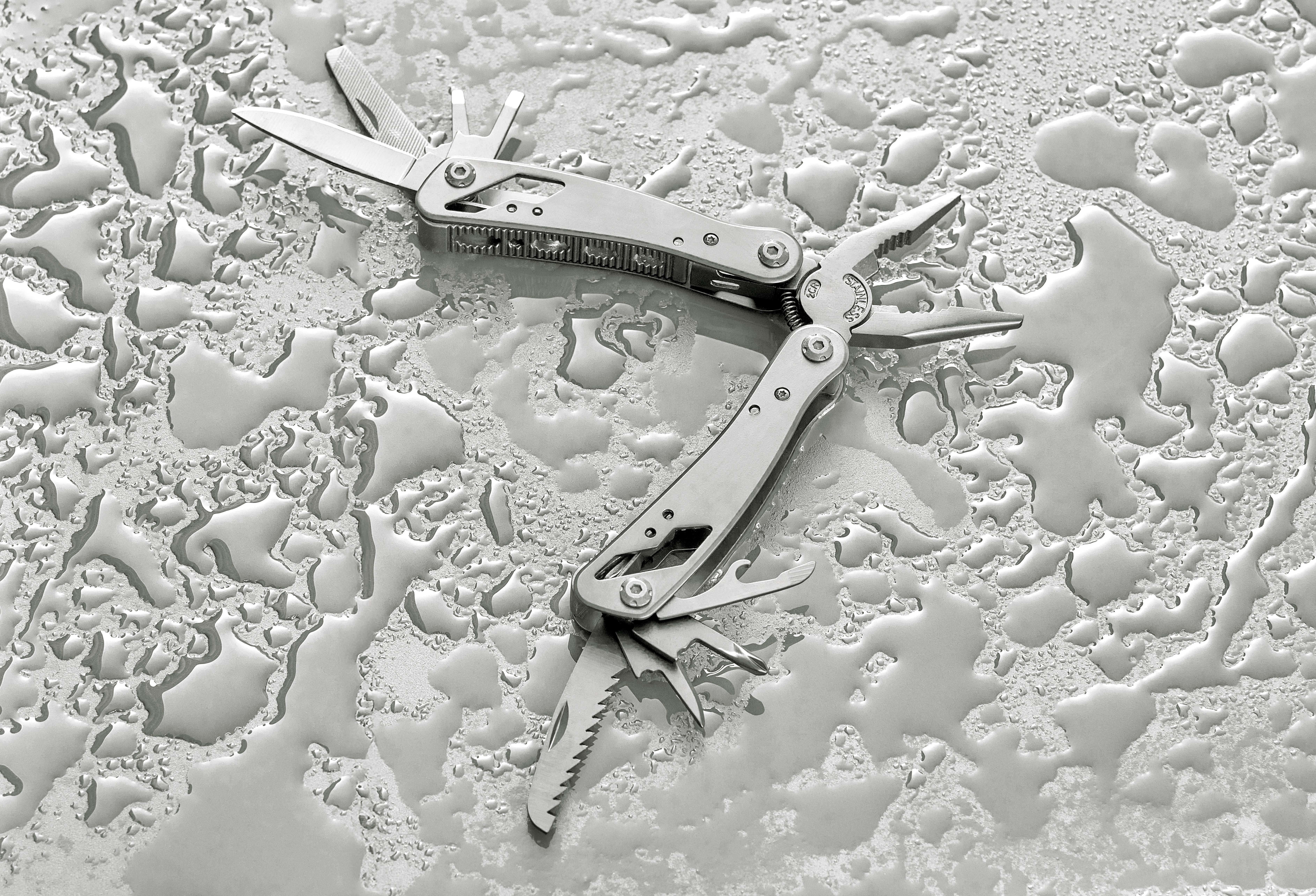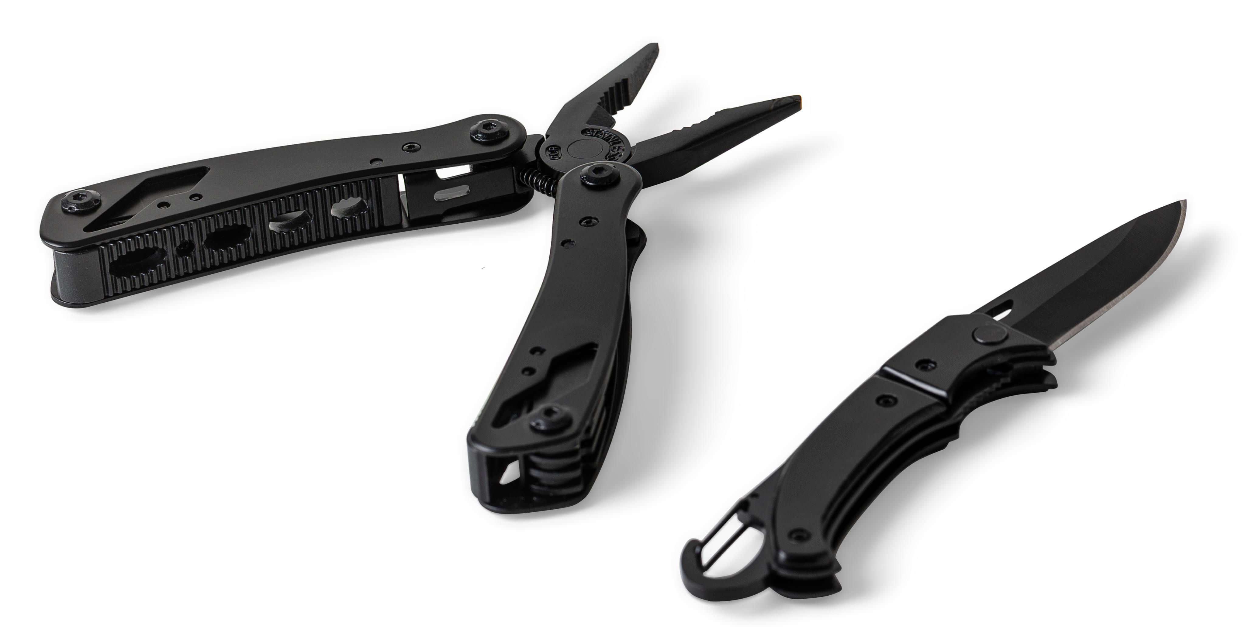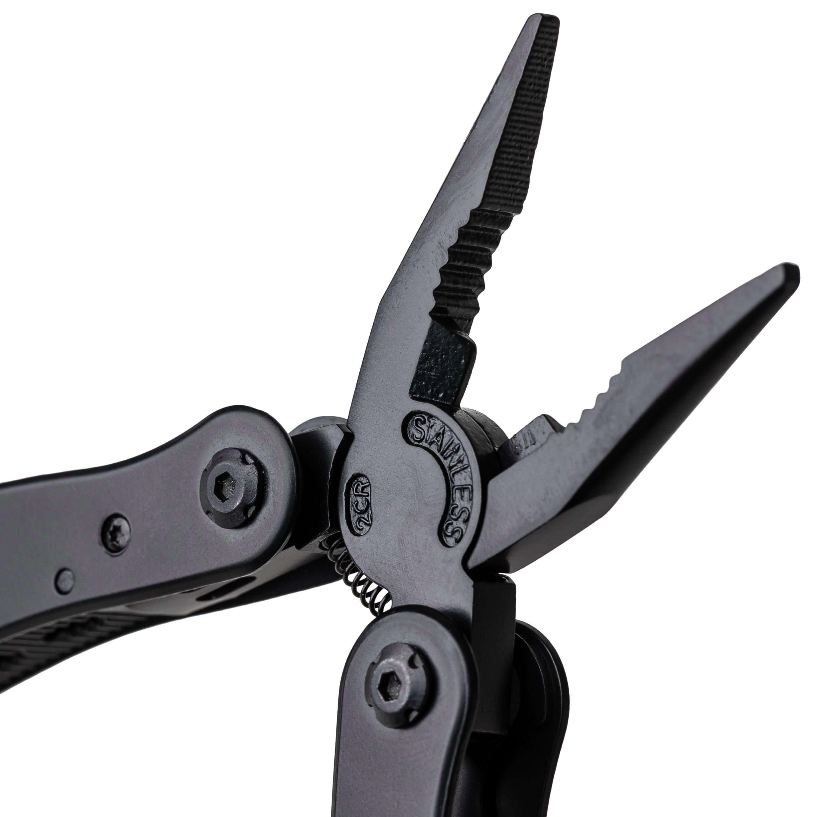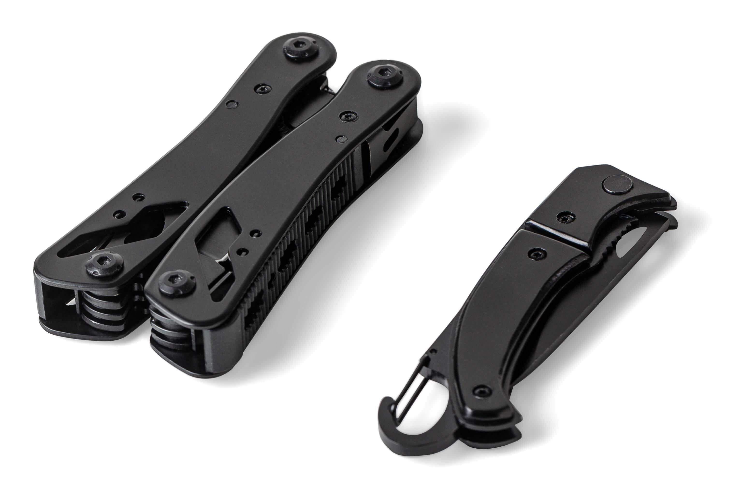 Multifuncional em alumínio preto e aço inoxidável com 13 funções, incluindo facas, chaves de fendas, alicate, serra, lima, alavanca, pontas, mola, barra em arco, abre-latas e espiga. Vem com uma bolsa com presilha de velcro para cinto e caixa exterior adicional. Embalado individualmente numa caixa de cartão castanho.