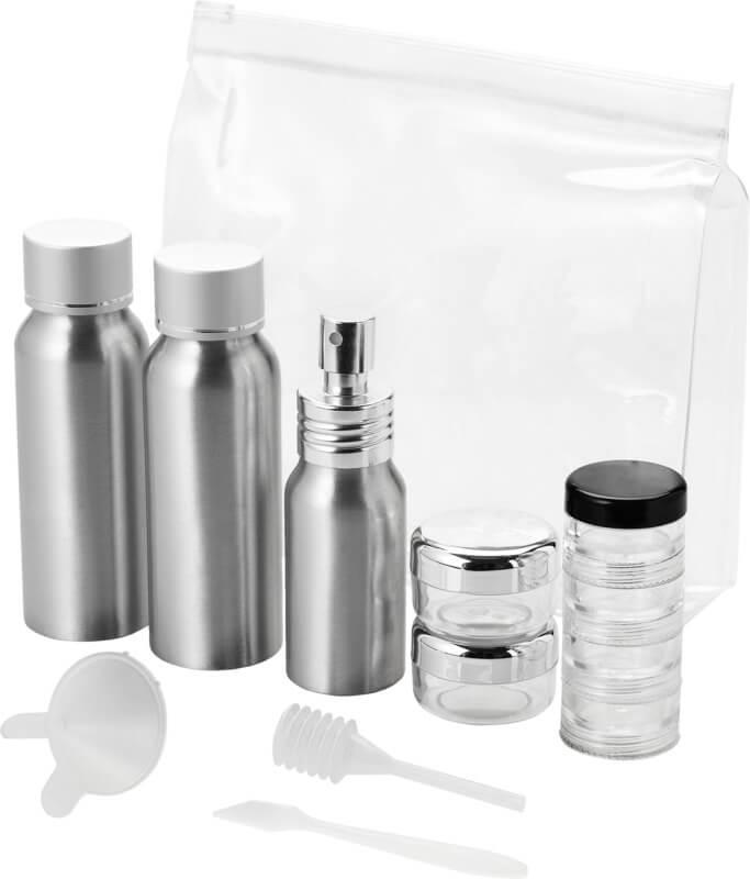Contém 2 frascos de alumínio de 80 ml, 1 pulverizador de alumínio de 30 ml, 2 frascos de 0,5 oz, 1 funil, uma espátula e um pulverizador. Os frascos e o funil são embalados num saquinho, separado da bolsa. A decoração não está disponível nos componentes.