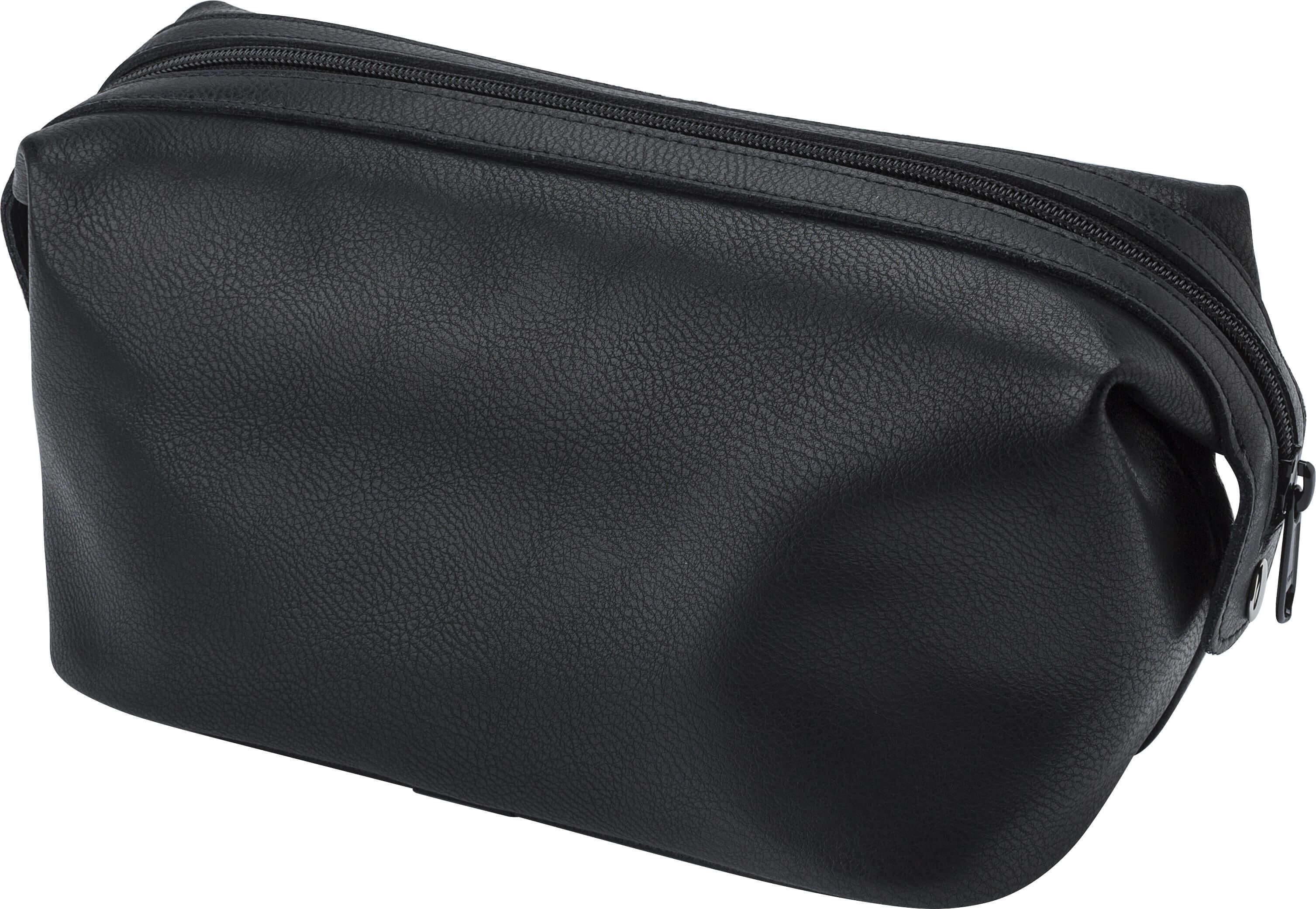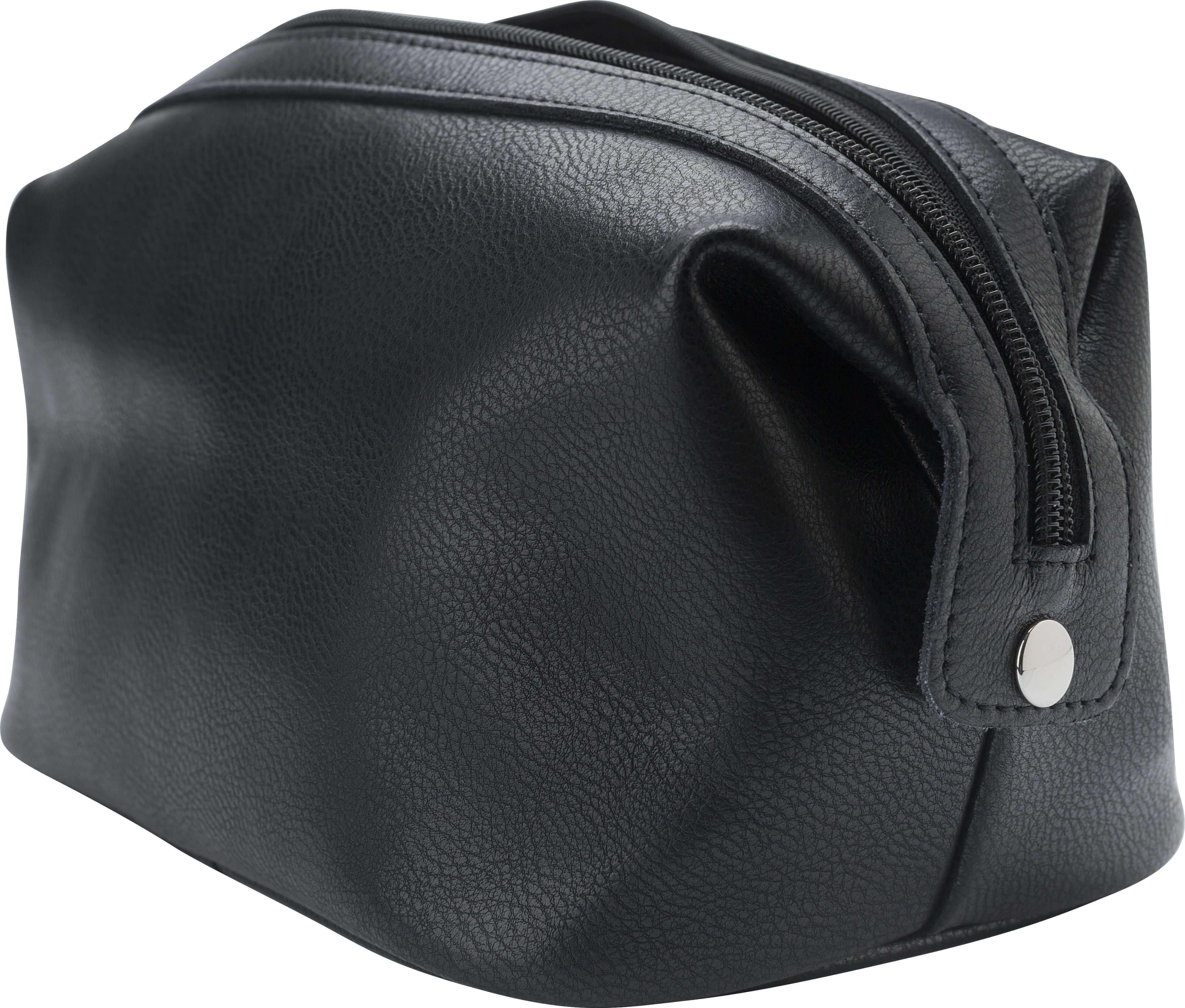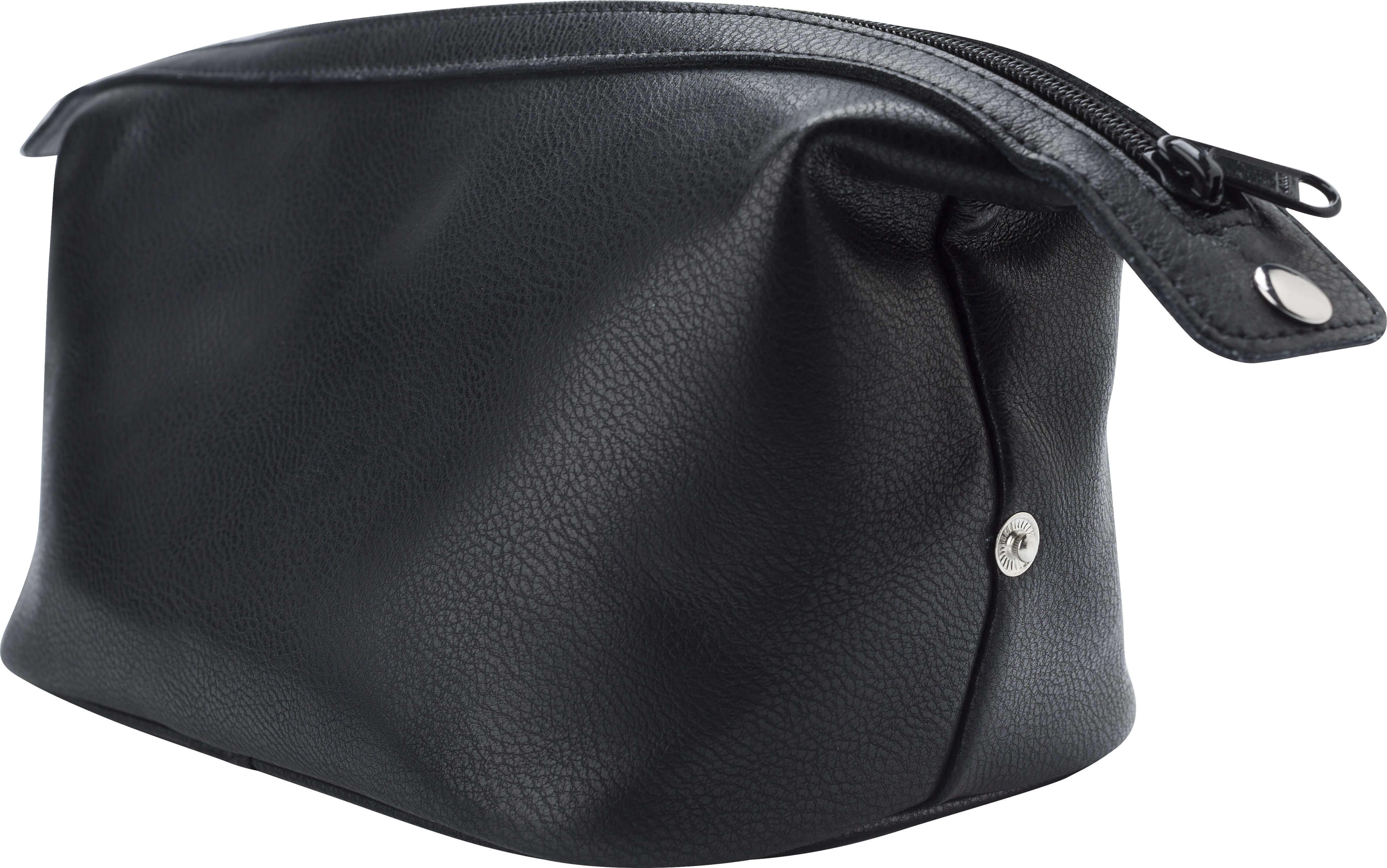 Necessaire em couro com fecho de correr. Dois botões laterais para estabilizar o saco.