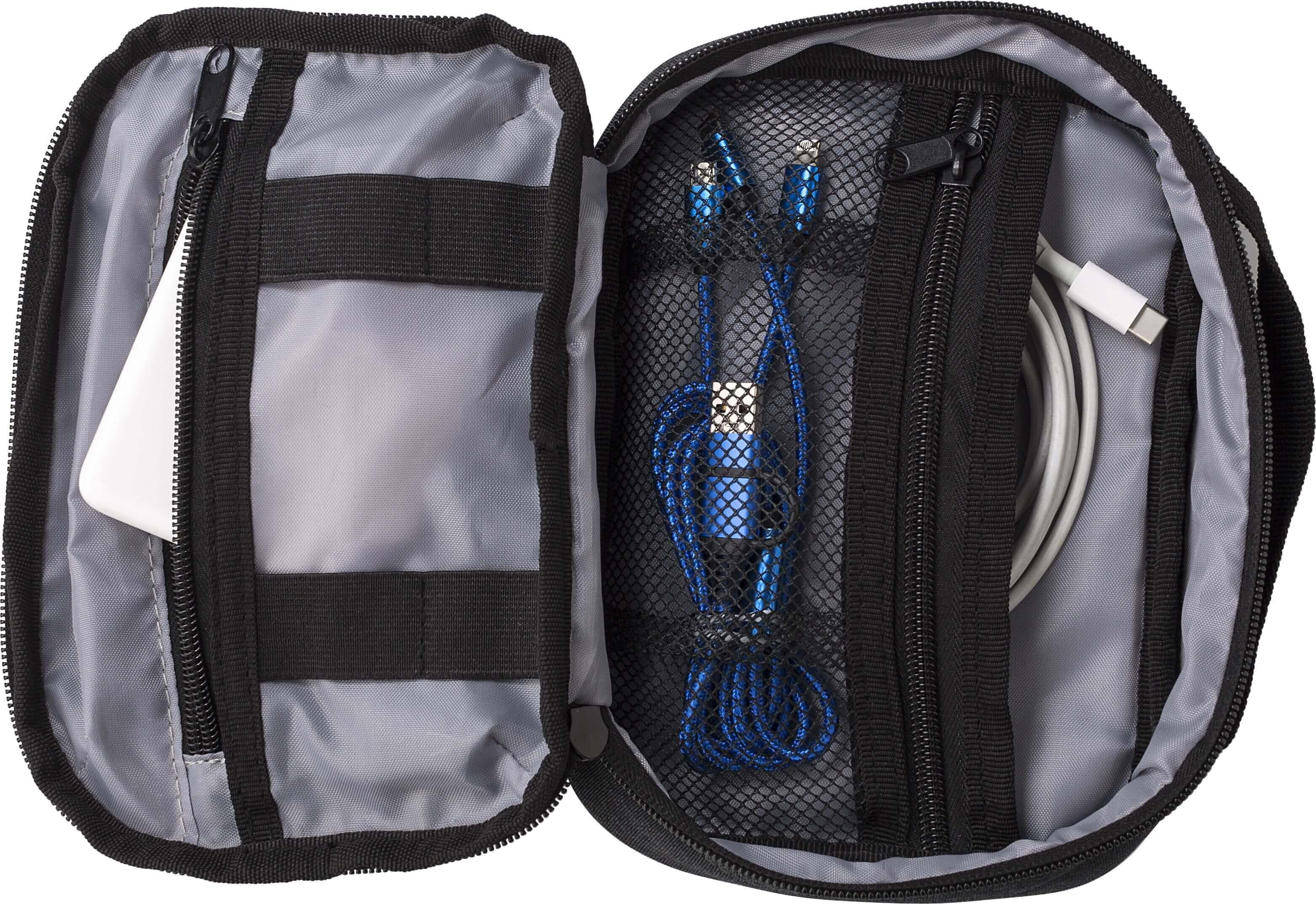 Necessaire de viagem em poliéster (600D) com alça de transporte curta. Um compartimento com vários bolsos para transportar cabos e documentos de viagem. Um pequeno bolso na parte da frente.