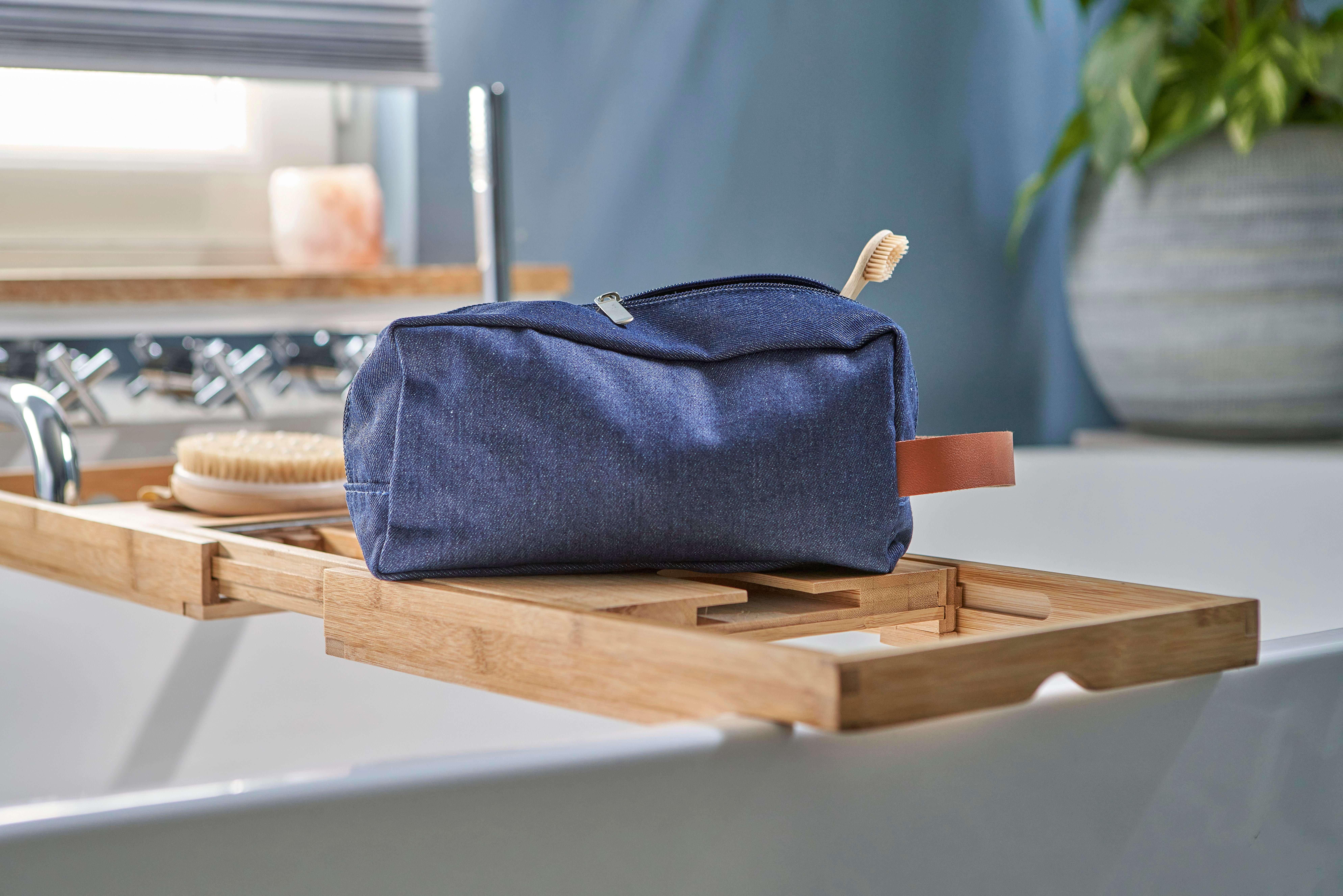 Necessaire jeans com detalhes de PU e fecho de correr. Alças de transporte curtas.