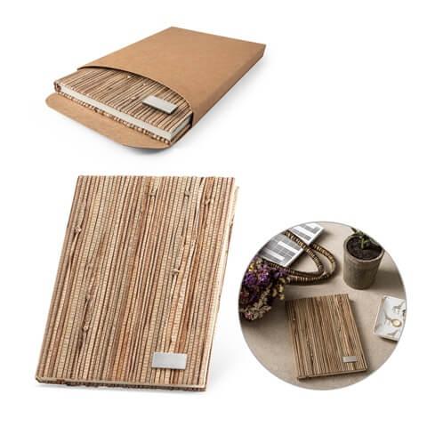 Bloco de notas A5 com capa rígida em palha natural, com placa em metal própria para personalização. Contém 192 páginas pautadas