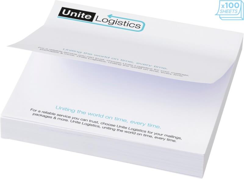 Notas adesivas Sticky-Mate® com papel autoadesivo de 80 g/m2. Papel de várias cores disponível. Impressão full color disponível em cada folha. 3 opções de numero de folhas (25/50/100 folhas).