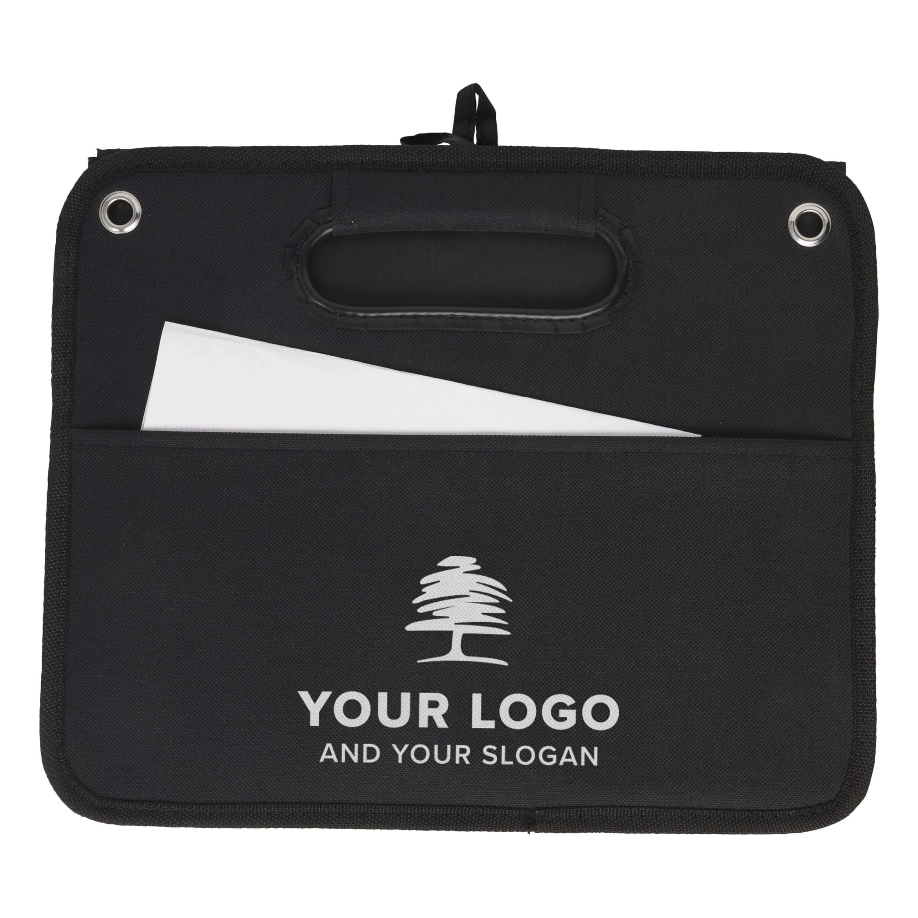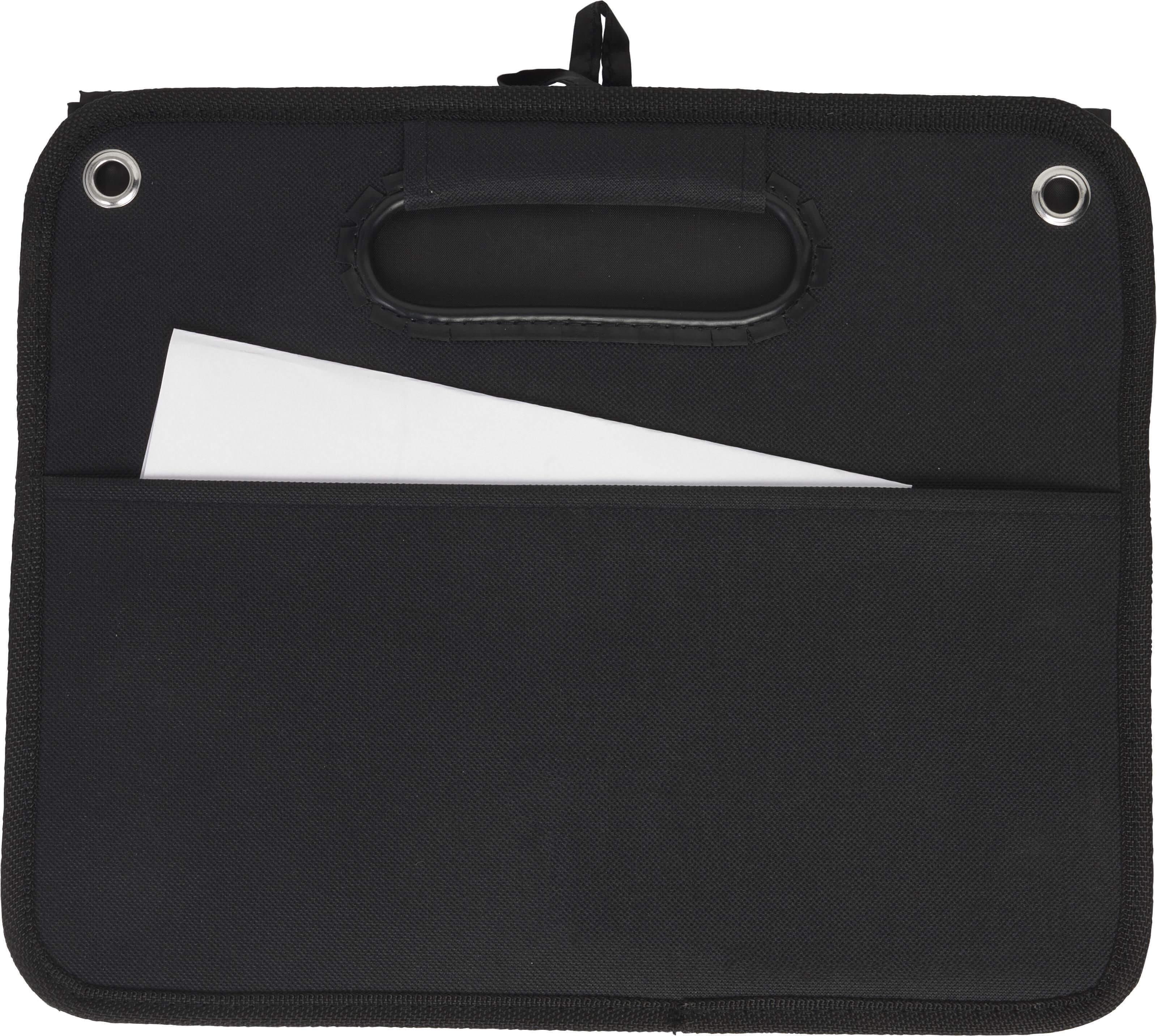 Organizador dobrável em preto para o carro com dois compartimentos. Com bolsos interiores e alças para transporte e colocação. Fecho de fita alástica de 2.5 cm.