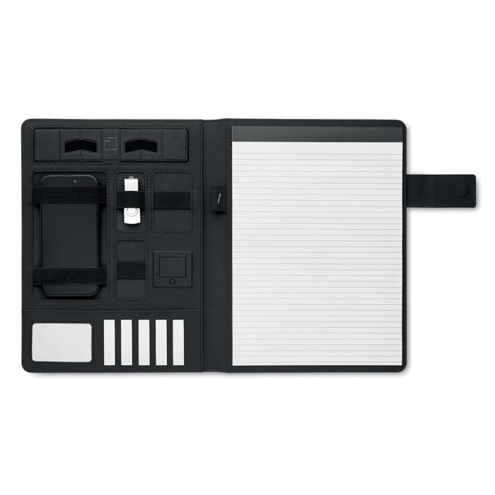 Pasta A4 com Powerbank sem fios. 5000 mAh. Poliéster 300D com forro PU e ABS. Carregamento sem fios até 15W. Saídas: USB-A 10W. Entrada: USB-A 18W. Bloco de notas pautado de 20 páginas incluído. Cabo USA-C para USA-C com adaptador USB-A incluído.