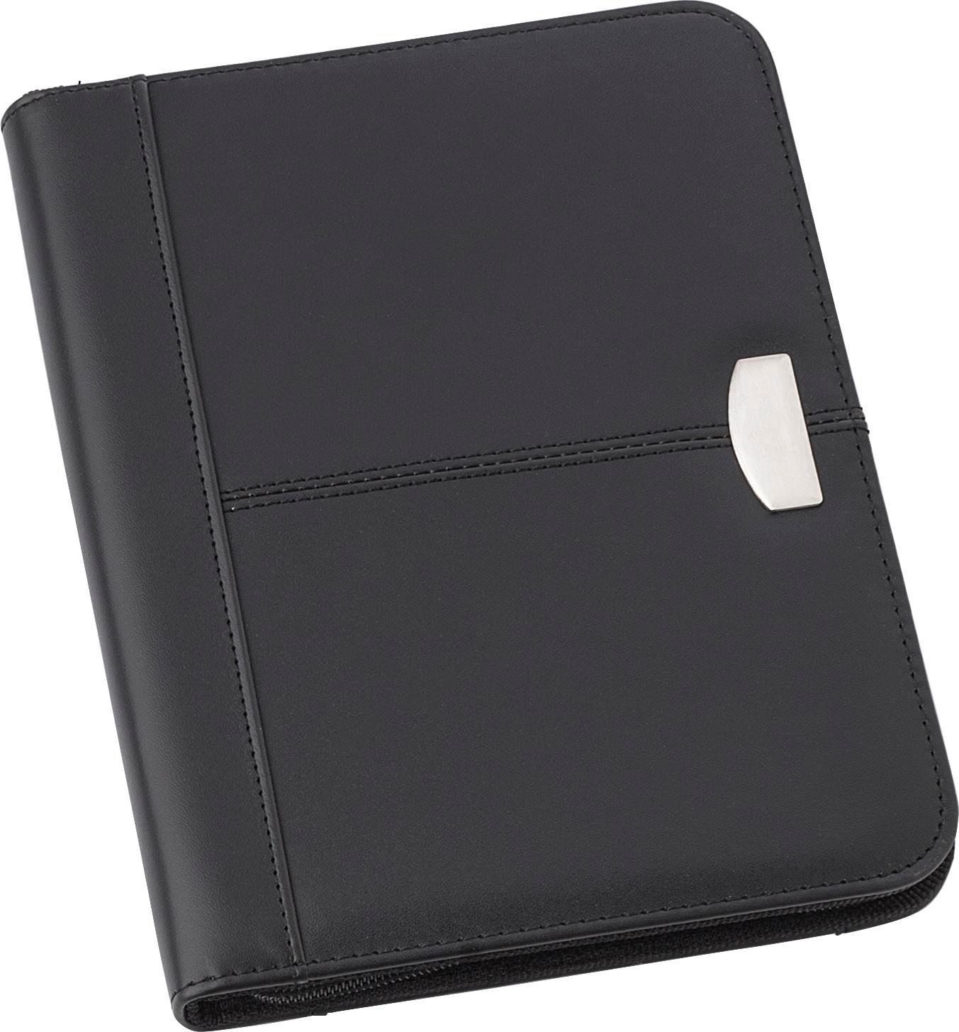 Pasta para documentos (aprox. A5) de pele regenerada com bloco de 30 folhas pautadas e fecho de correr. Esferográfica não incluída.