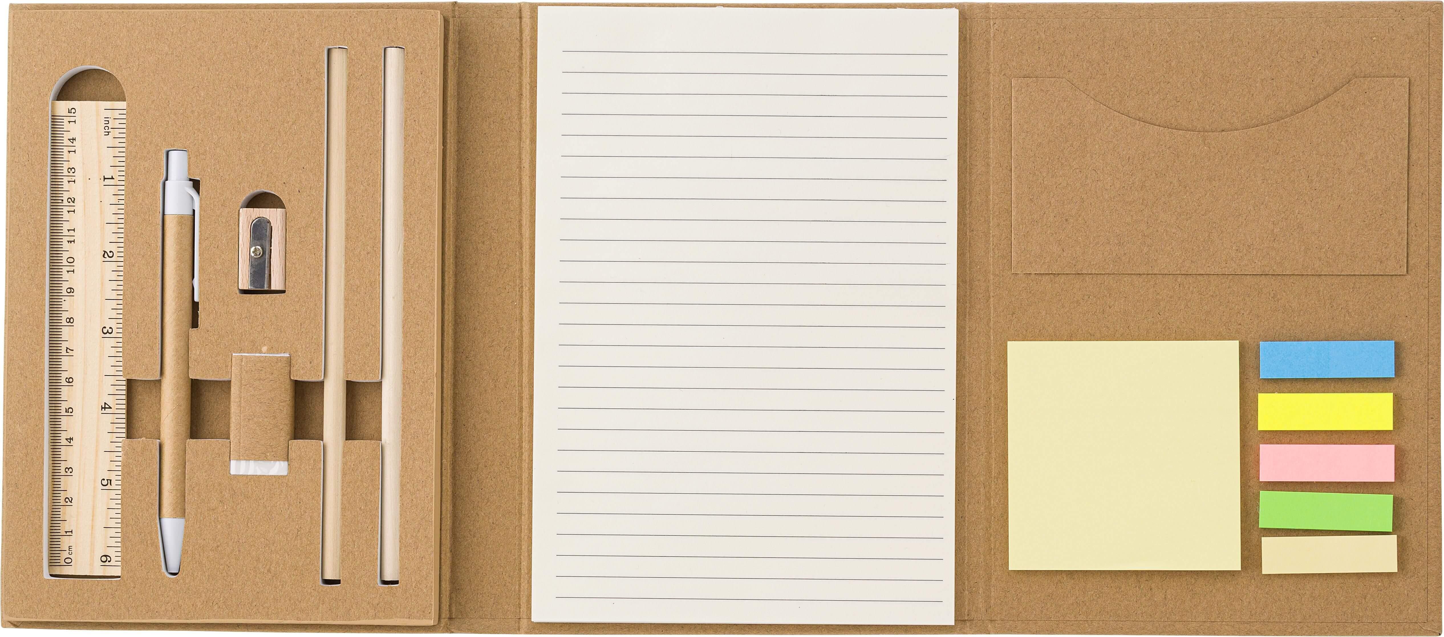 Pasta de cartão com material de escrita: bloco de 40 folhas, régua de bambu (15 cm),esferográfica de cartão com ponta, clipe de plástico e botão de pressão (tinta azul), dois lápis, apontador de lápis, borracha, notas (25 de cada cor) e bolso interno.
