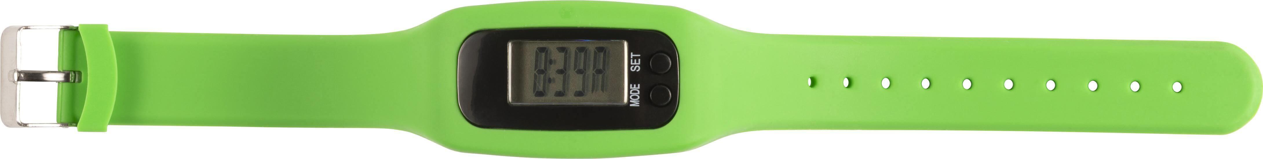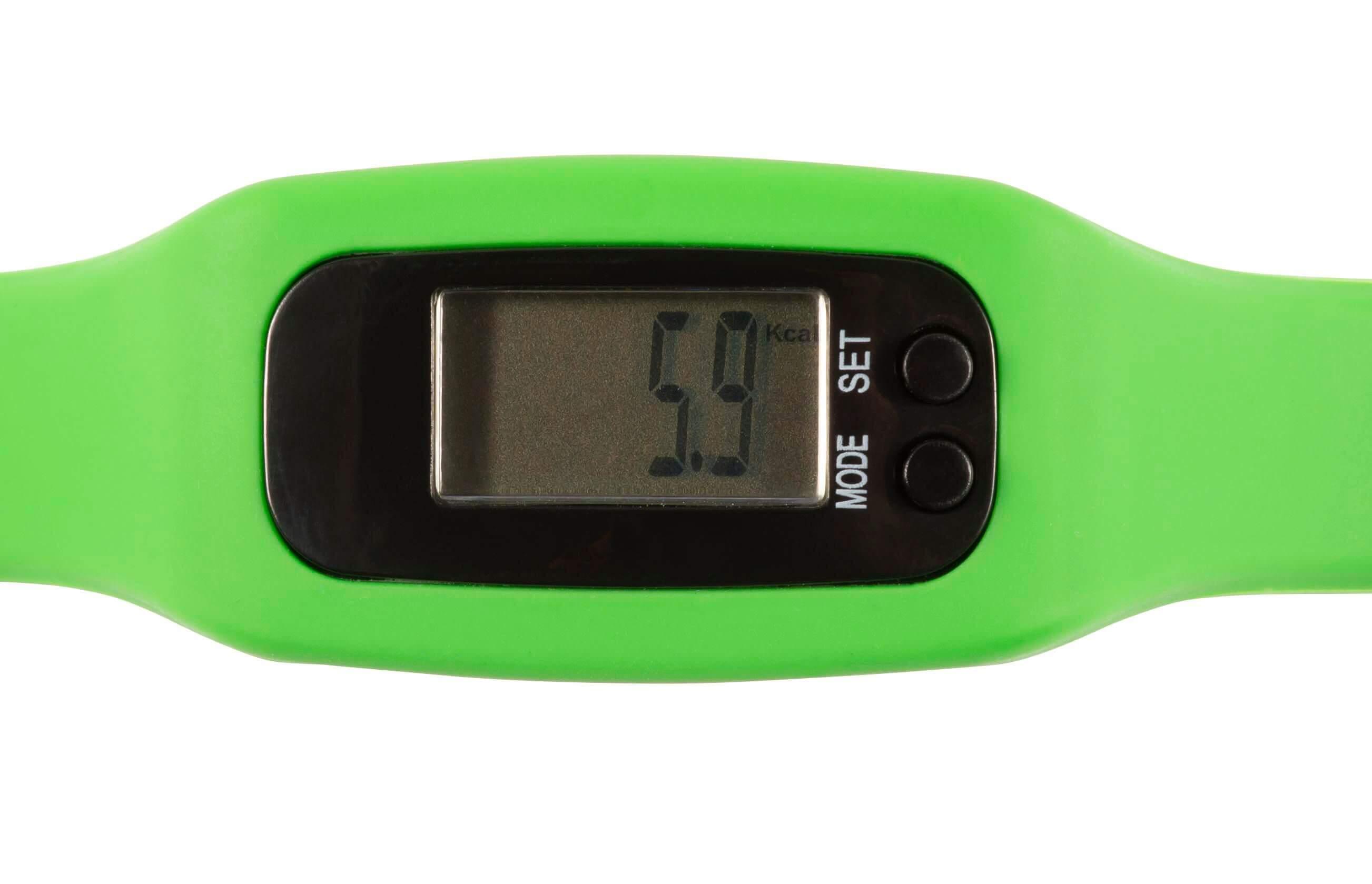 Pedómetro com pulseira em silicone. Regista o número de passos (até 99.999), calorias e milhas/km. Pilhas incluídas. DC 1,5V.