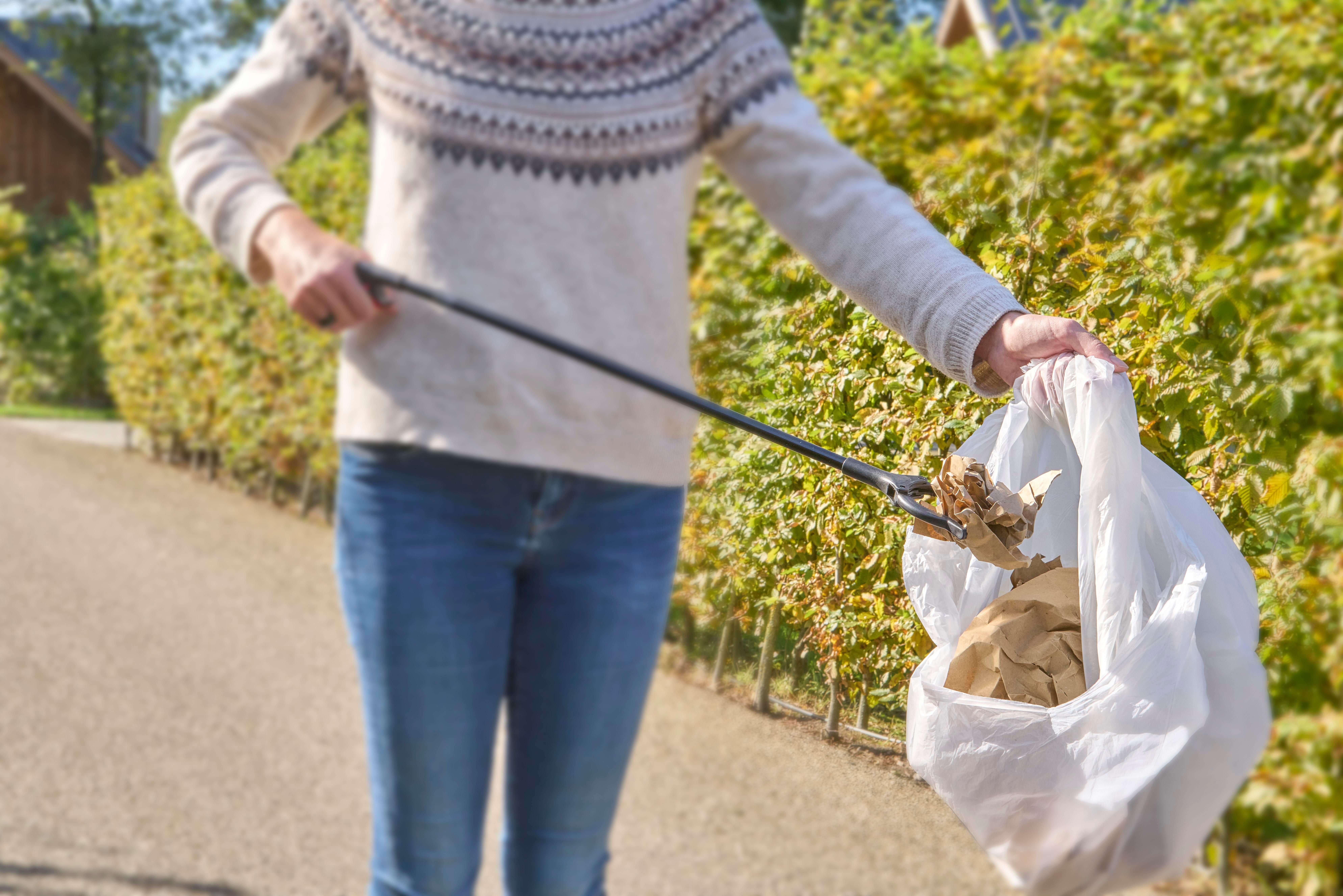 Pinça para recolher de (83 cm) com detalhe vermelho no punho. Tubo em aço e punho de plástico PP.