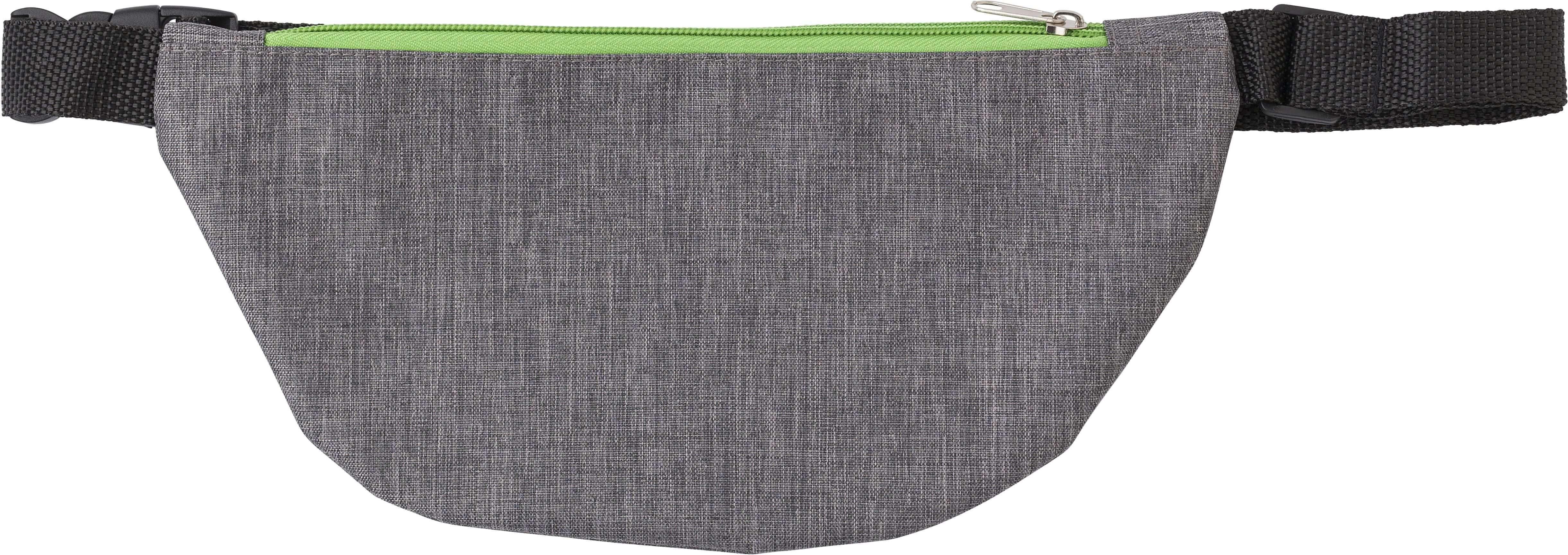 Pochete de poliéster (300D) com cintura ajustável. O saco tem um compartimento principal e um bolso frontal, ambos com um fecho de correr.