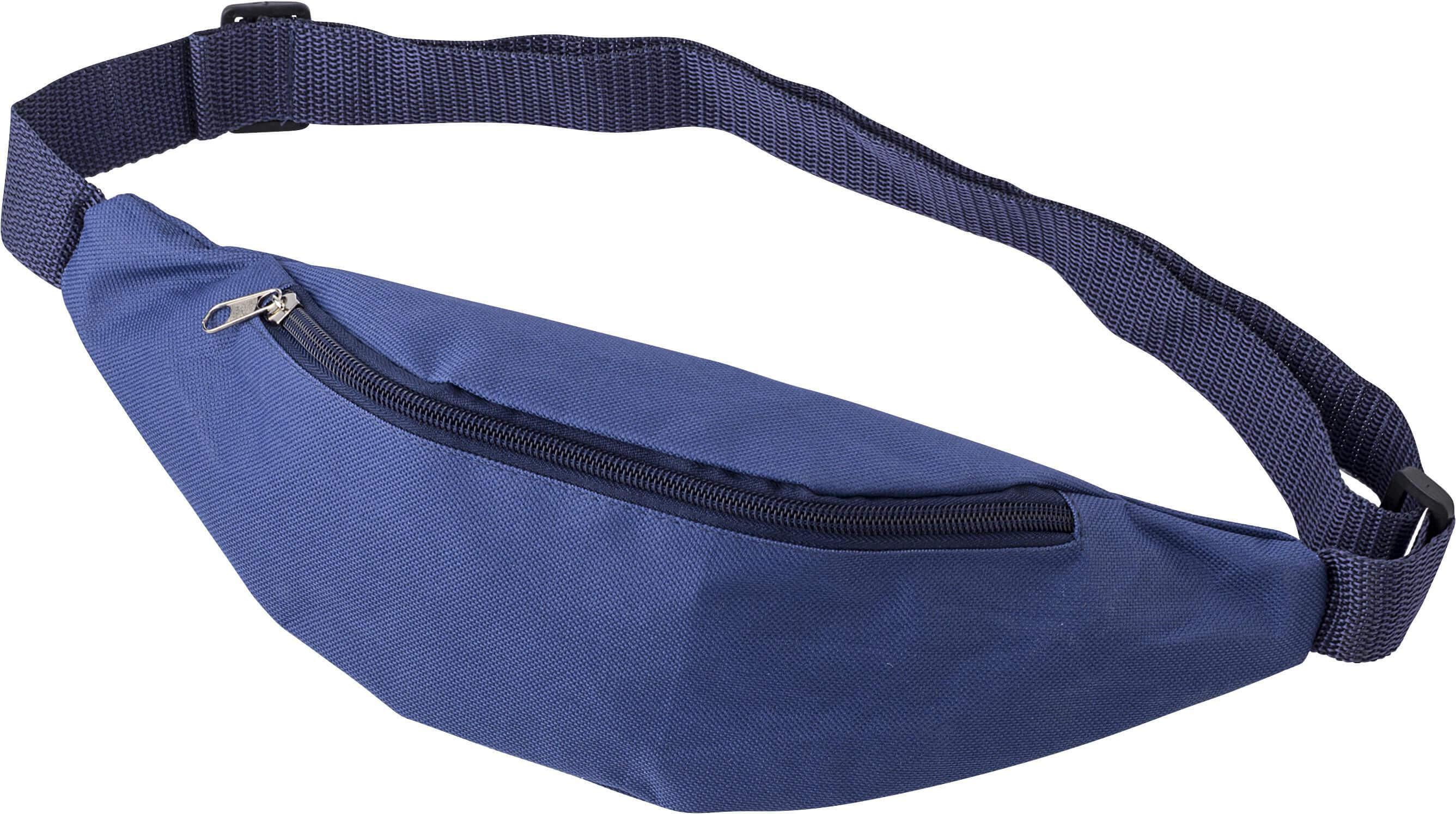 Pochete em tecido Oxford (600D). Possui um bolso com fecho de correr na frente e uma alça ajustável.