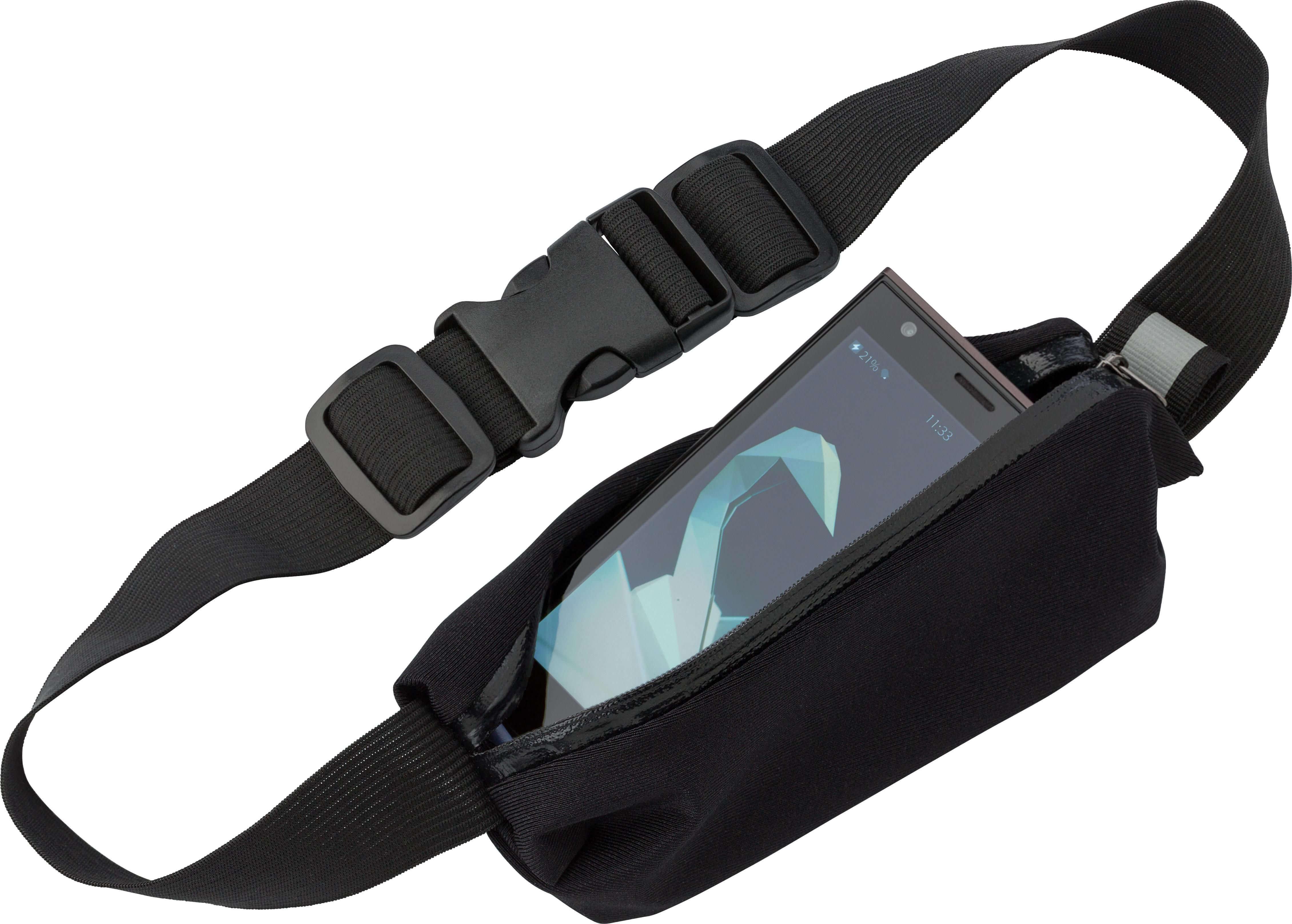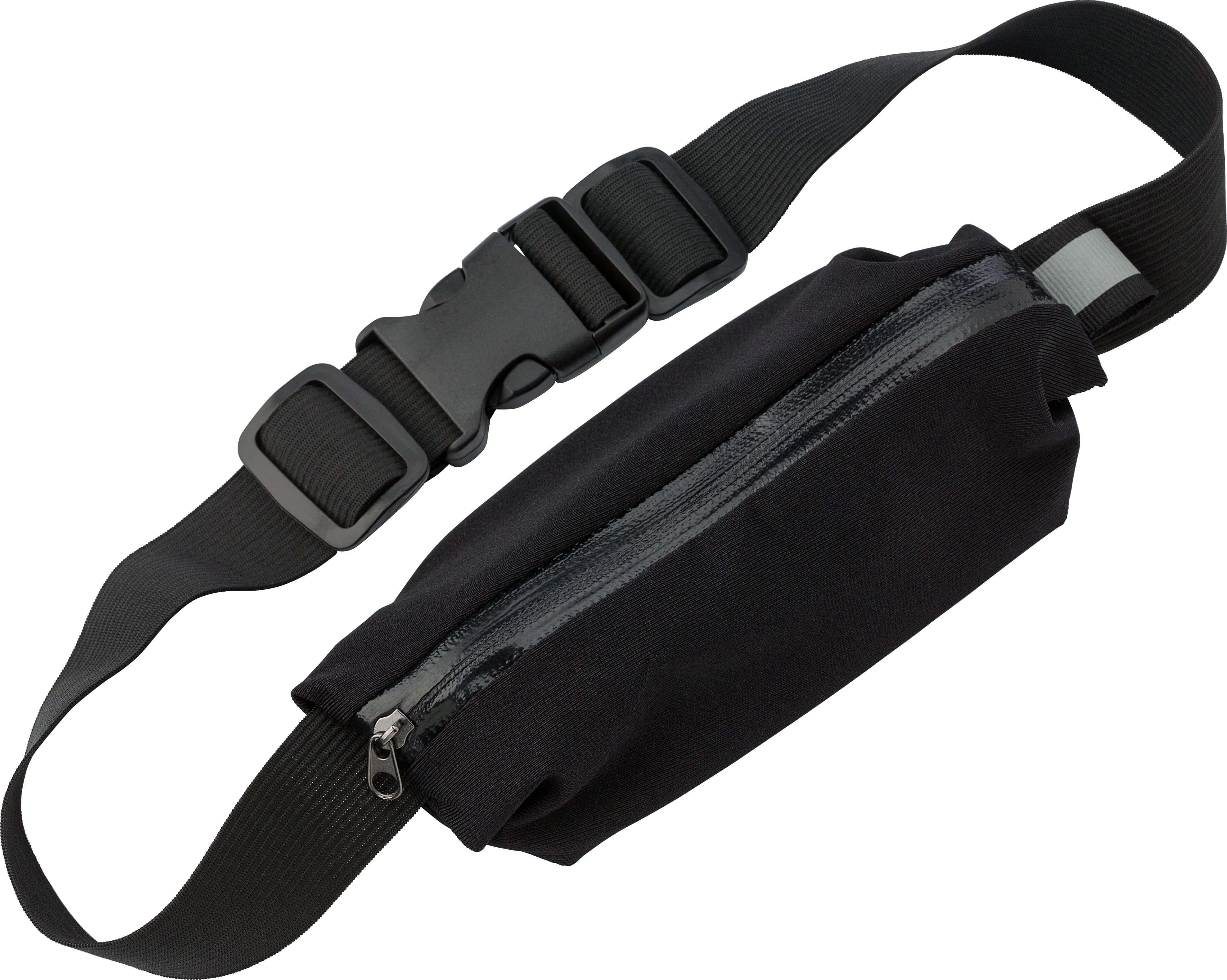 Pochete em neoprene, com fecho de correr, elástico ajustável em ambos os lados (2x27cms) e fecho em plástico preto. O interior da pochete está revestido para que seja impermeável.