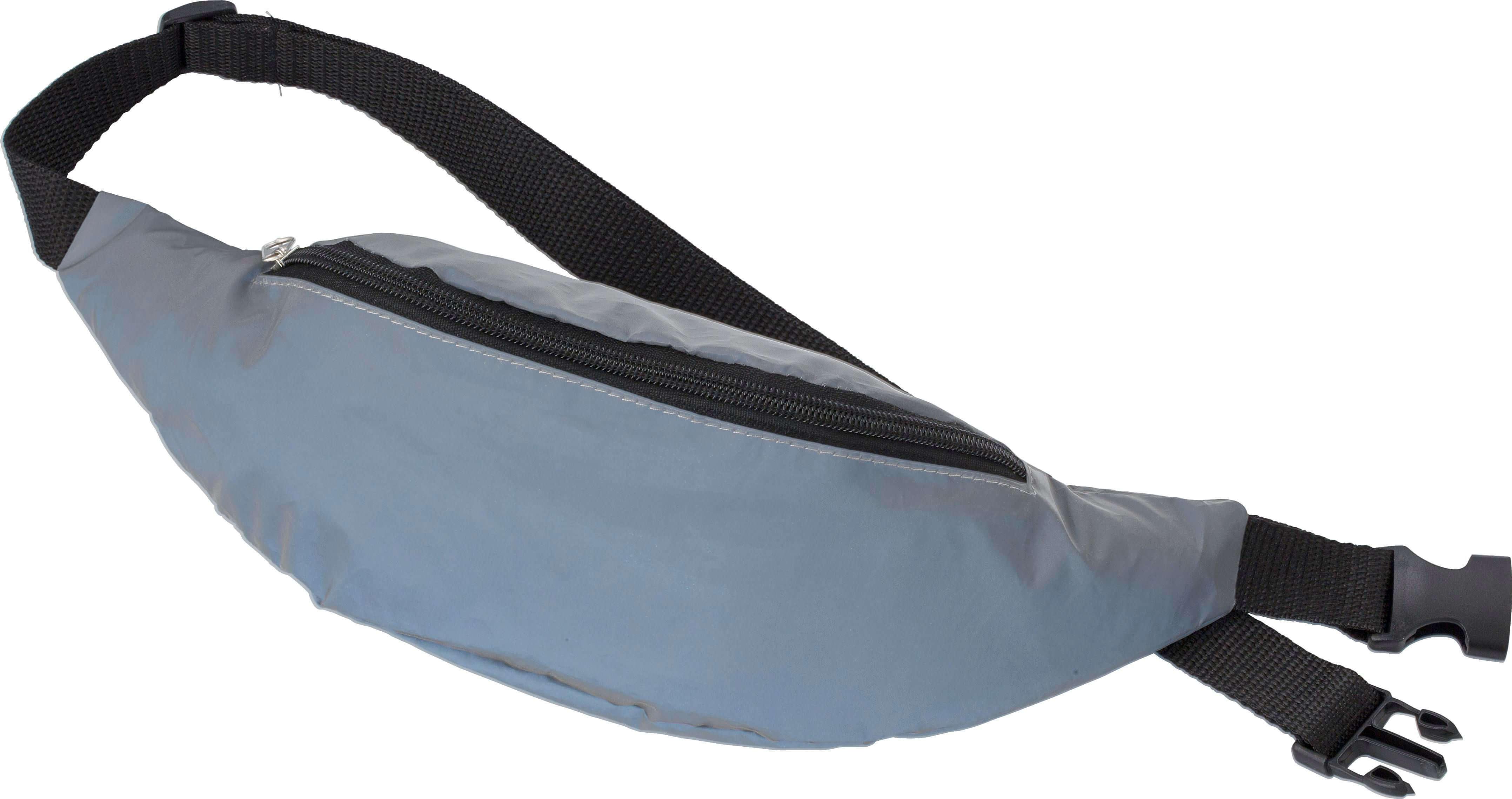 Pochete reflectora em poliéster com fecho de correr e cinta ajustável.