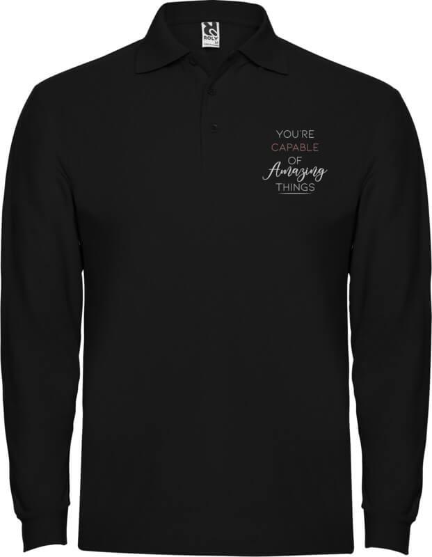 Polo de manga comprida com gola e punhos canelados, carcela de três botões e punhos canelados em elastano 1×1. Tapa costuras reforçada na gola. Bolso opcional. Etiqueta amovível. O modelo tem 190 cm e está a usar o tamanho L.