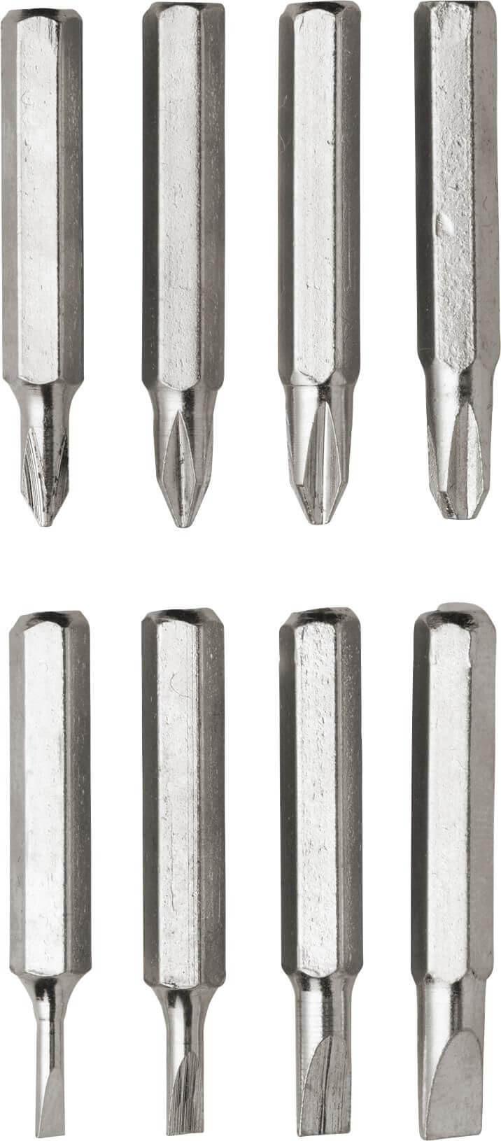 Suporte de metal em forma de esferográfica com 8 chaves de fendas e uma lanterna com 3 luzes LED e porta-chaves, apresentado em caixa de oferta. Pilhas incluídas.