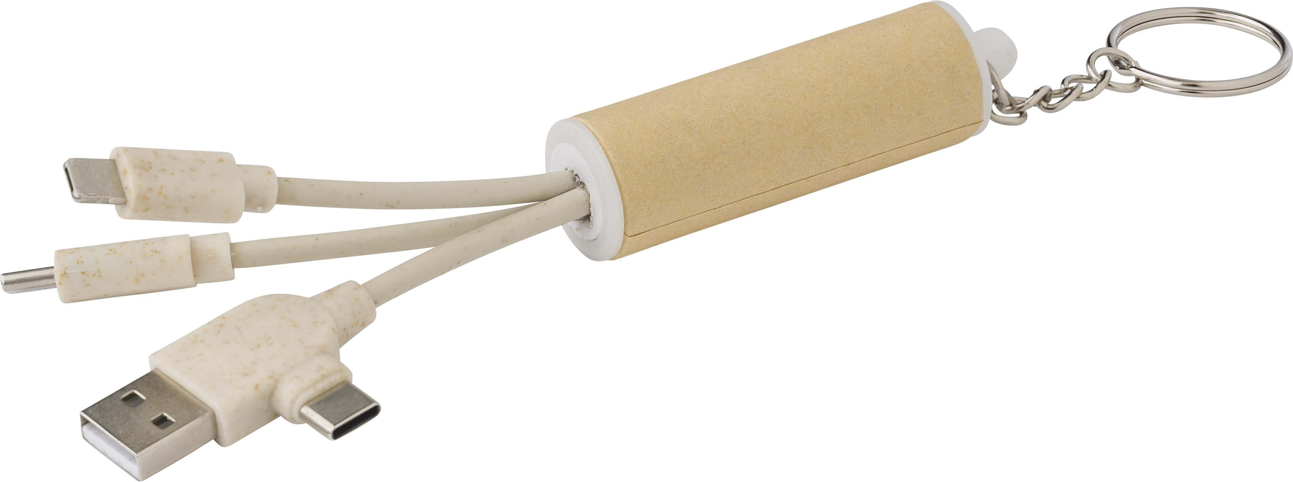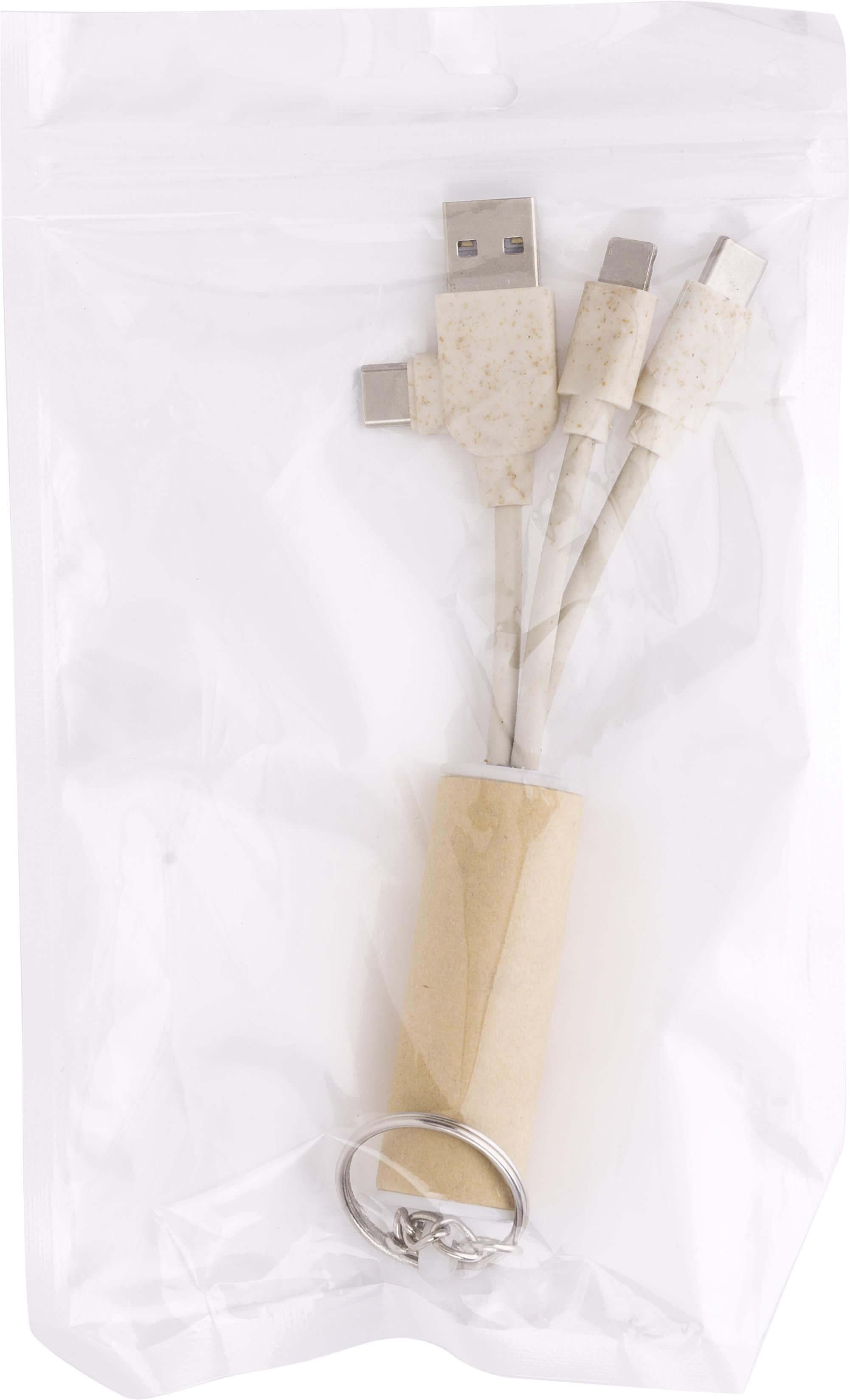 Conjunto de cabos e porta-chaves, fabricados em cartão e ABS. Com USB-C, micro-USB e lightning. Cabos em algodão e terminais em palha de trigo. Embalados individualmente numa caixa de cartão castanha.