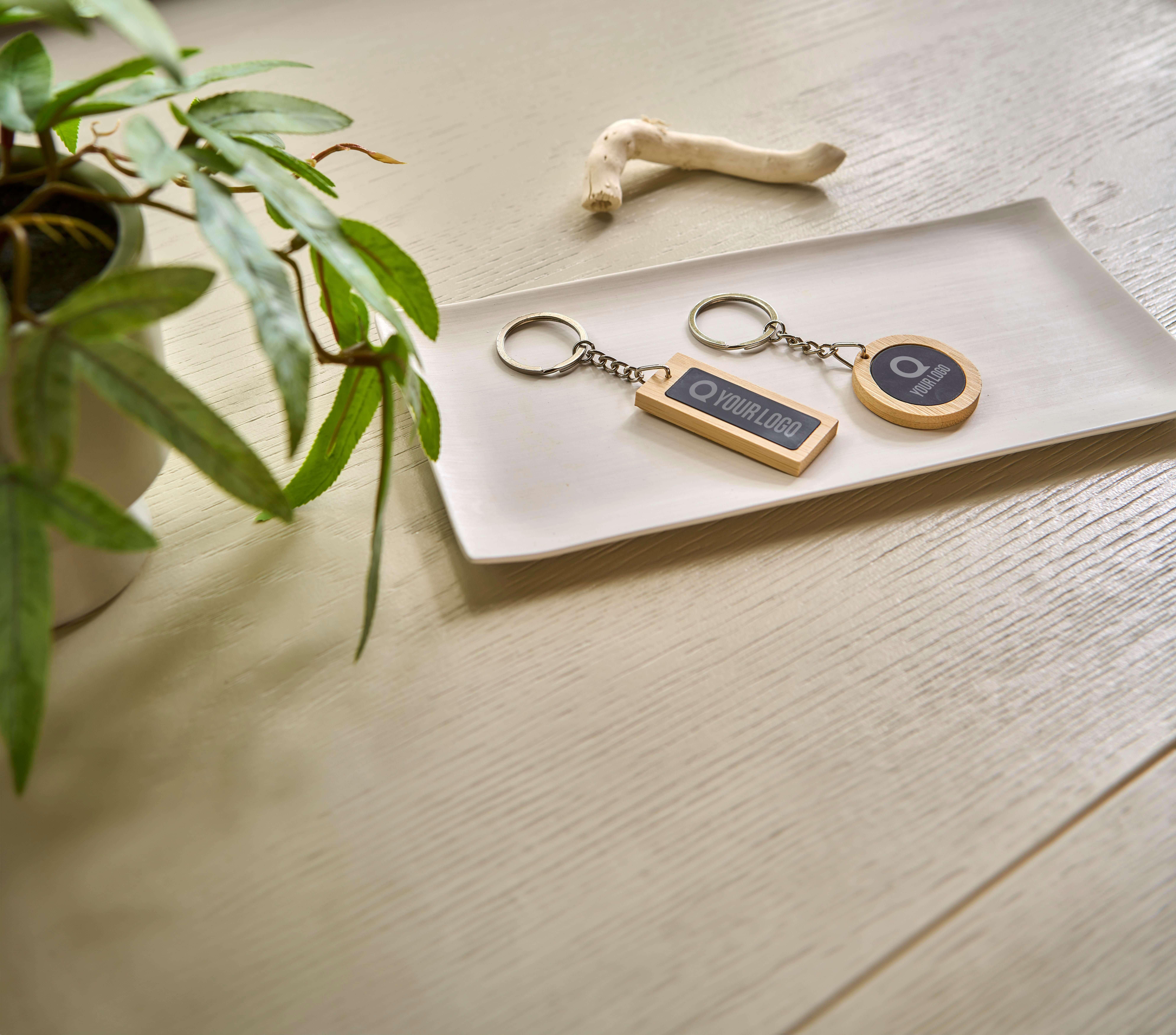 Porta-chaves em bambu com uma placa de gravação em aço inoxidável revestida a borracha preta no interior, de forma redonda. A cor após a gravação é cromada brilhante. Apresentado individualmente num envelope de cartão castanho.
