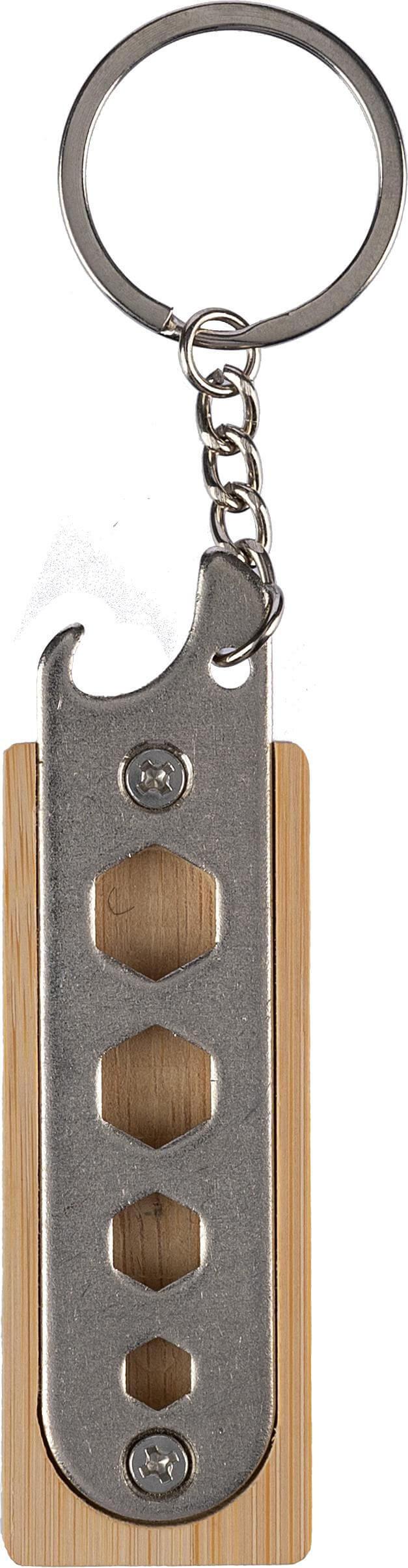 Porta-chaves de bambu com abridor de garrafas, incluindo 4 ferramentas de chave inglesa dentro. Embalado individualmente em uma caixa de papelão marrom com desenho de uma cor.