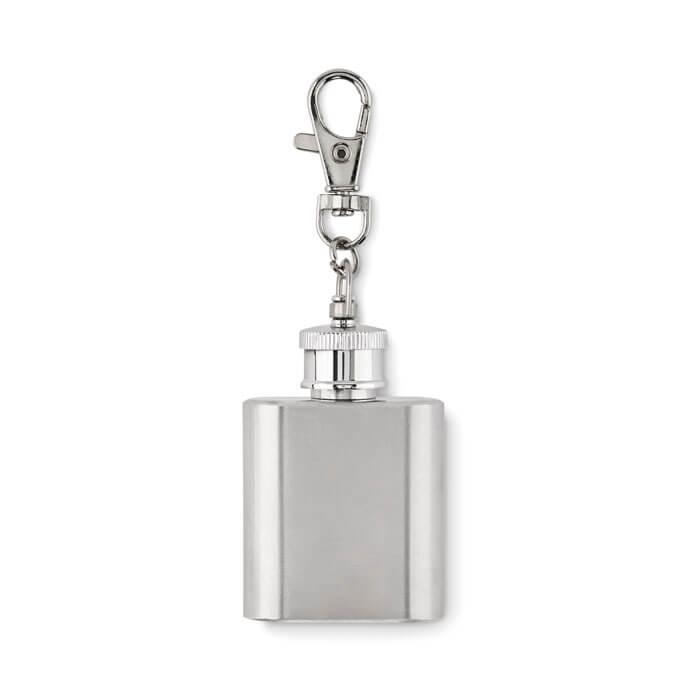 Porta-chaves com frasco em aço inoxidável. Capacidade: 28 ml.
