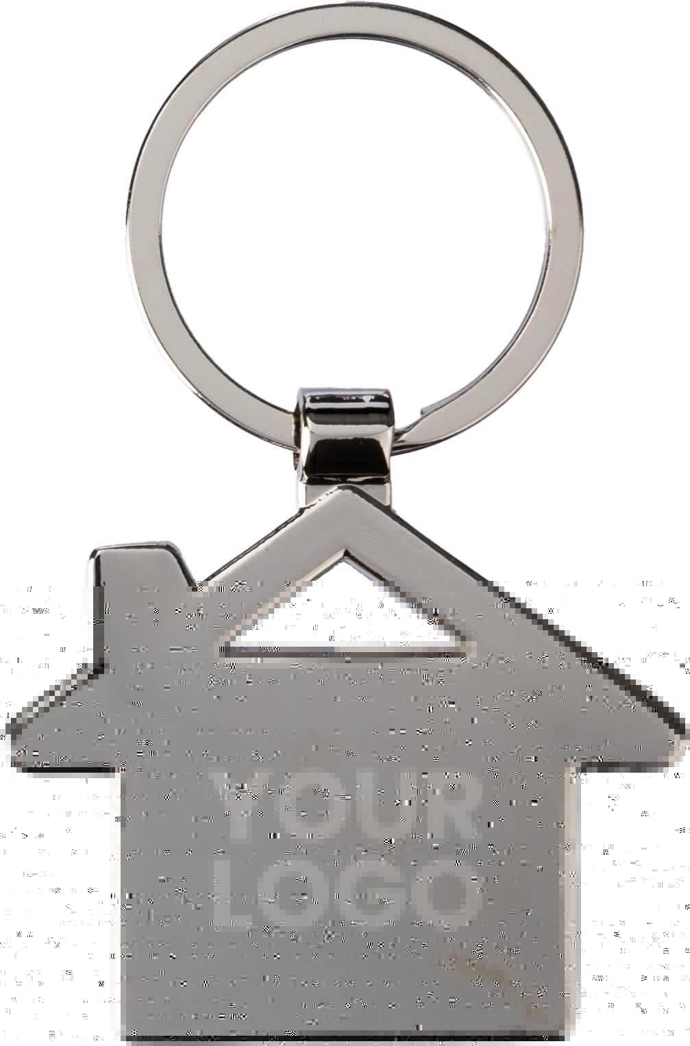 Porta-chaves de liga de zinco com detalhe de casa de bambu e anel de metal. Buraco no topo. Embalado individualmente em uma manga kraft marrom.