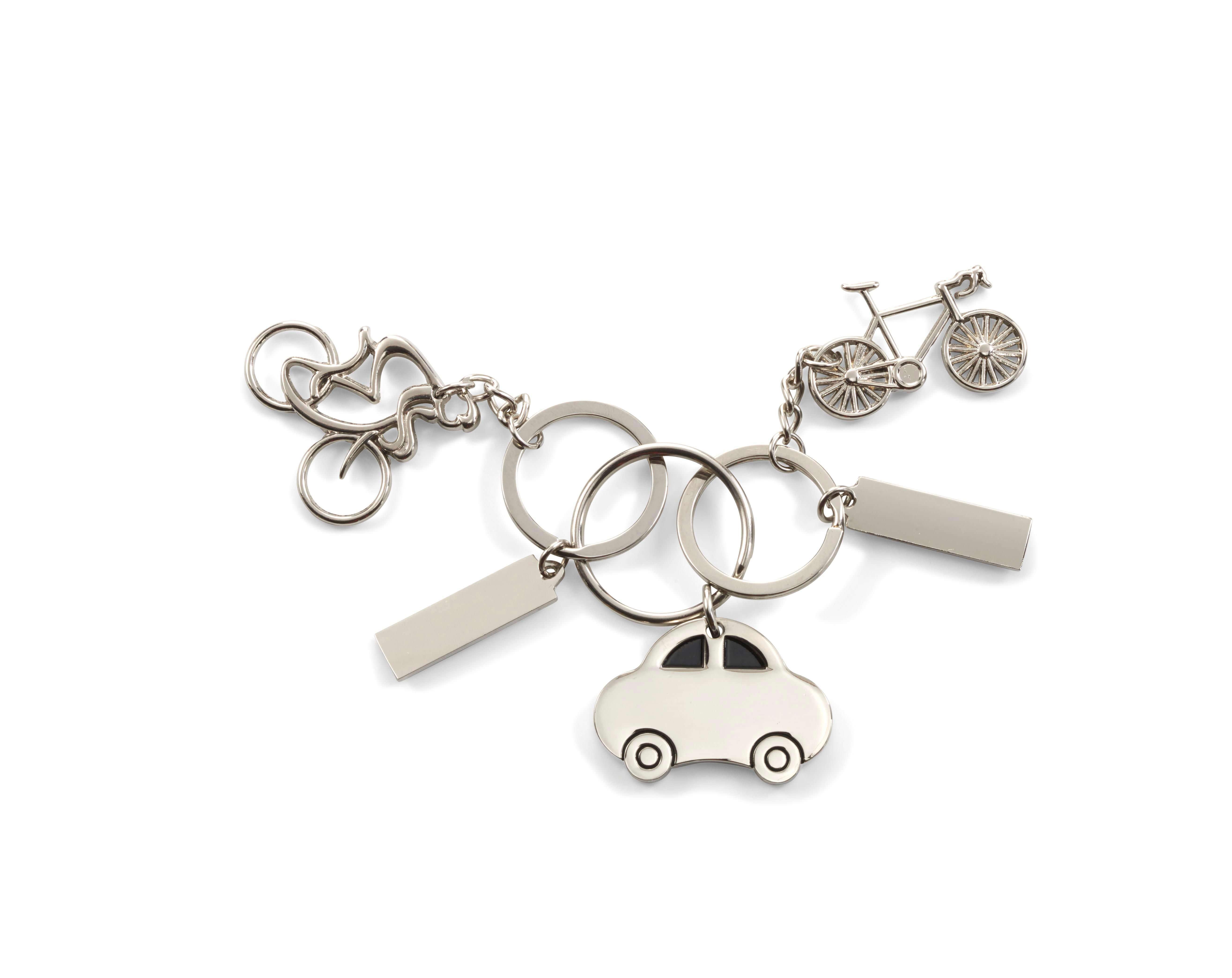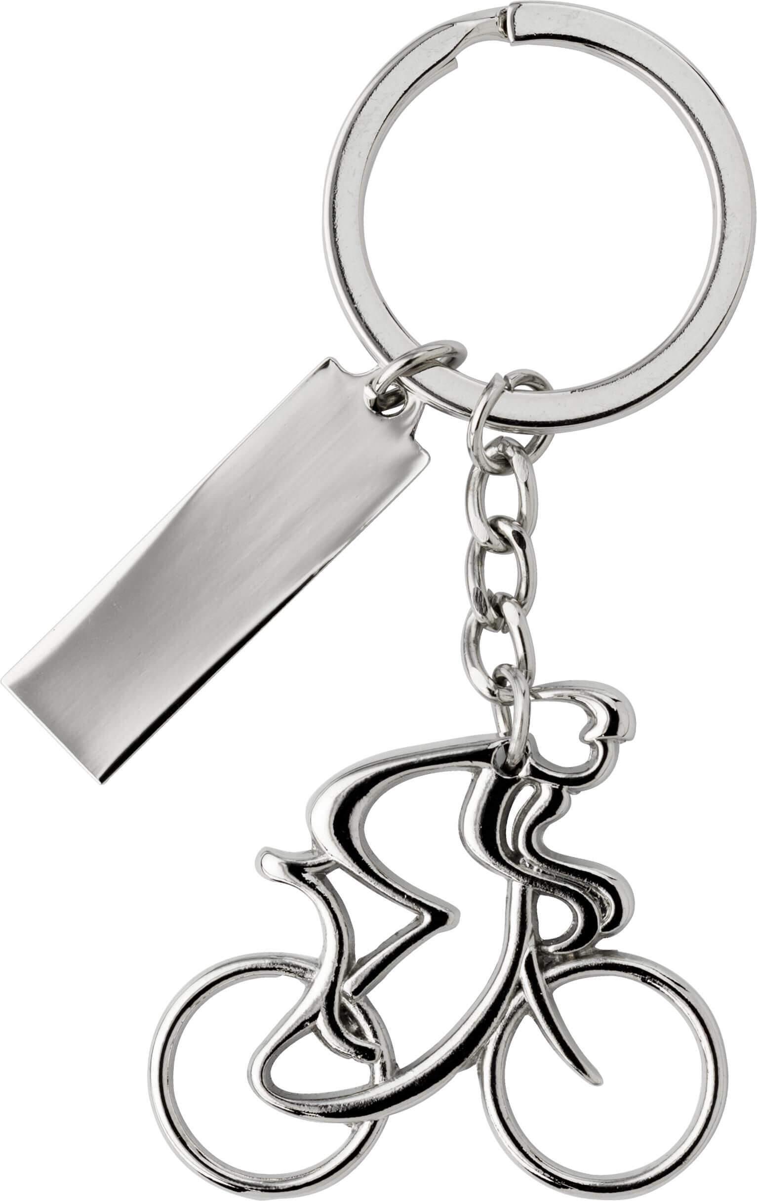 Porta-chaves em forma de ciclista. Inclui uma placa retangular para personalização. Apresentado em caixa de oferta.
