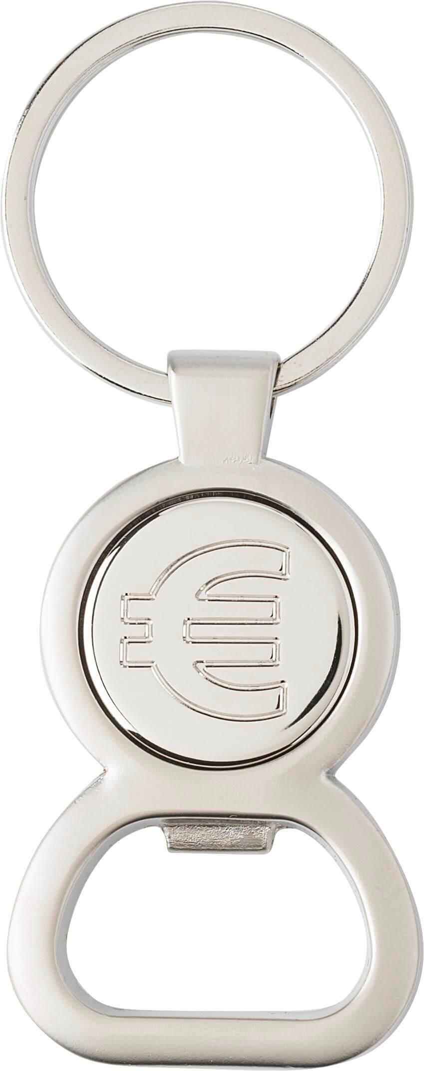 Porta-chaves de metal com abre-cápsulas e cópia de moeda de 0,50 Euro no centro. Apresentação em caixa de oferta.