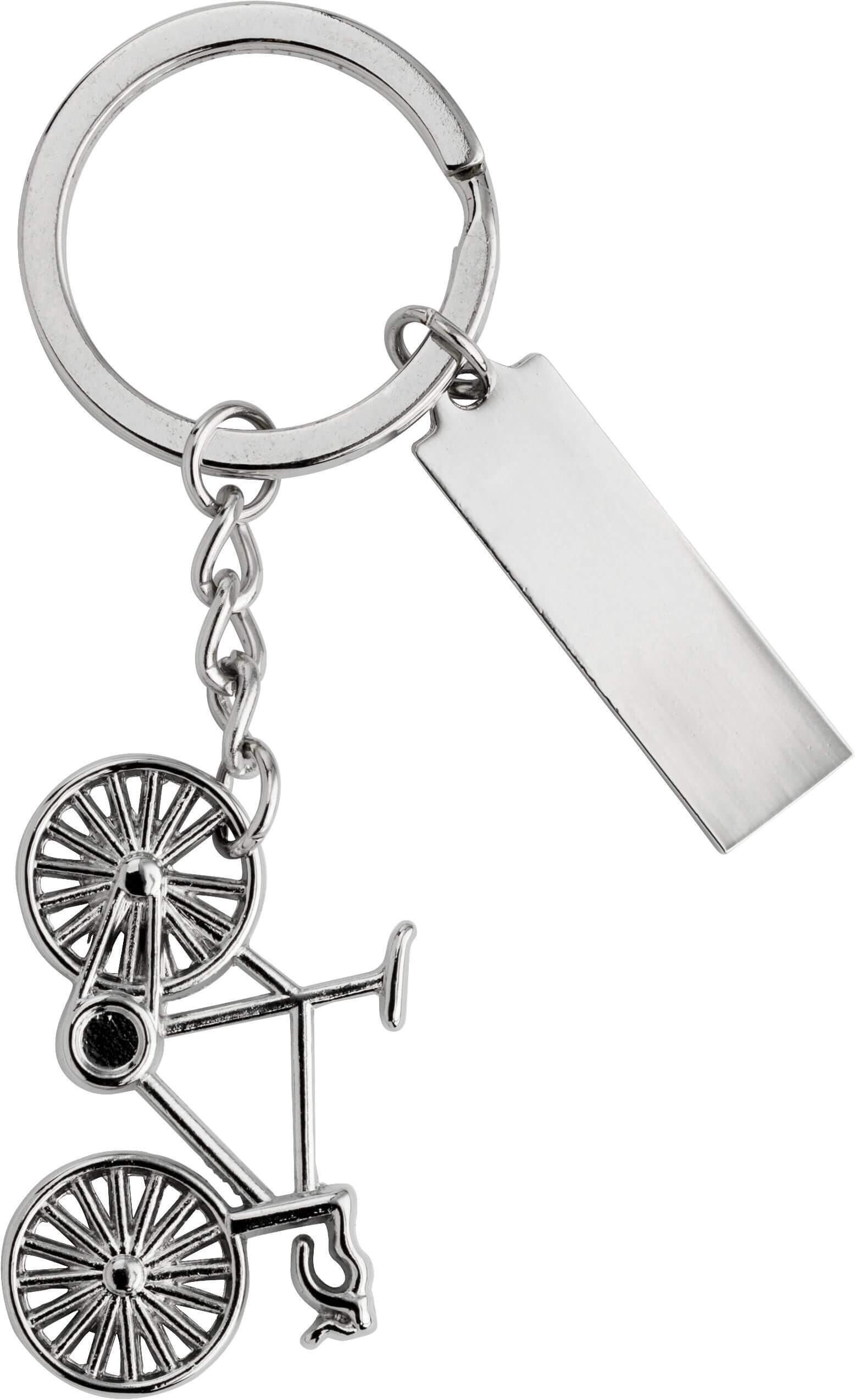 Porta-chaves em forma de bicicleta. Inclui uma placa retangular para personalização. Apresentado em caixa de oferta.