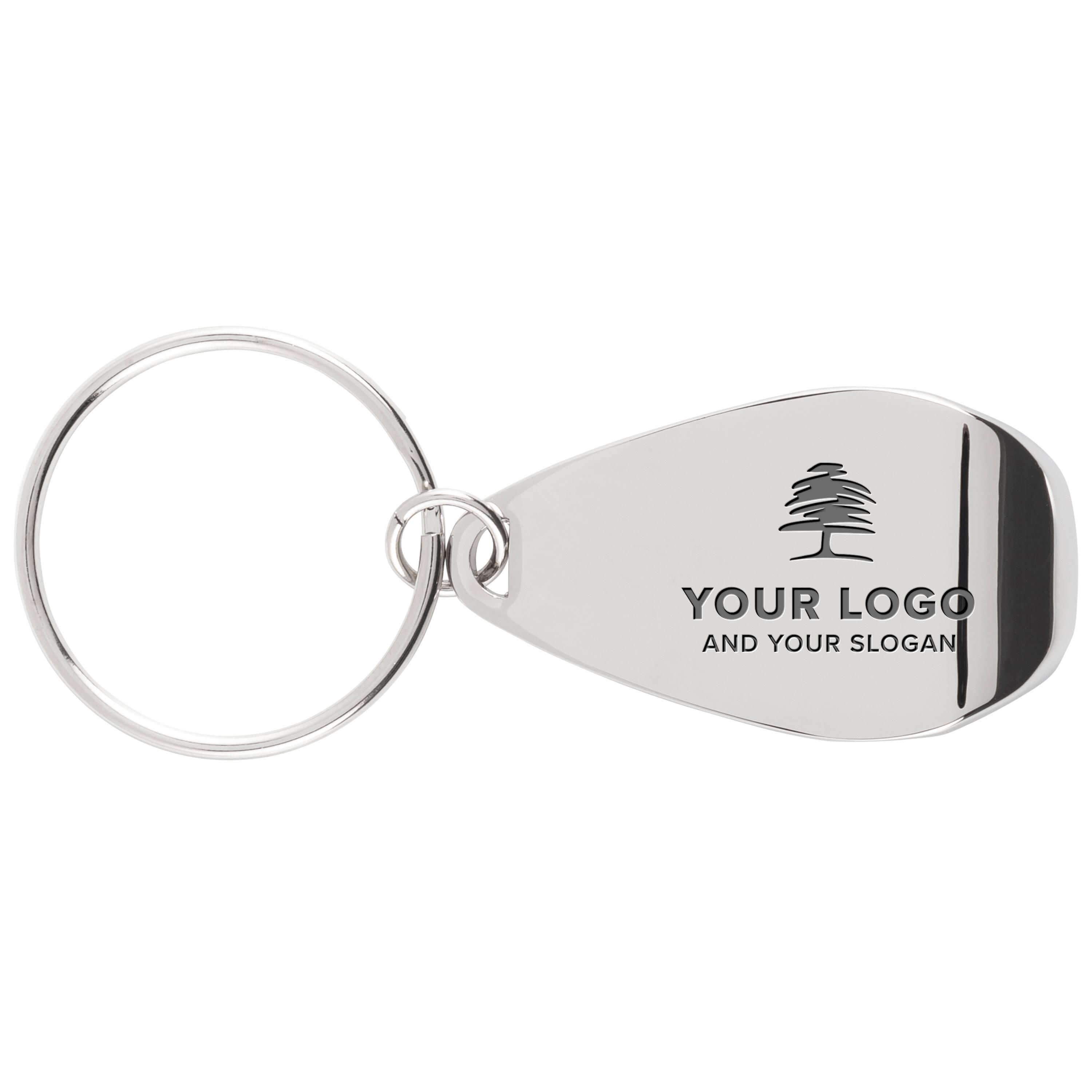 Porta-chaves e abre-cápsulas de metal apresentado em caixa de oferta.