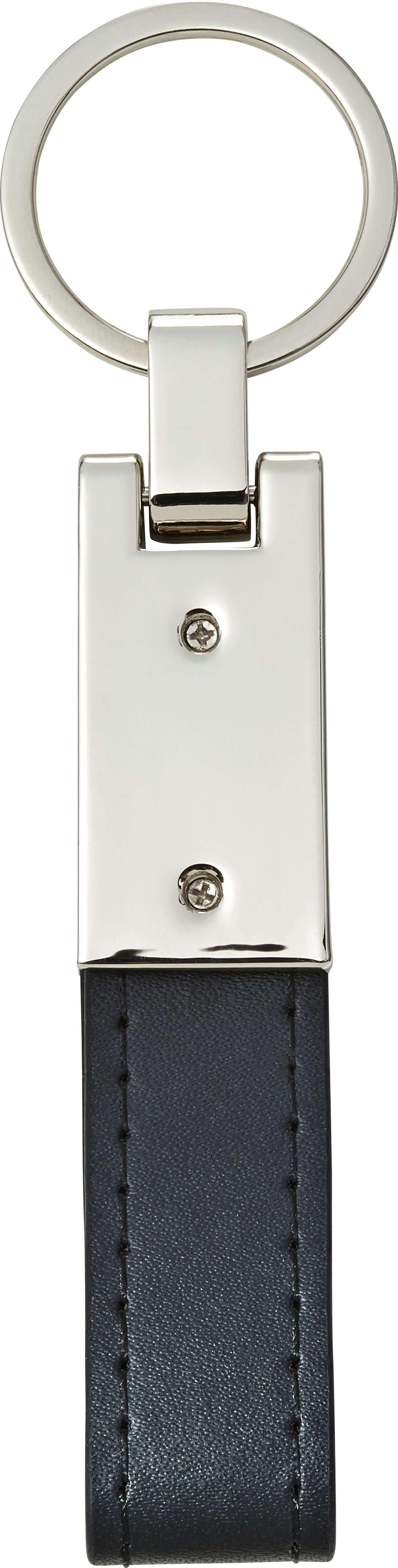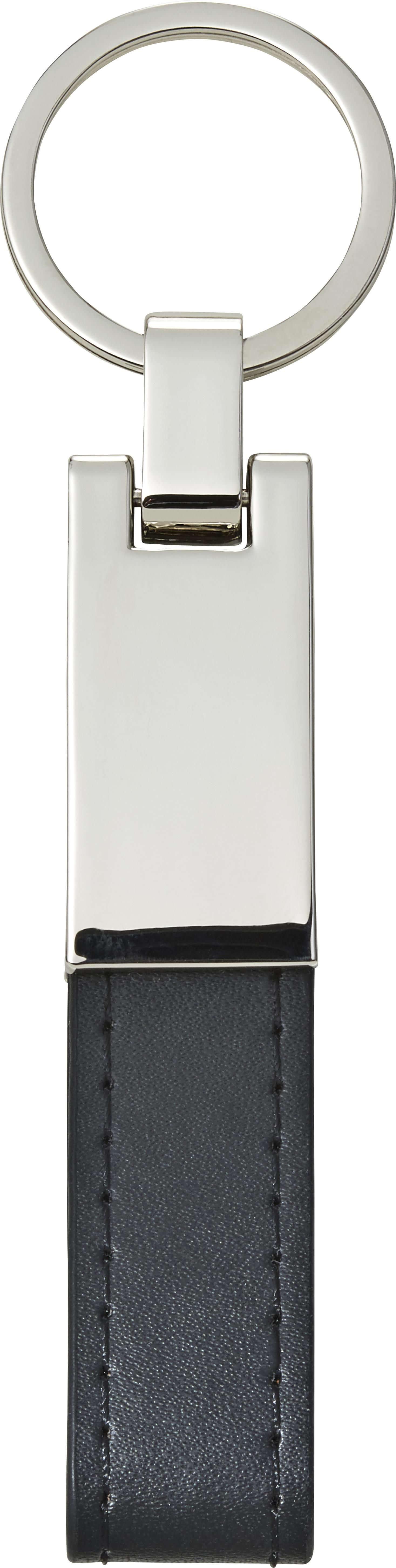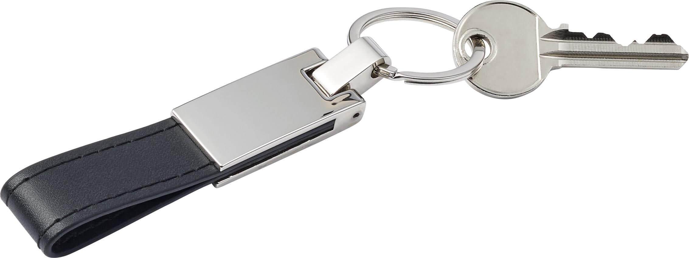 Porta-chaves em aço com revestimento em prata, com fita em PU. Apresentado em caixa de oferta preta.