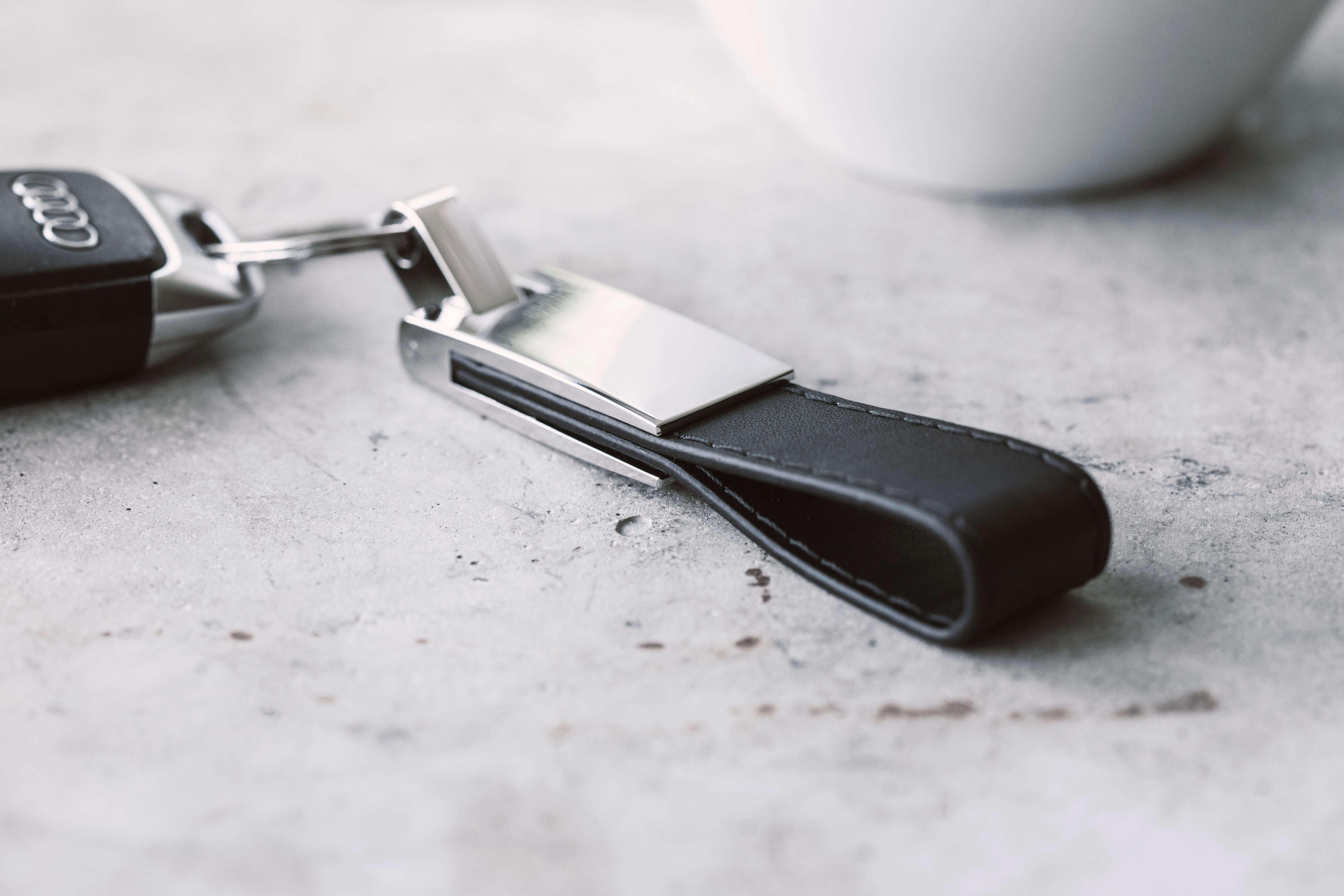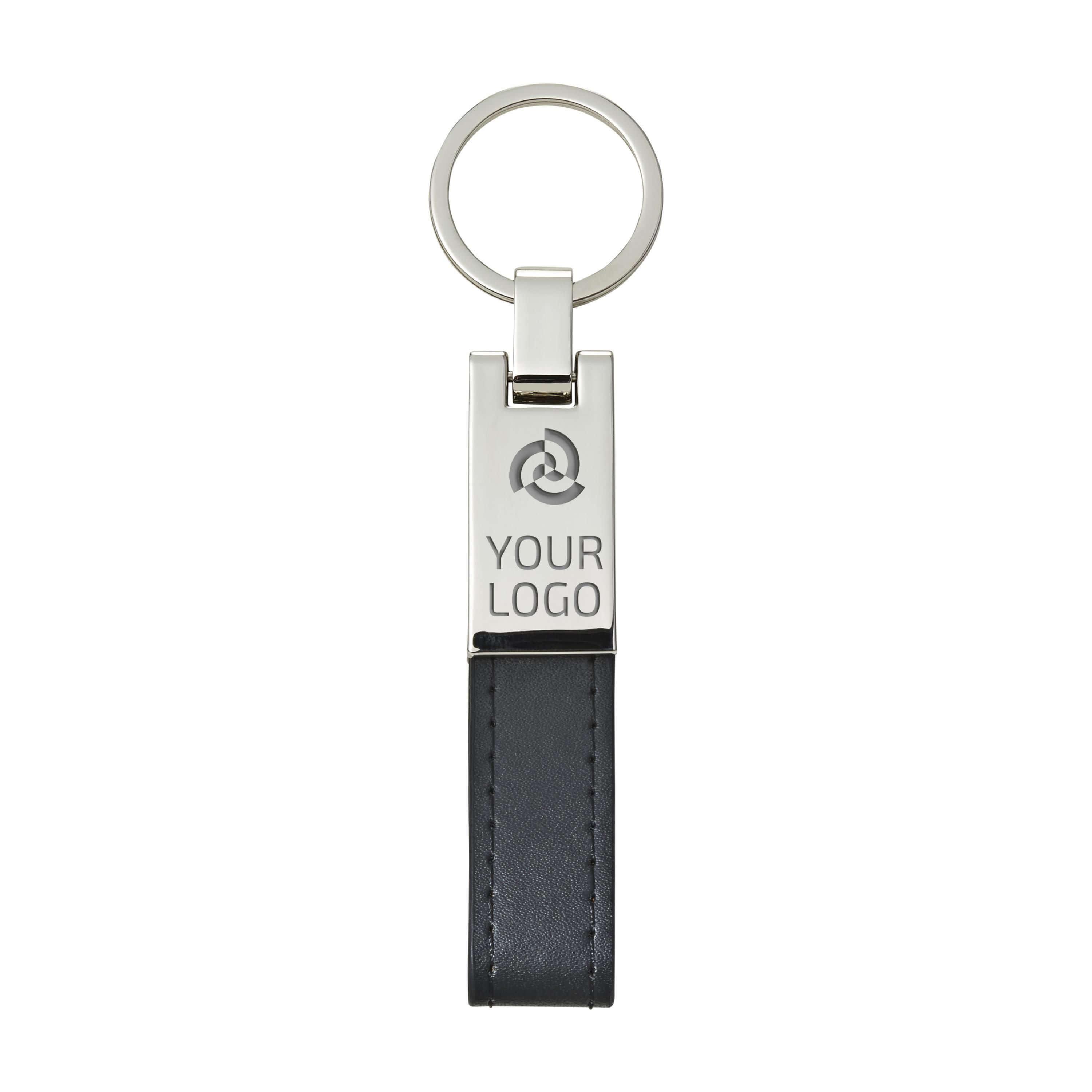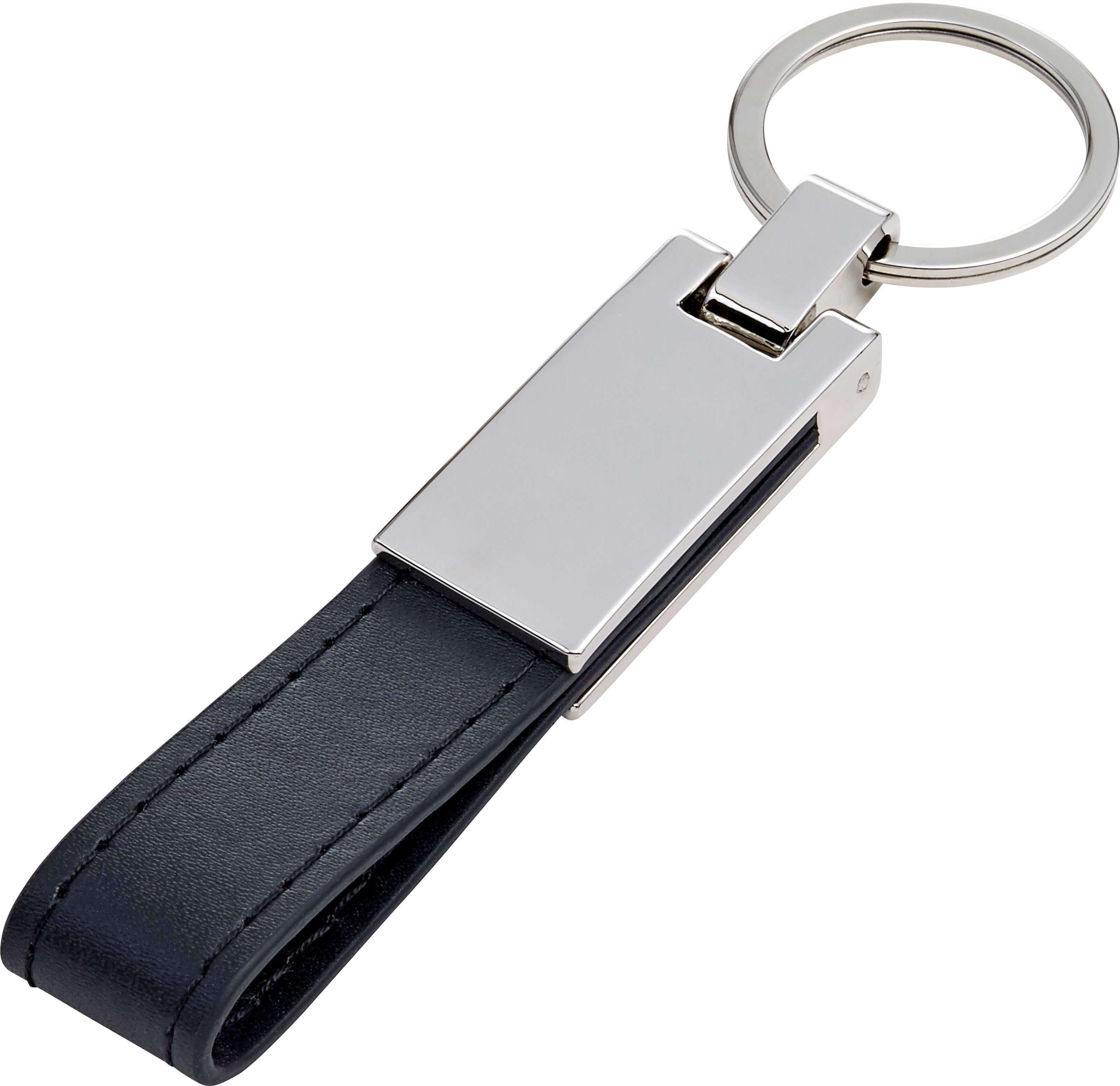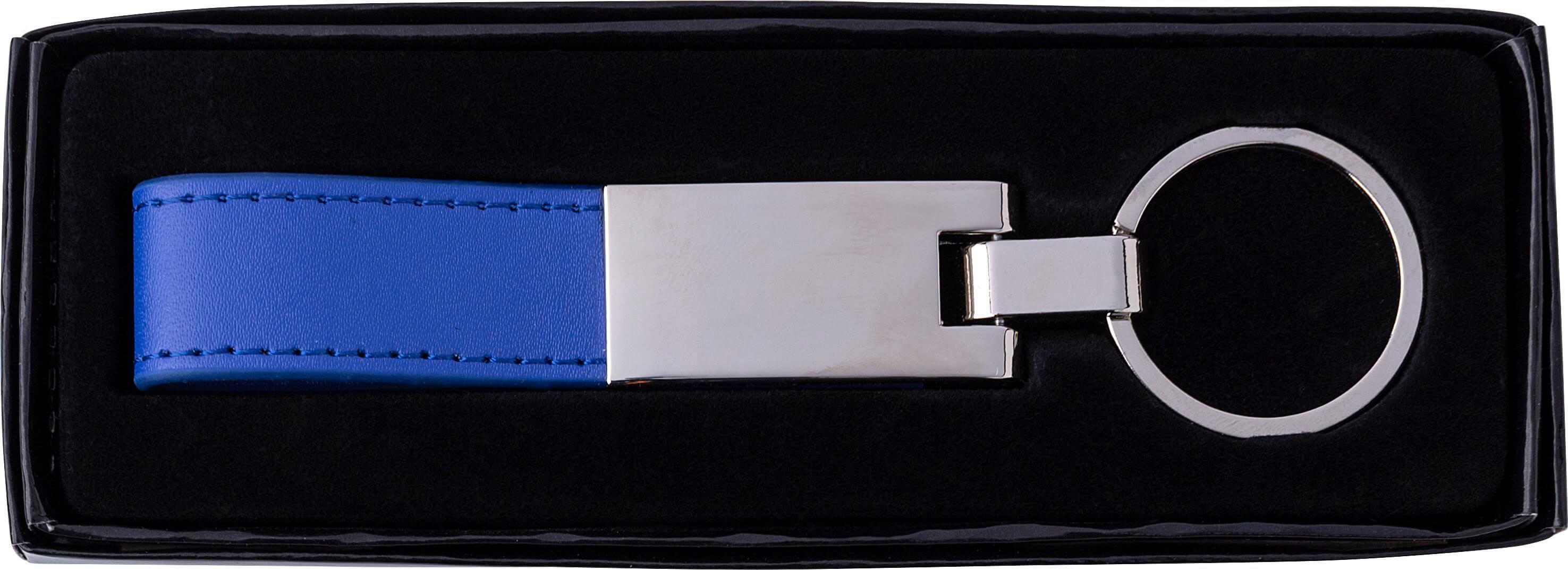 Porta-chaves em aço com revestimento em prata, com fita em PU. Apresentado em caixa de oferta preta.