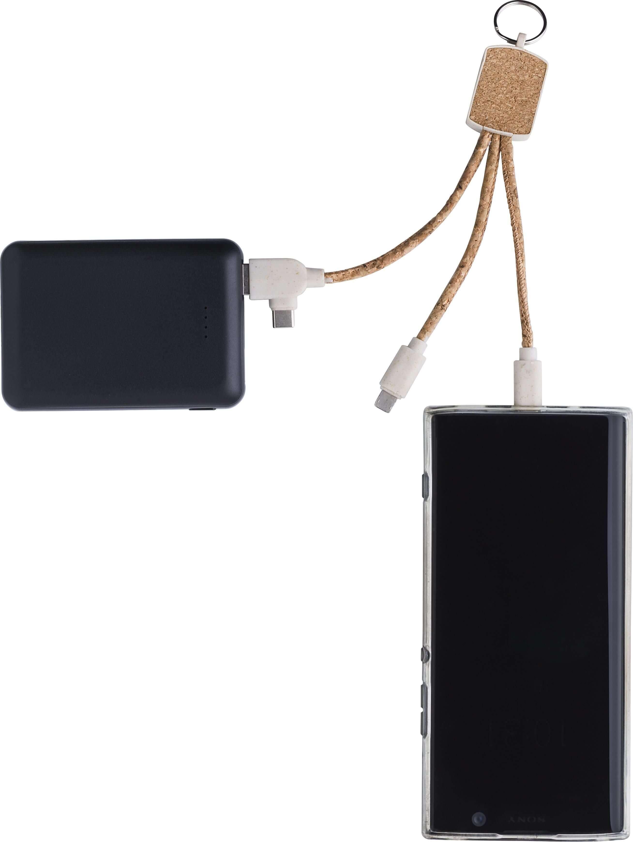Porta-chaves em aço inoxidável com cabo de carregamento. Cabo de cortiça e tomadas em palha de trigo. 3 cabos, um USB-A/C, um lightning, um USB-C. Embalados individualmente numa bolsa de cartão castanha.