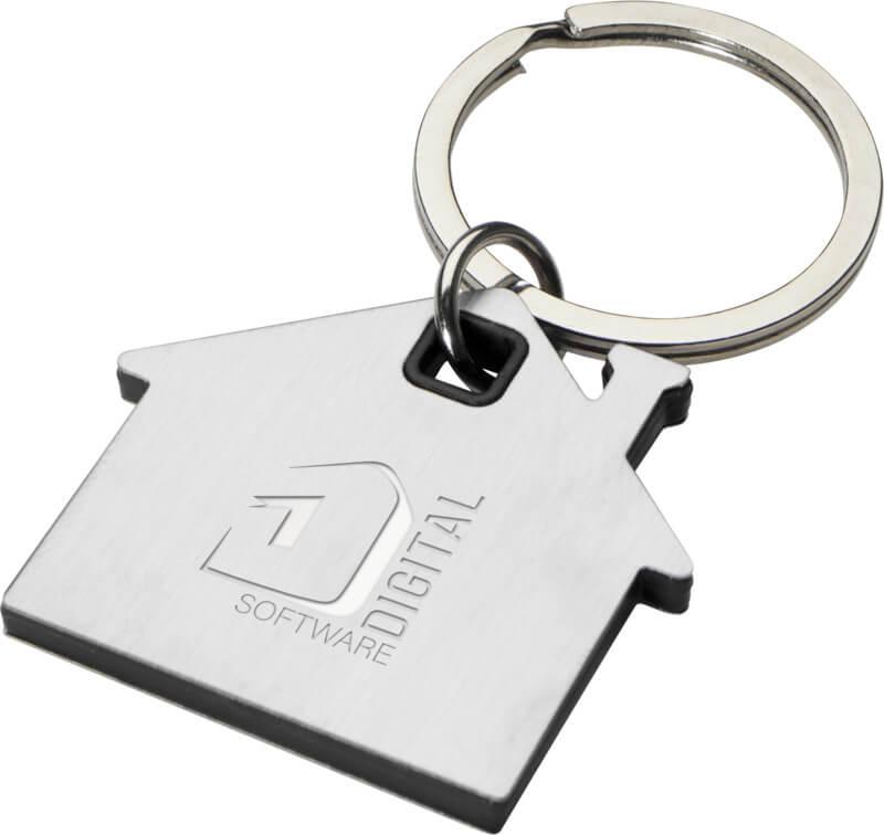 Porta-chaves em forma de casa com placa de aço inoxidável com design fosco na parte da frente e de trás, e um chip de plástico colorido no meio.
