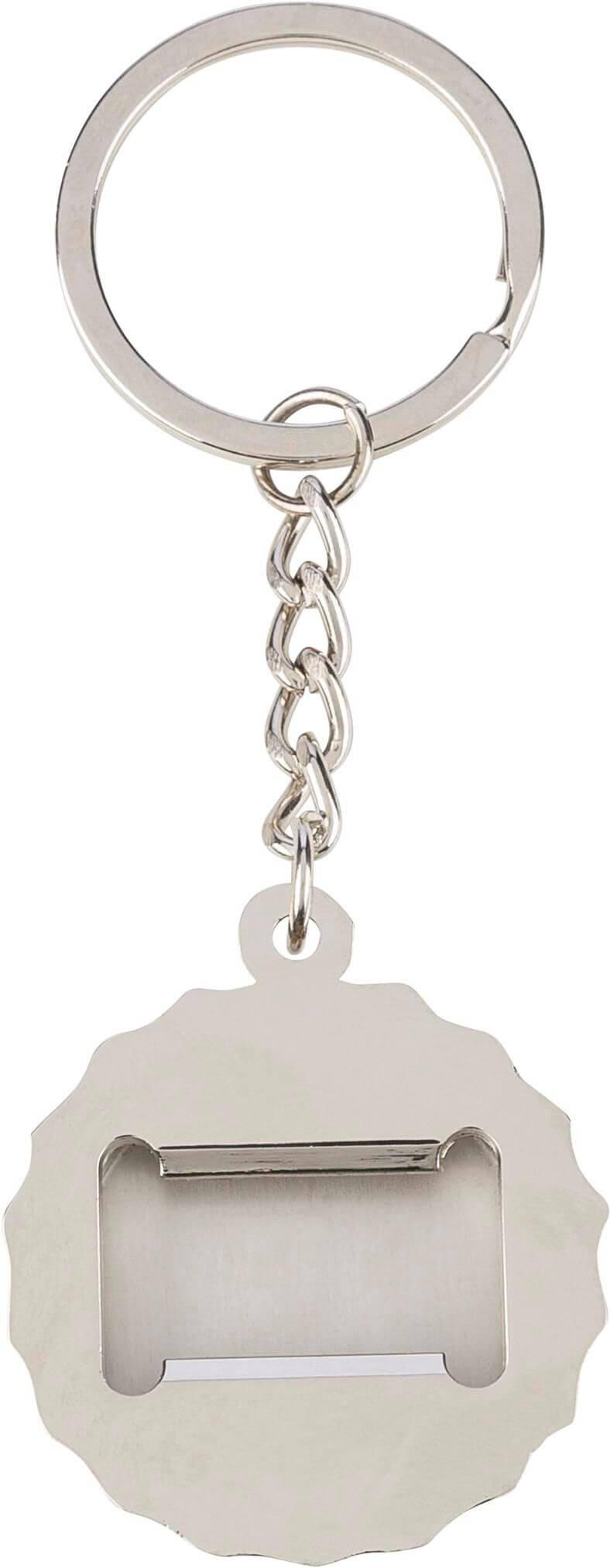 Porta-chaves em liga de zinco com incrustação de bambu na parte da frente e abre-garrafas integrado na parte de trás. Possui um anel de metal para chaves e é embalado num saco de papel.