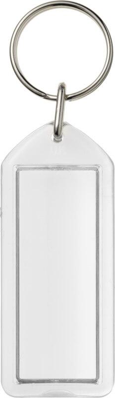 Porta-chaves transparente retangular F1 com argola em metal. Este porta-chaves pode ser reaberto com uma moeda. A argola de metal oferece um perfil liso que é ideal para envio pelo correio. Dimensões do papel impresso: 5,0 cm, x 2,0 cm.