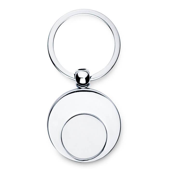 Porta-chaves metálico redondo com ficha para carro de supermercado.