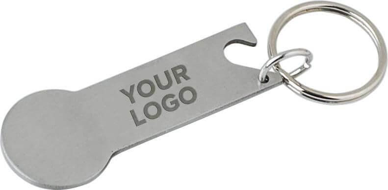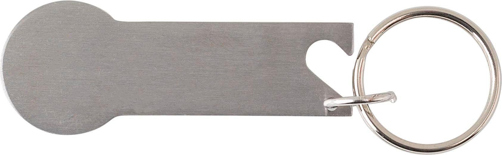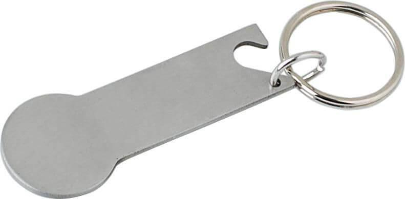 Porta-chaves multifunções em aço inoxidável com moeda de carrinho de compras e abre-garrafas. Apresentado em polybag.